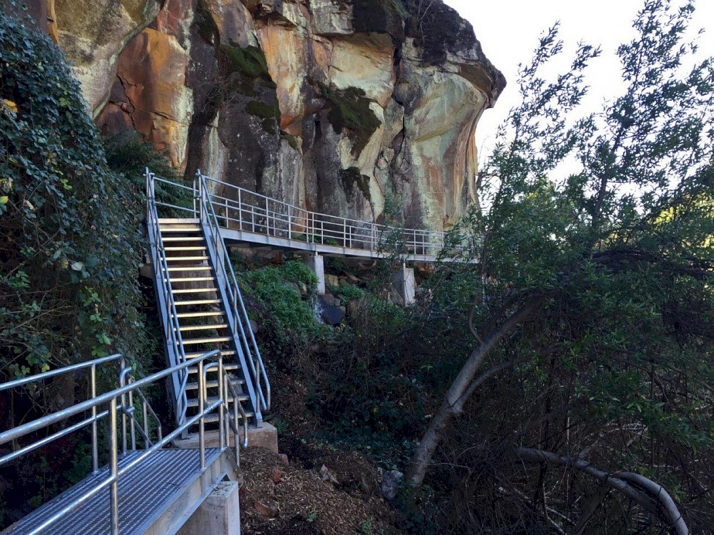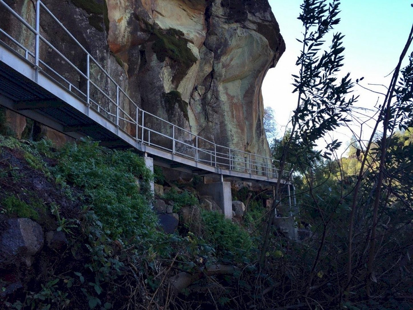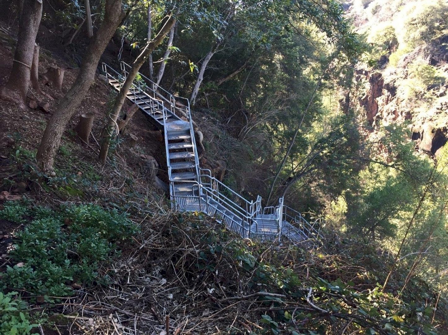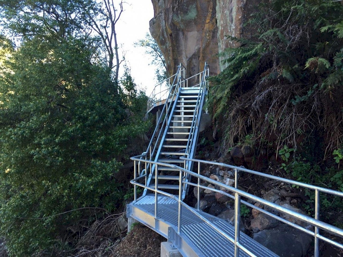 The 18 tons of steel were fabricated into custom walkways to access the very remote Eagle Canyon. Pacific Gas & Electric commissioned the work to serve their very special needs but ended up with the walkways serving a use they initially were not aware of. The walkways were designed to allow PG&E personnel access to check on equipment that is in service at the bottom of the canyon. The walkways, with permission of the owner, have also allowed environmental naturalists entry into a formerly undiscovered habitat where a rare freshwater fish known as the Silver Salmon makes its home.