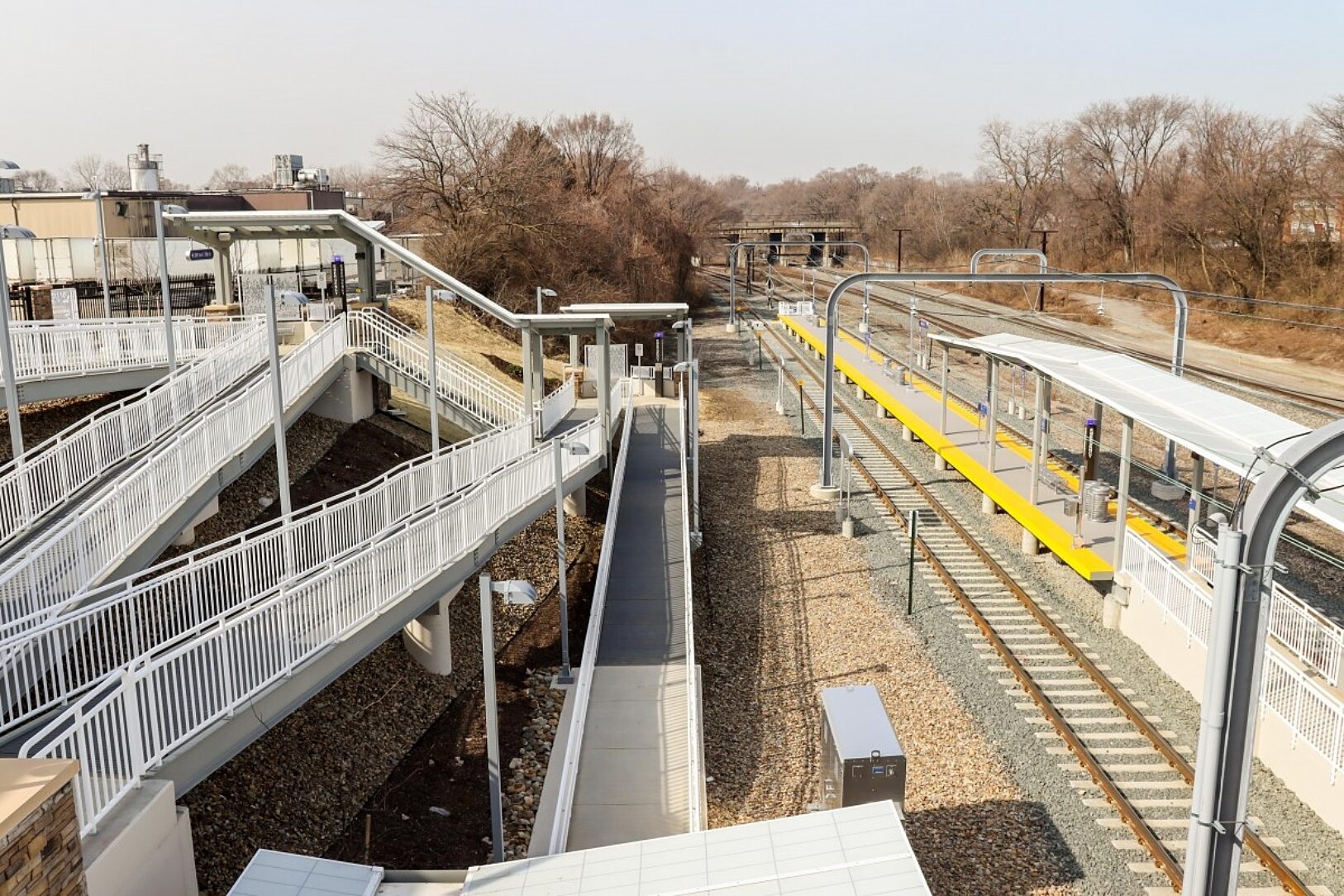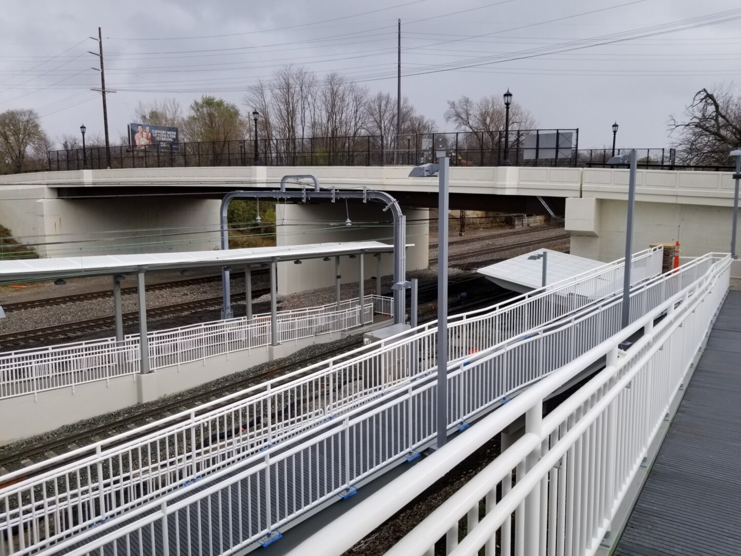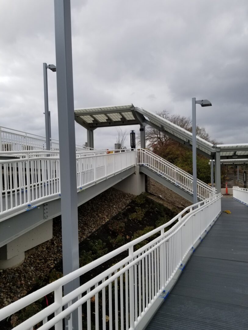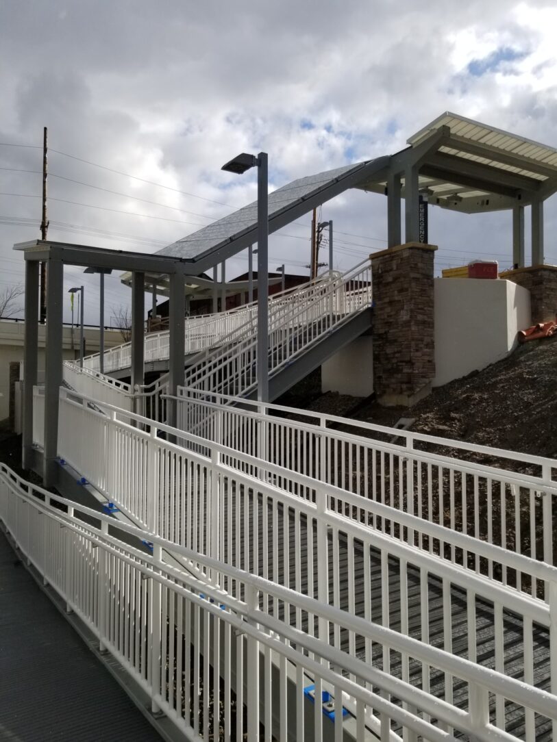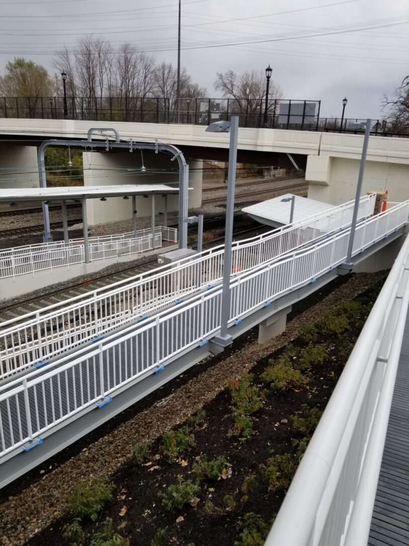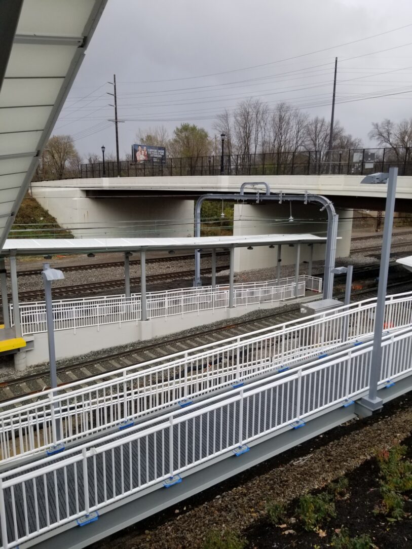 The East 79th Street Station located in Cleveland, Ohio is the last key station to be constructed in compliance with the American With Disabilities Act (ADA). The total cost of this project is 10 million. RTA engineers designed the station, and Panzica Construction is the lead contractor. The RTA project was fabricated by Nova Structural Steel located in Cleveland, Ohio. The unique design calls for access to the station through a series of ramps and stair structures down the existing hillside. The track crossing will be protected by railroad gate, flashing lights and audible bells.
