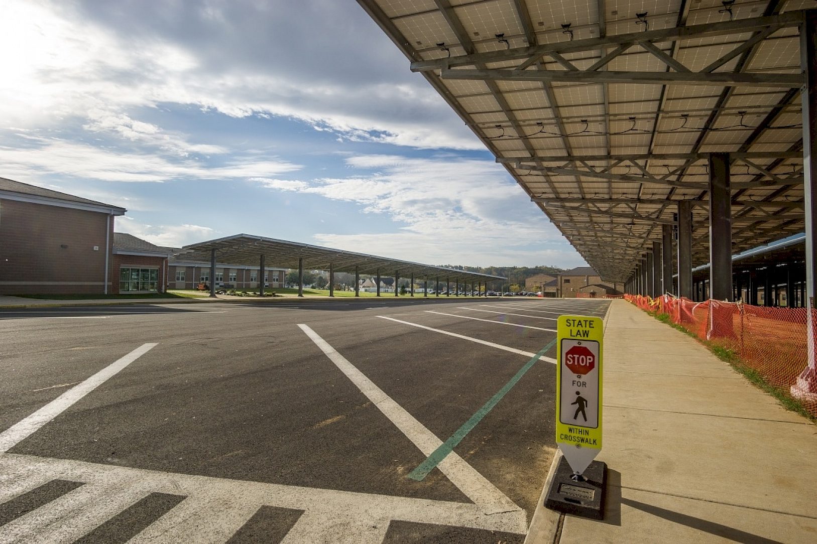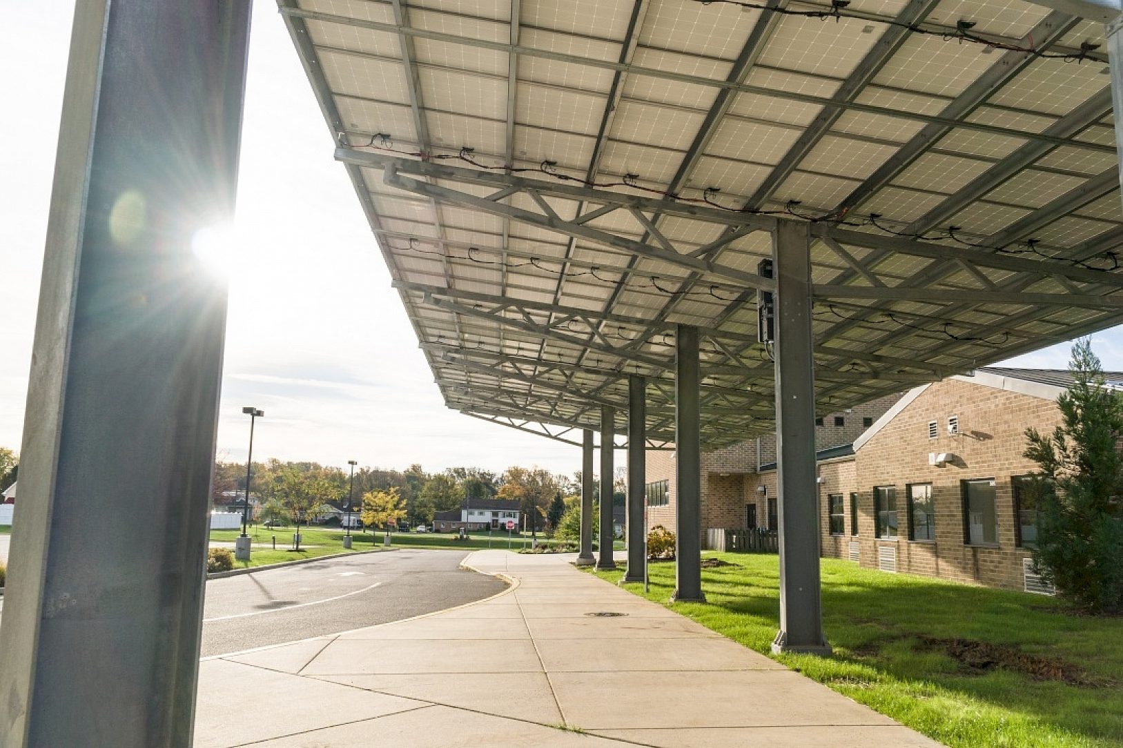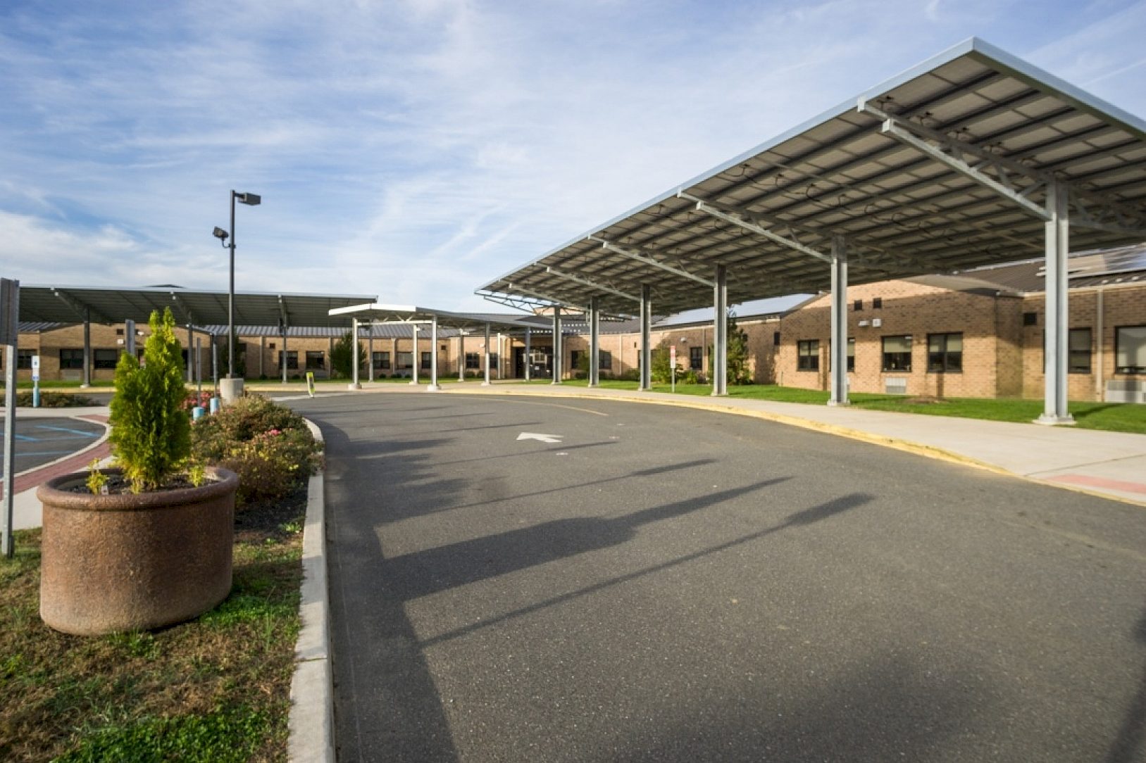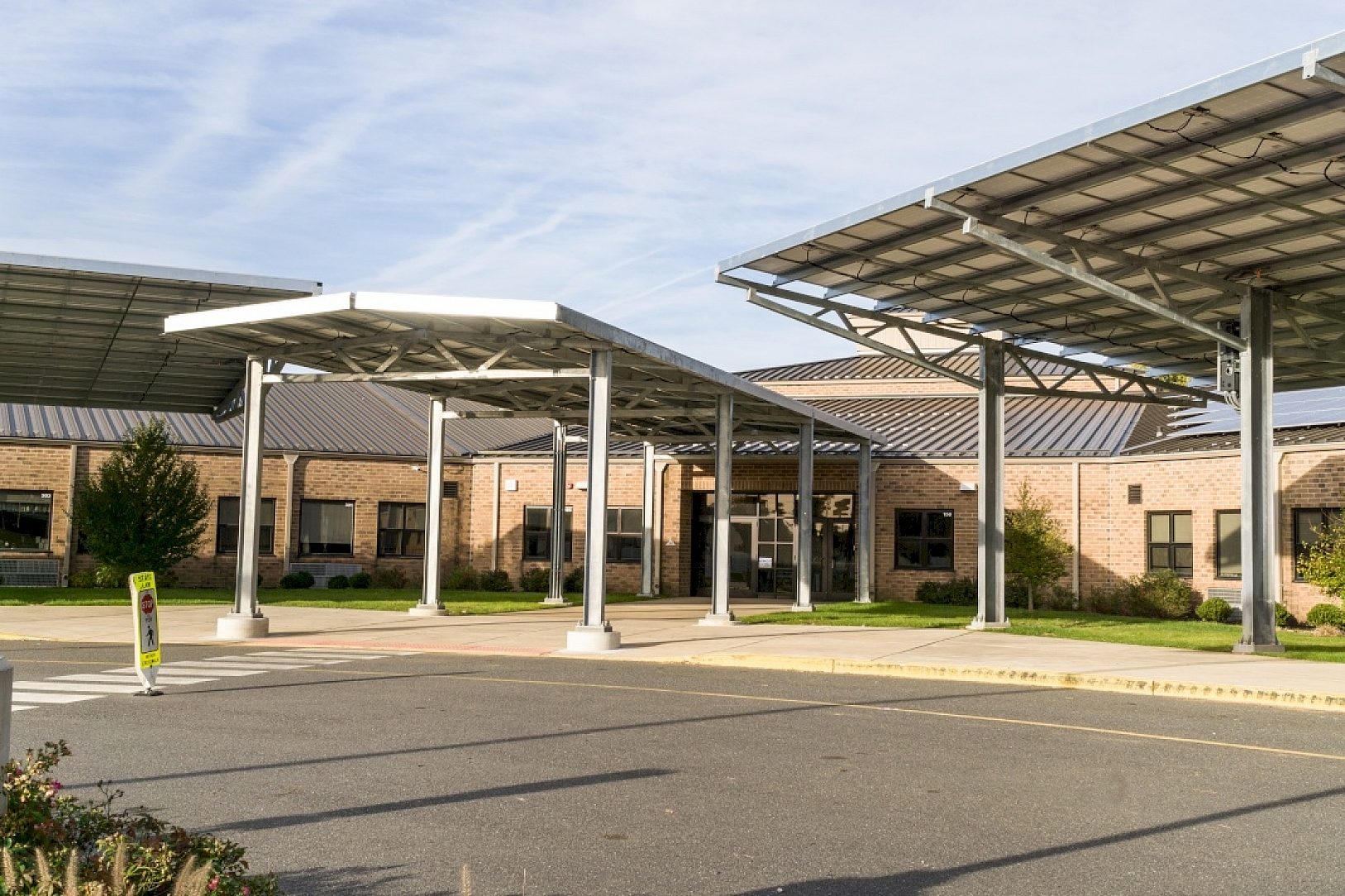 The East Greenwich Township School District pushed forward with their plan to produce their own electricity with a 1.7 Megawatt Solar Carport field located at the Mickle and Clark Schools. The solar array consists of 5,152 solar panels, all of which are supported by galvanized steel. With available ground being scarce in New Jersey, the District was fortunate enough to have enough space to allow for the solar carports. However, the solar carports needed to work in conjunction with their current parking lot and sidewalk configurations so as not to waste any precious space. This created some design challenges that needed to be overcome.