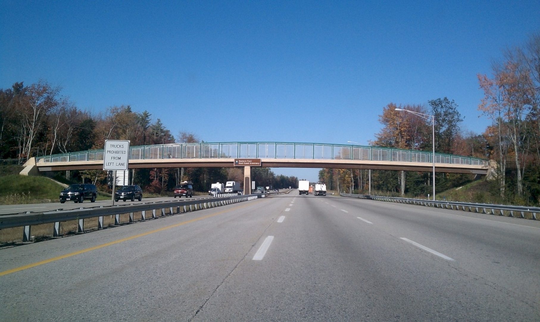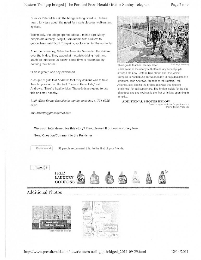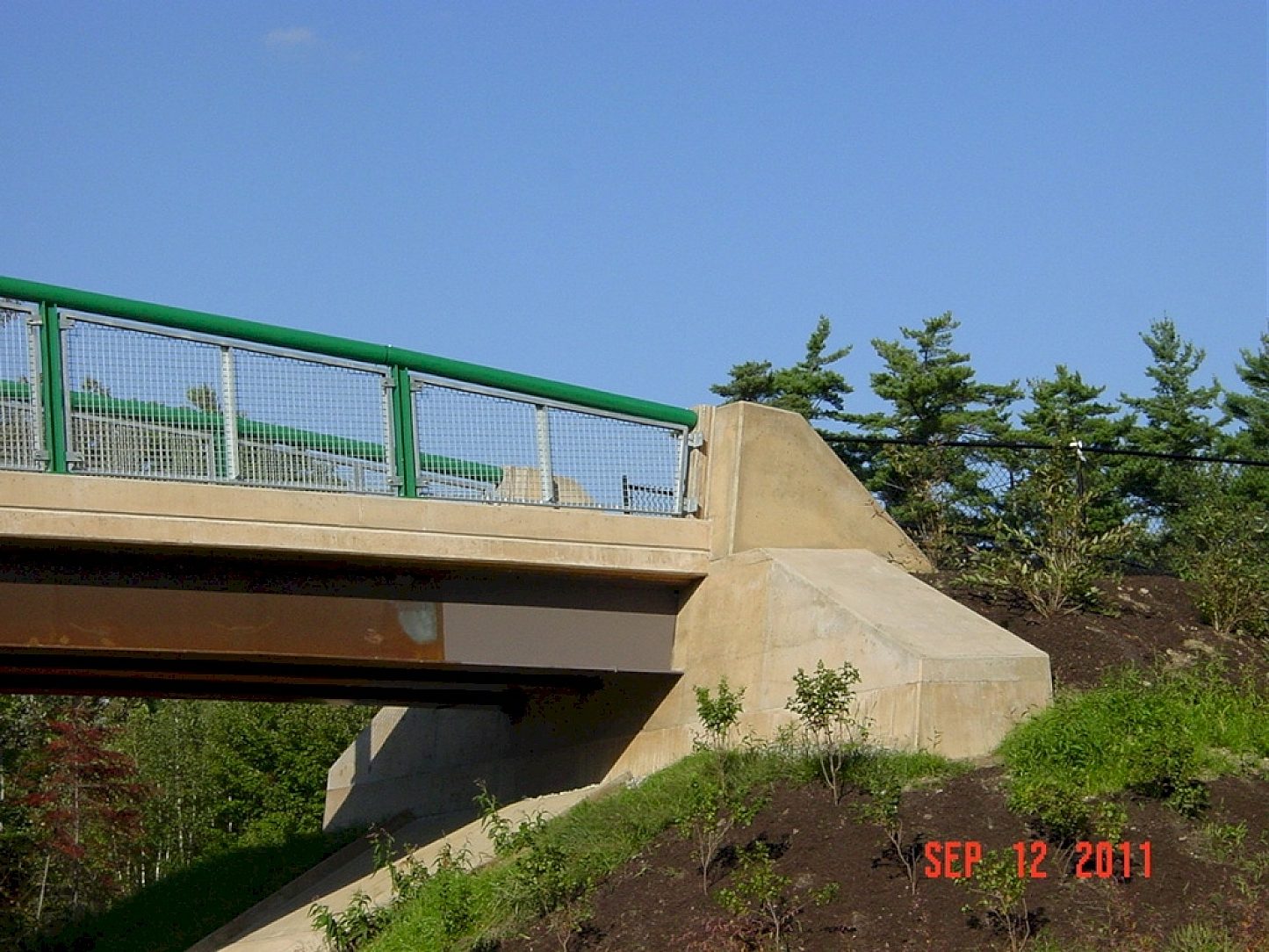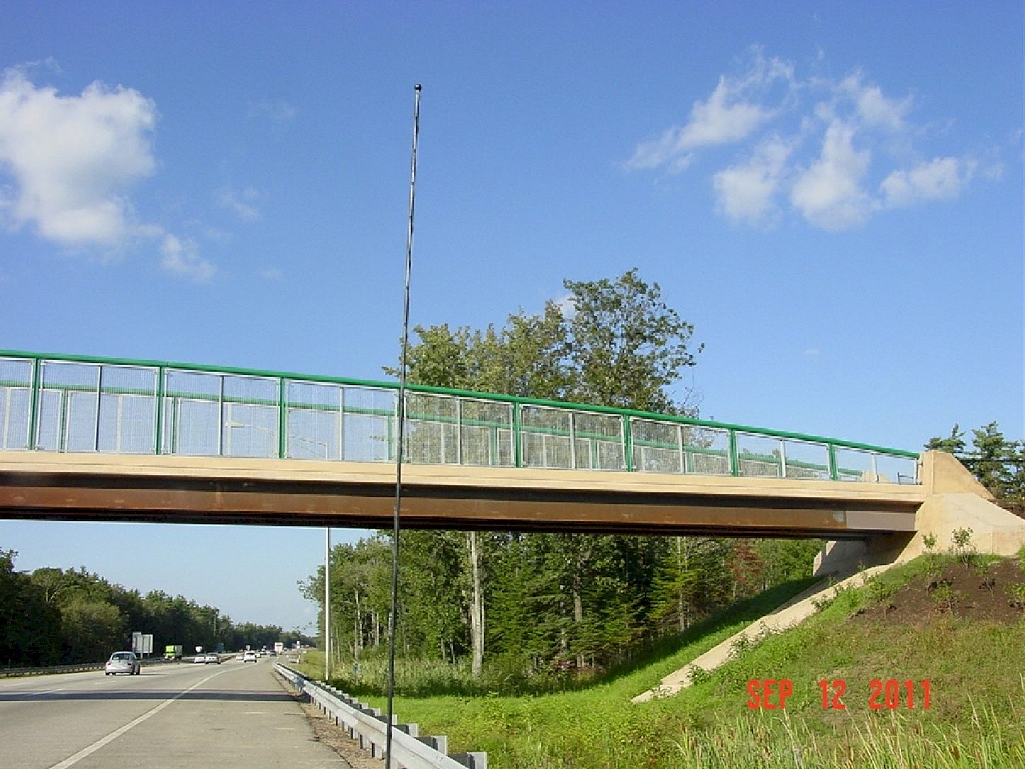 This is a pedestrian bridge that goes from a public park to an elementary school across the Maine Turnpike and enables the school children to go between the school and the playground safely.
