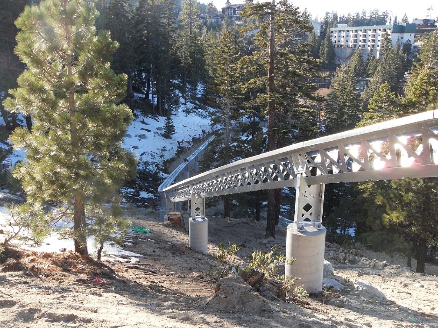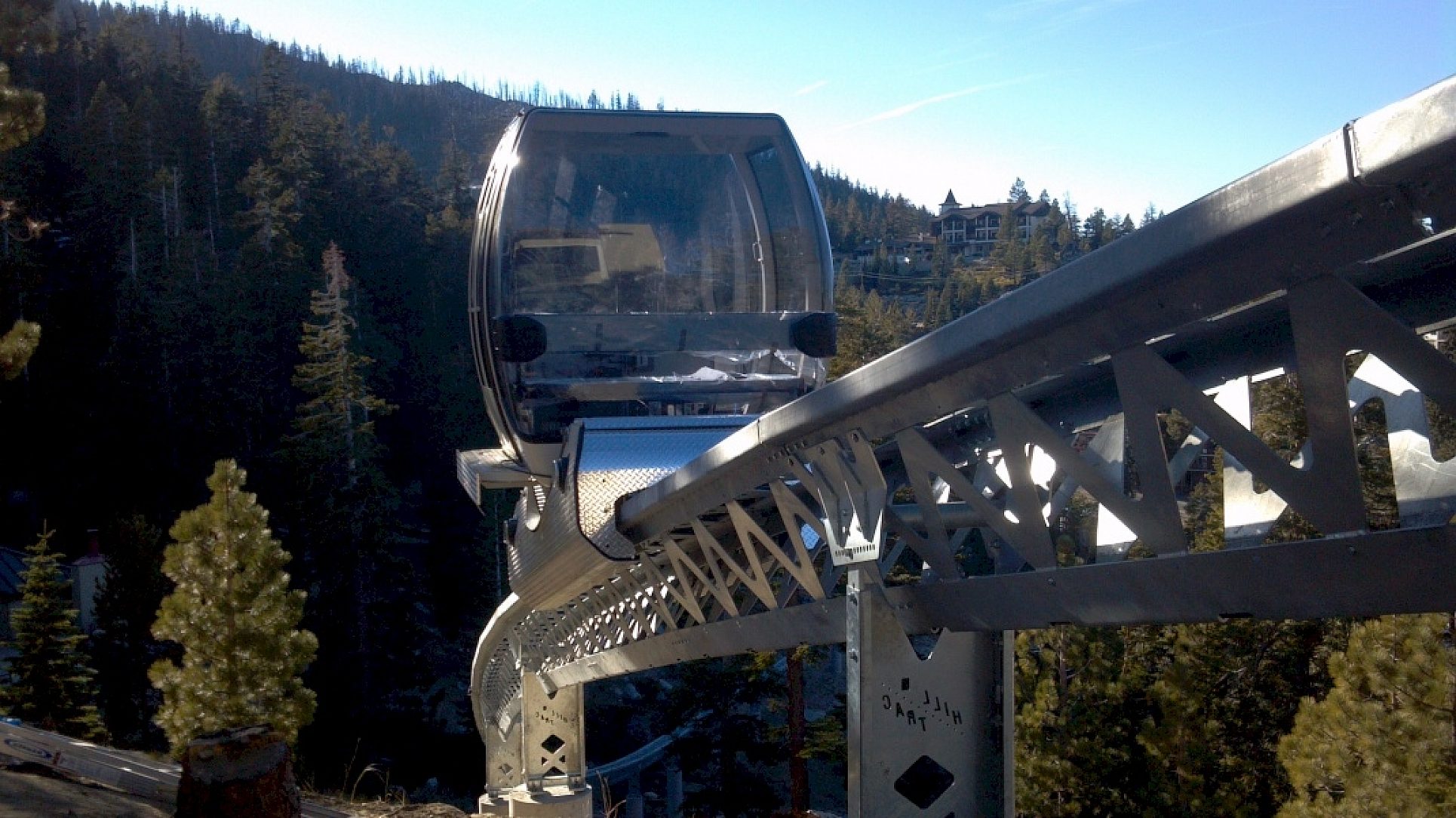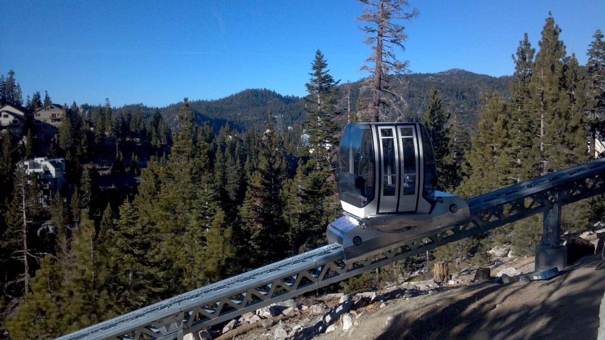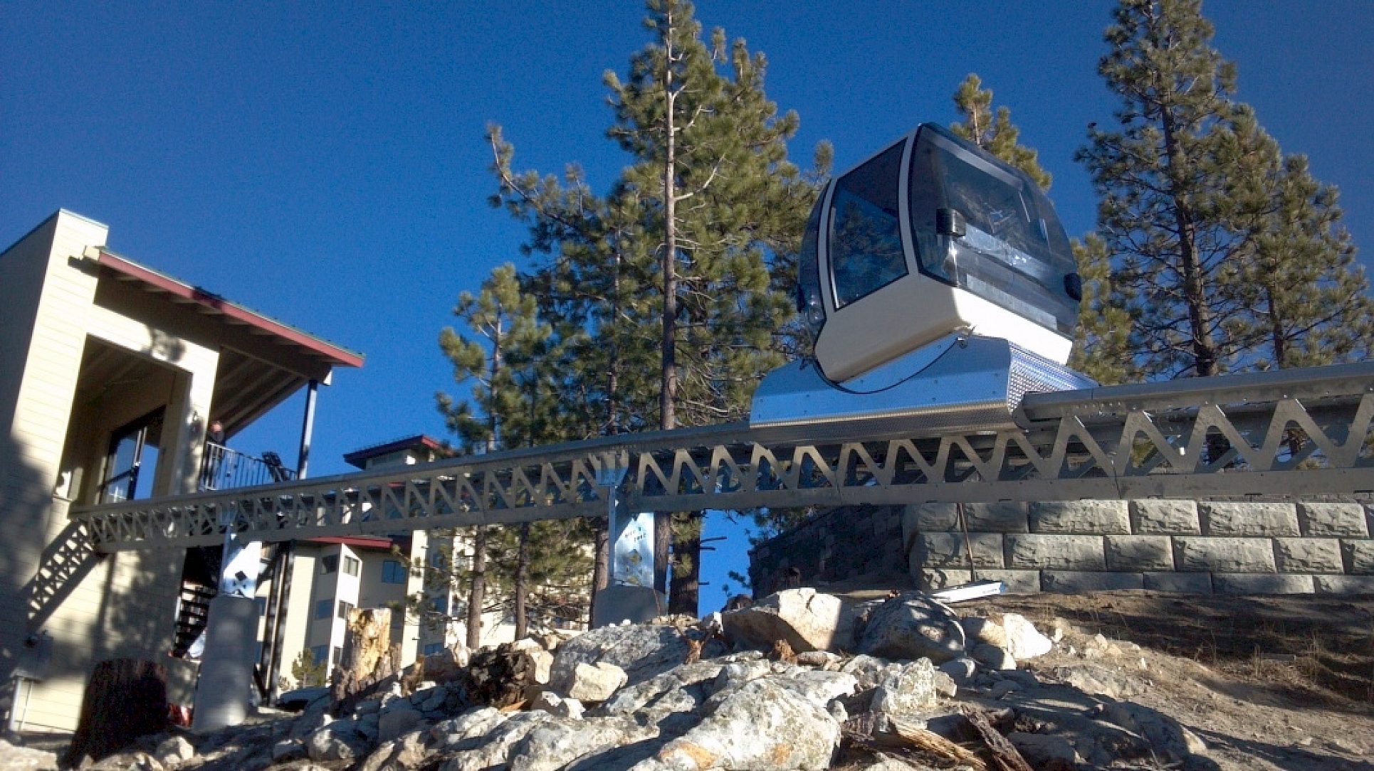 The Electric Vehicle Rail Tramway was built to take passengers staying at the Ridge Resort to the popular scenic Heavenly Mountain Resort located on the California-Nevada border in South Lake Tahoe. The ski resort has the highest elevation of the Lake Tahoe area resorts with a peak elevation of 10,067 ft. It has 97 runs and 29 lifts between California and Nevada. Visitors can enjoy a majestic view of snow covered mountains overlooking the sapphire-blue waters of Lake Tahoe. When the snow melts, the resort offers a variety of summer activities such as hiking, biking, mountain biking, back-packing, kayaking, fishing, rock climbing and water skiing. This tramway is located just steps away from the Ridge Clubhouse at the Ridge Resort in South Lake Tahoe, Nevada. It seats 8 passengers and operates between The Ridge Resort and Heavenly Mountain Resort. The tramway transports passengers along an 865 foot hot-dip galvanized (HDG) track through varied terrain to their final destination in just 2 minutes and 30 seconds.