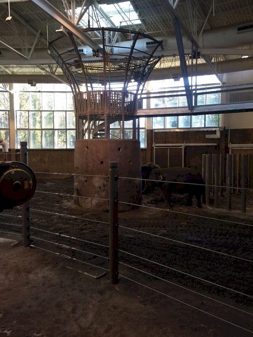 The feeding tower in the center of the Forest Hall offers the asian elephants a place to exercise their curiosity by exploring surprises hidden in small holes. The spiral staircase in the center of the tower and the radiused cage at the top of the tower were galvanized for corrosion protection due to the corrosive environment and exposure to elephant traffic. The 14,000 square foot barn encompasses a complex system of stalls, gates and chutes to safely hold, treat, and care for the wonderful Asian elephants. The $57 million Elephant Lands is a cutting edge project and serves as a model for other zoos to follow.
