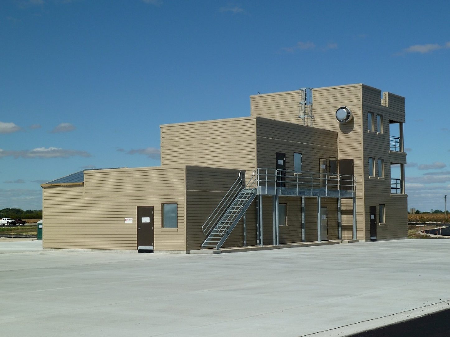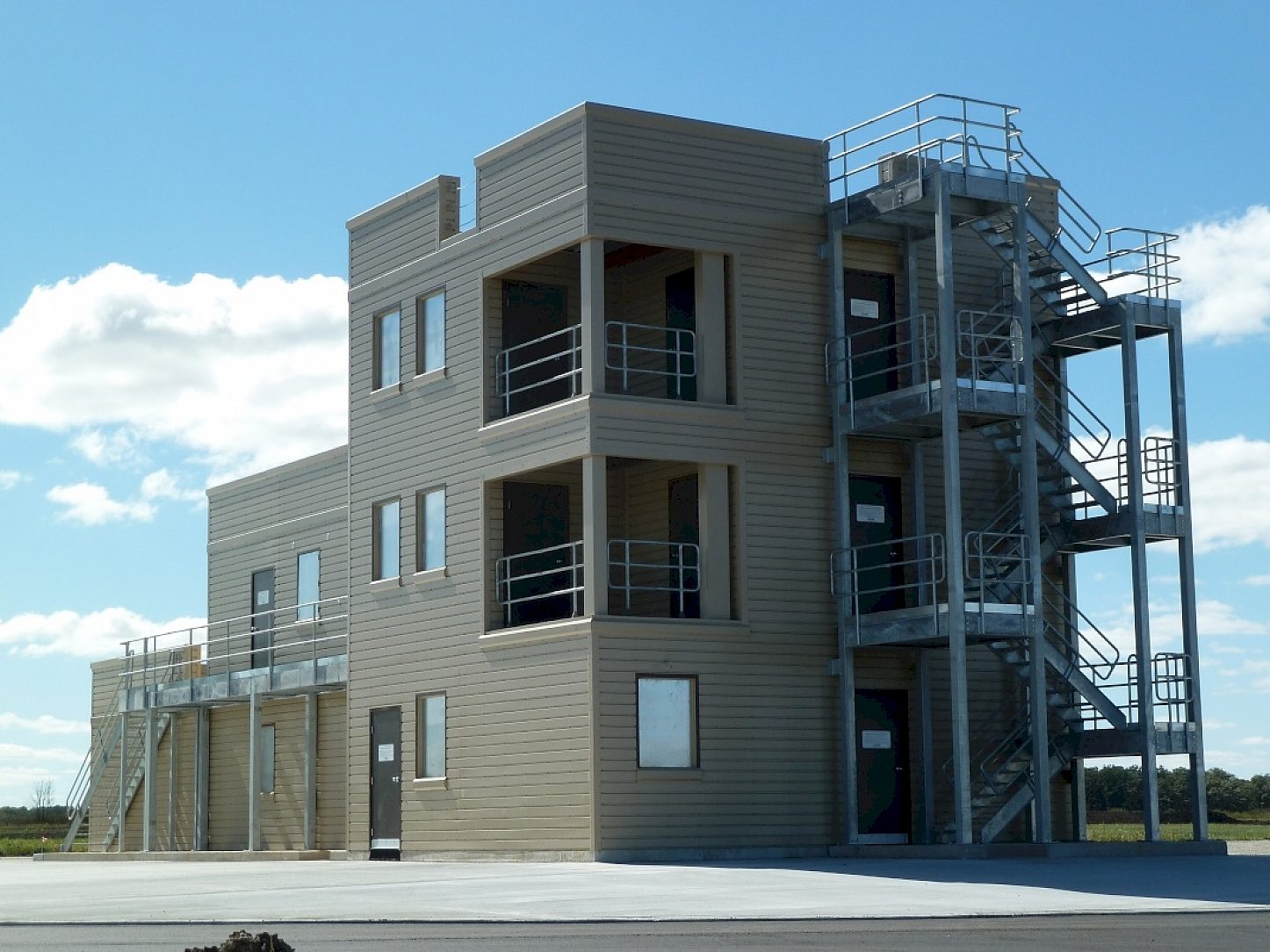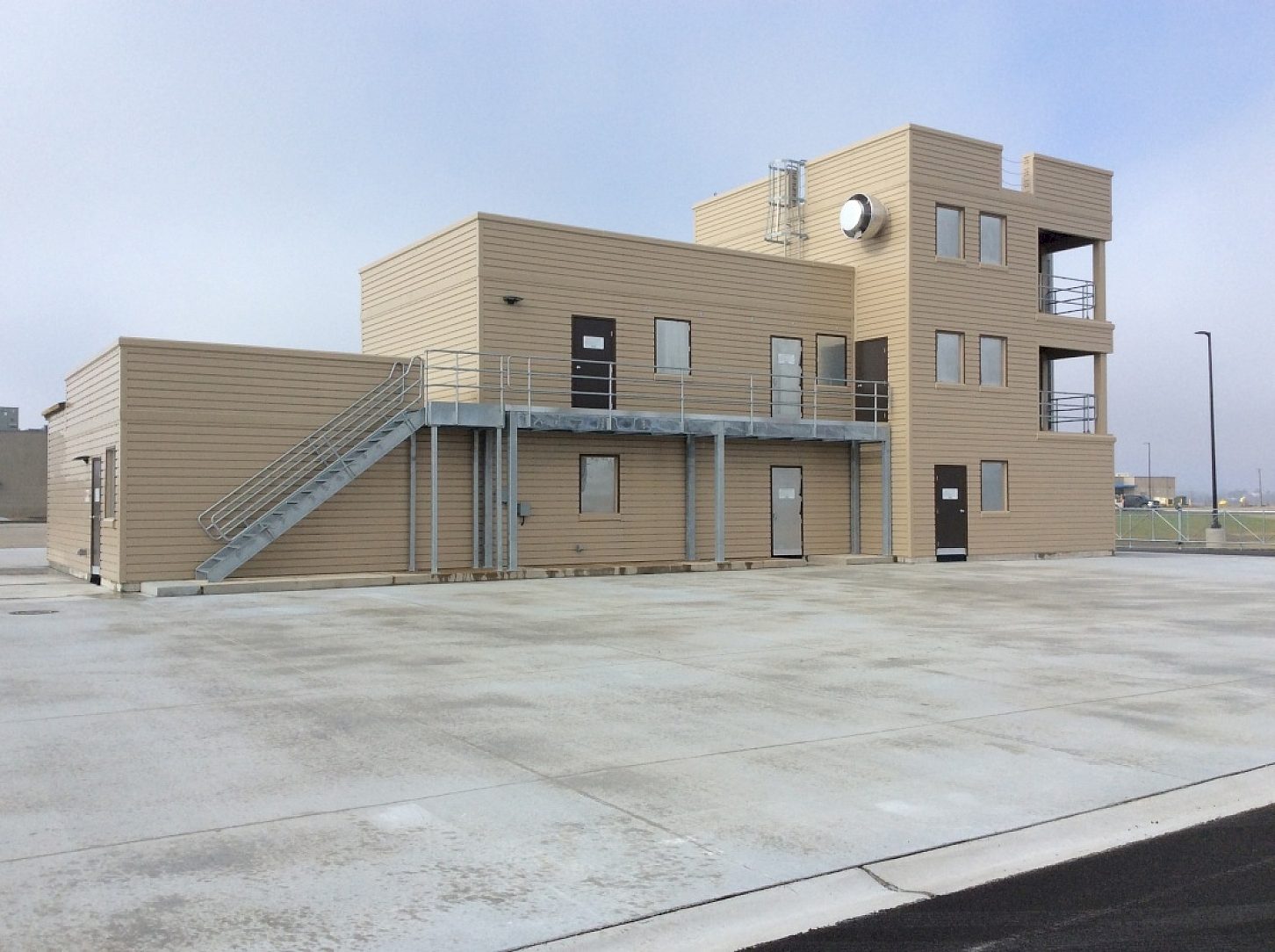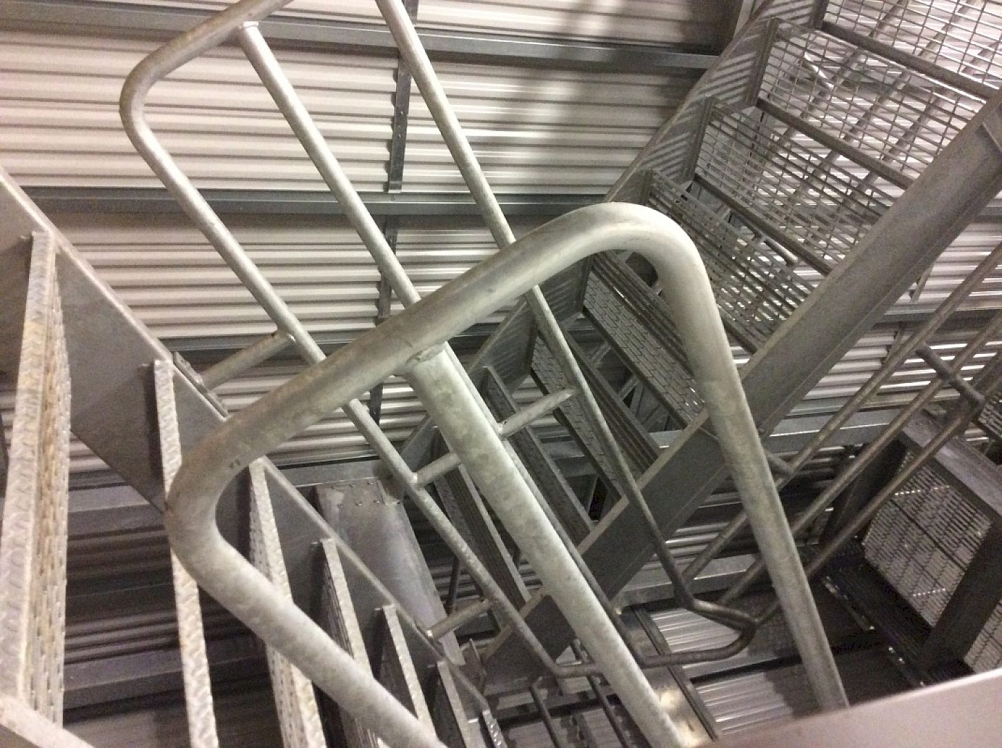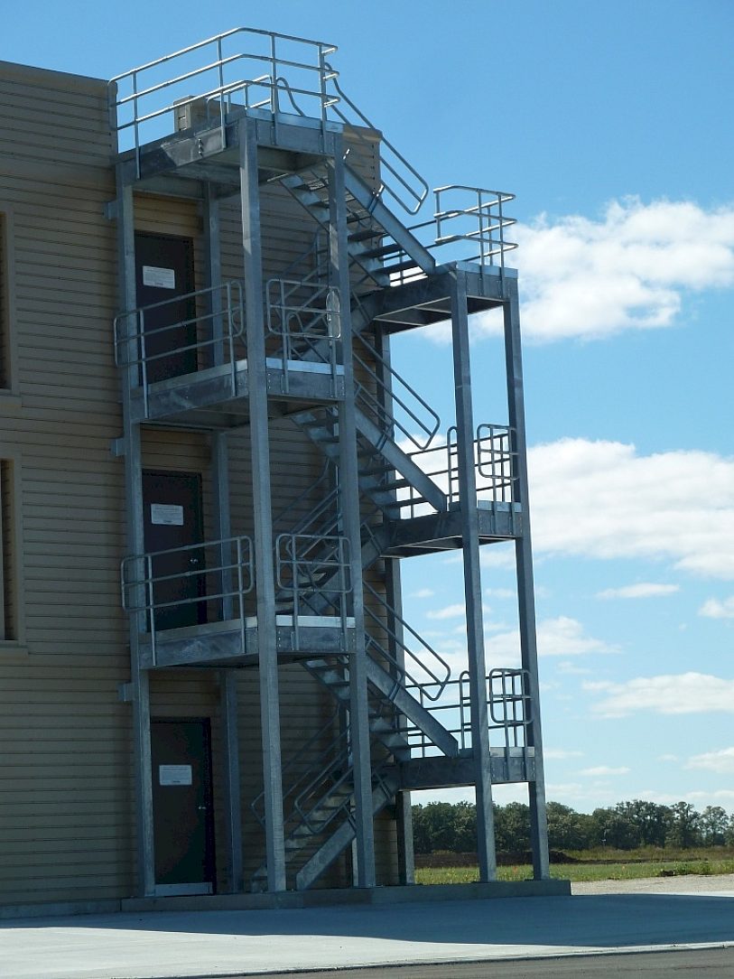 Elgin Community College, in conjunction with Fire Facilities, designed this three-story steel fire training tower. The majority of steel in this building has been hot-dip galvanized. The amount of water that firemen will be pumping into this building over the next 75 to 80 years will have no effect on the structure due to the zinc coating (3.5 mils) that is protecting the interior walls, stairs, handrails, grating and decks.
