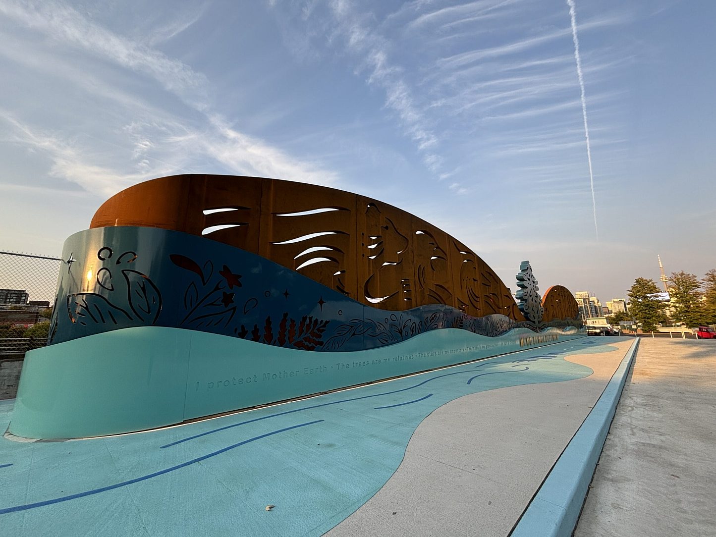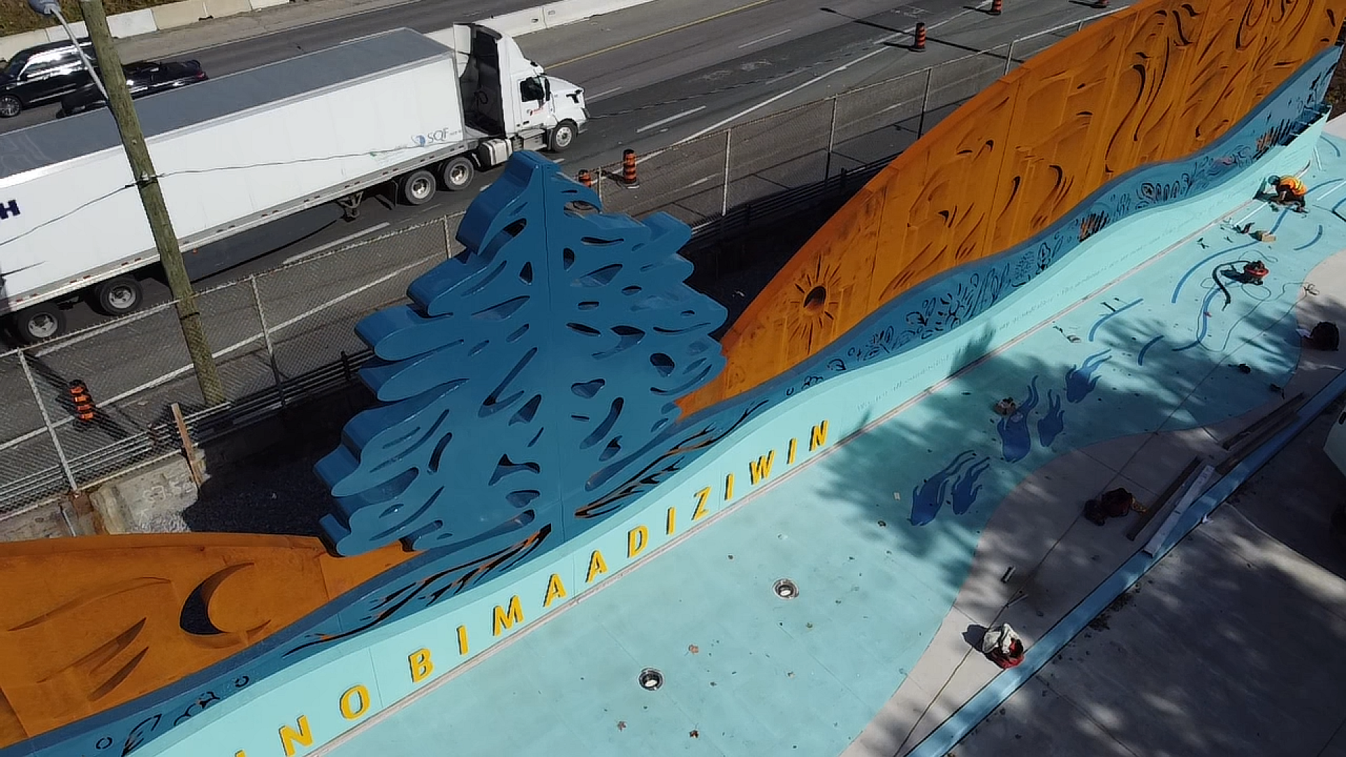 One of their outdoors venues was plagued by the constant din of traffic of the very busy and very large urban boulevard immediately adjacent. The solution was some kind of sound barrier, but one that was pleasing and artistic. The second issue was that Exhibition Place had a mandate to advance the visual presence of pre-European culture in their architecture. These two objectives meshed nicely in a largescale artwork called “Mino Bimaadiziwin.”
