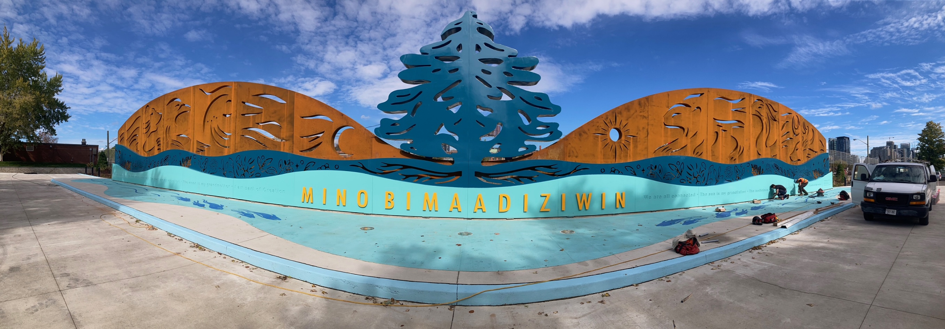 Mino Bimaadiziwin is a life philosophy from native tribes of the area that can be loosely translated into, “Living The Good life,” a way of living in your culture and in your environment. The artists envisioned this in a steel façade that touched on the seven cornerstones of this philosophy. But, how to assure a long and trouble-free service life for this vision? The bare Corten steel creating the sky portion was self evident as the natural reddish bronze hue was what was desired, but what about the portions the artists wanted to be painted blue and green?