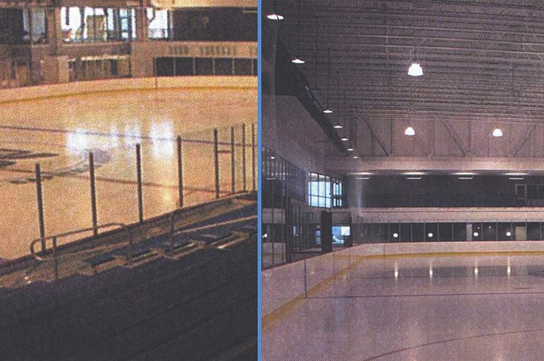 Renovation of the 80-year-old Expocite sport stadium in Quebec required a great deal of planning and environmental consideration, not to mention the removal of existing interior structural columns preventing the installation of a hockey rink. The columns were obstructing sightlines for spectators, and the engineers decided the solution was to install external trusses to support the roof from above. The tops of the old columns were used to tie in the new ones, which penetrated the roof to catch the new trusses.