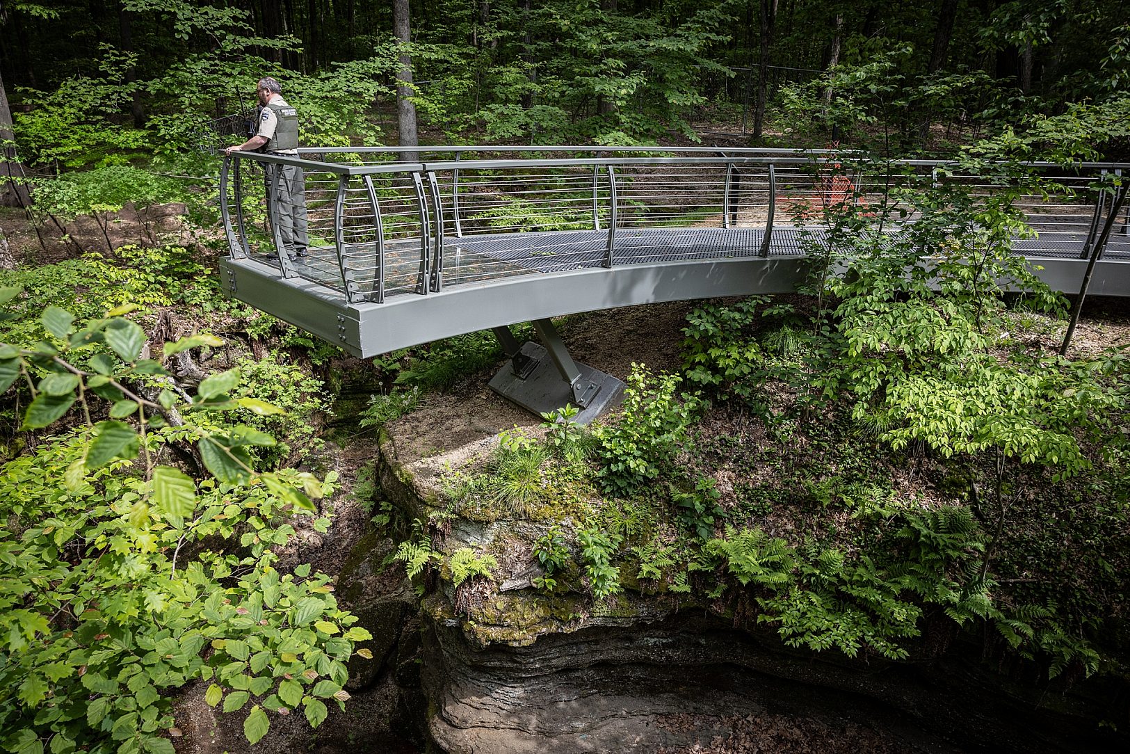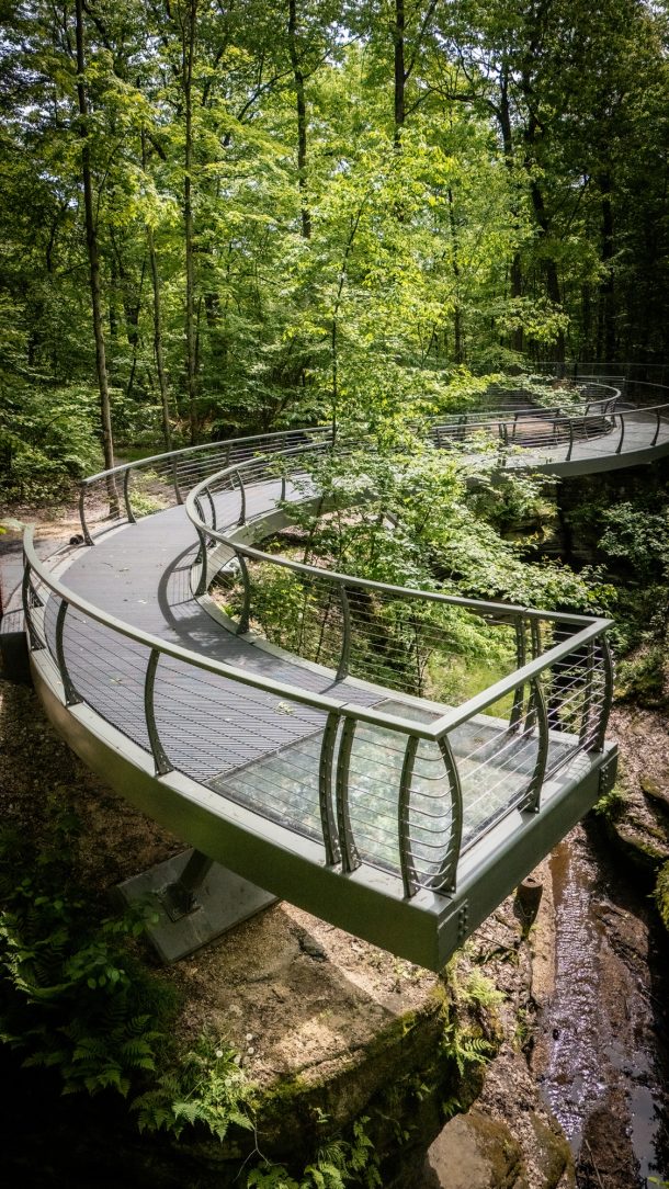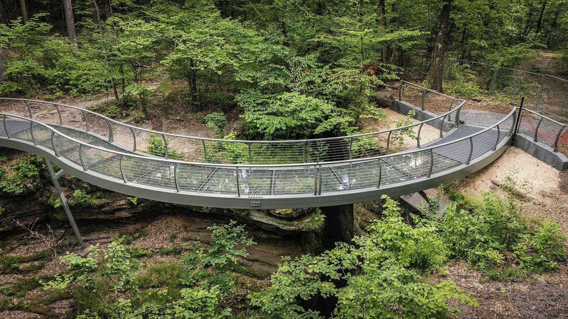 Spanning 167 acres of dramatic geological wonders, Nelson-Kennedy Ledges State Park has long captivated adventurers with its sculpted sandstone ledges, scenic gorges, and waterfalls shaped by centuries of erosion. However, surging visitor numbers posed challenges, including off-trail erosion and safety risks in this delicate terrain. In response, ODNR commissioned the Falls Edge Glass Walkway—a curving, S-shaped elevated bridge suspended 50 feet above the gorge floor, constructed over two years and a total investment of $1.68 million. The structure features transparent structural-grade glass decking for an exhilarating "walk on air" sensation, cable railings for unobstructed views, and a cantilevered overlook poised just before Minnehaha Falls.