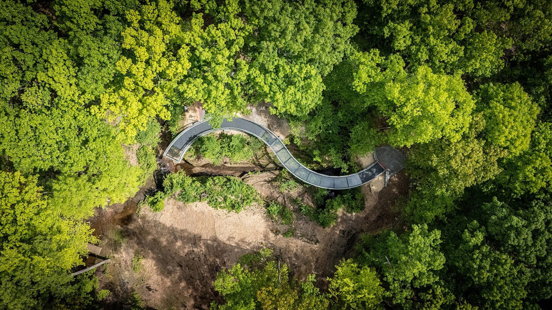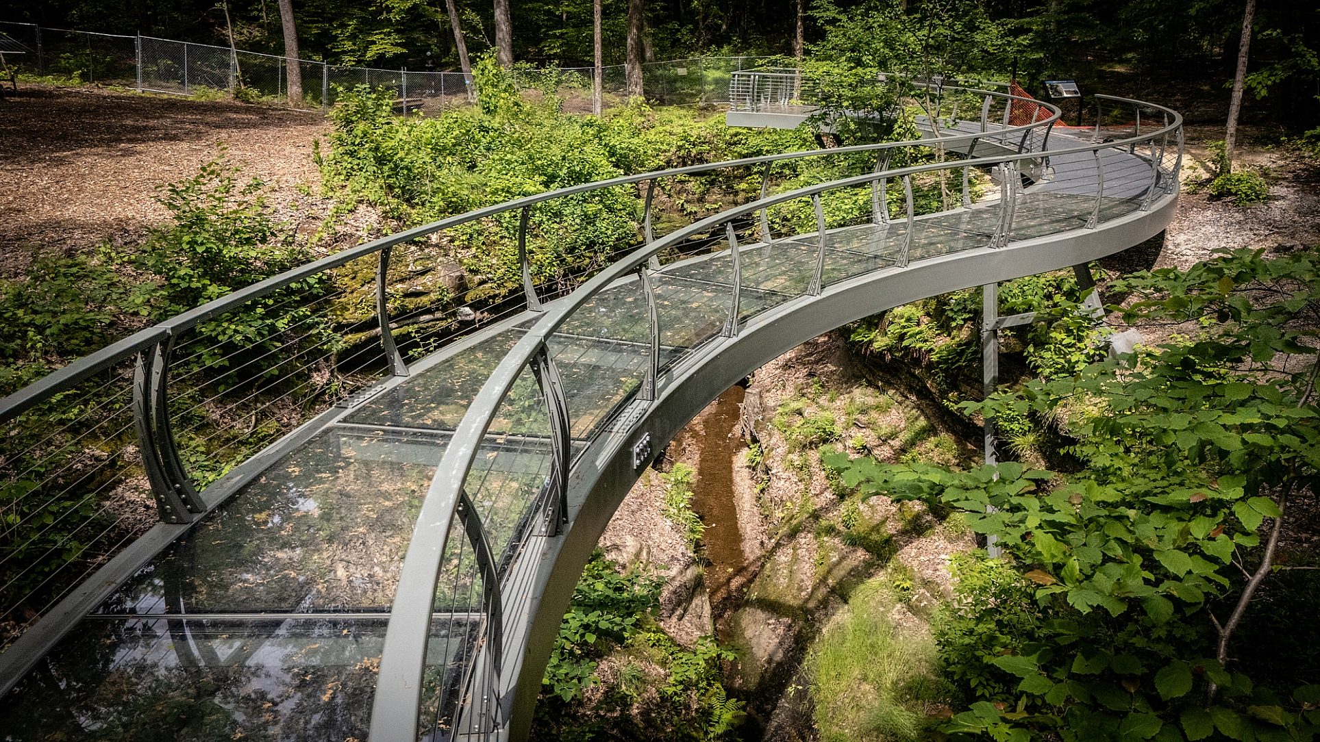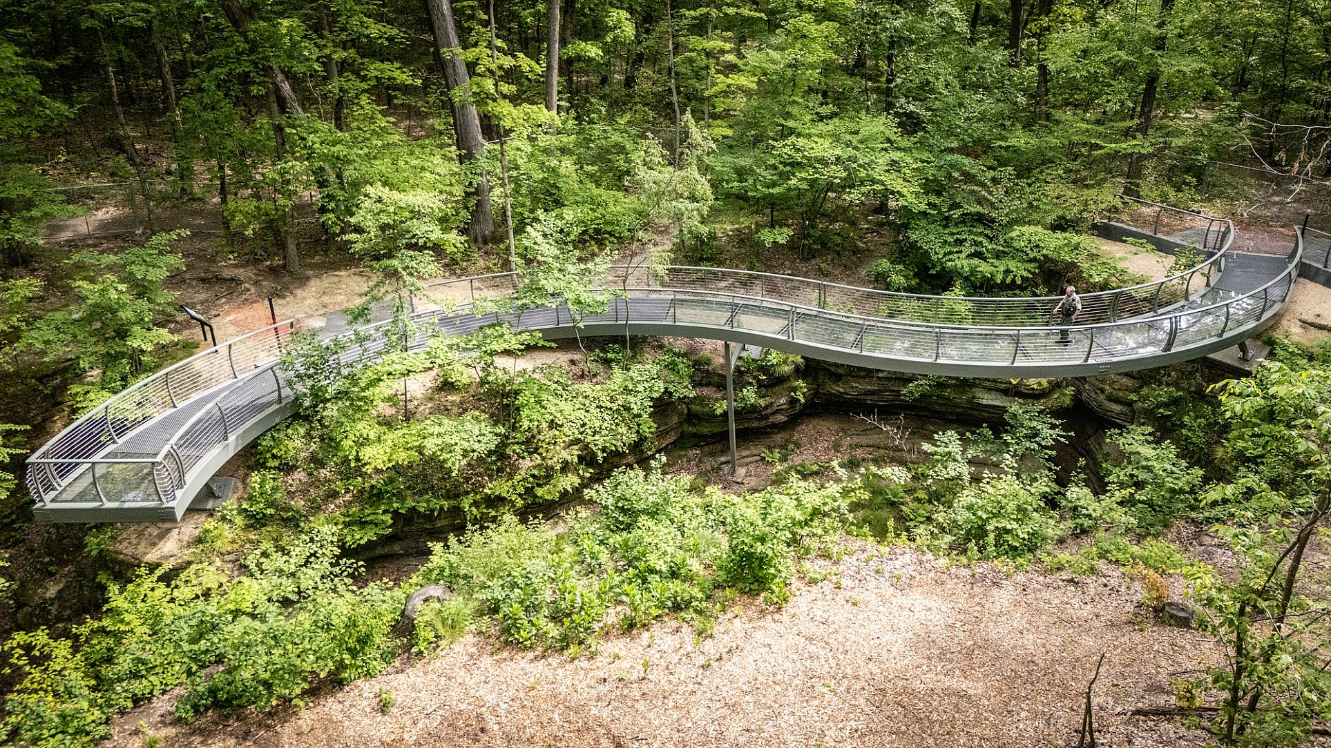 Spanning 167 acres of dramatic geological wonders, Nelson-Kennedy Ledges State Park has long captivated adventurers with its sculpted sandstone ledges, scenic gorges, and waterfalls shaped by centuries of erosion. However, surging visitor numbers posed challenges, including off-trail erosion and safety risks in this delicate terrain. In response, ODNR commissioned the Falls Edge Glass Walkway—a curving, S-shaped elevated bridge suspended 50 feet above the gorge floor, constructed over two years and a total investment of $1.68 million. The structure features transparent structural-grade glass decking for an exhilarating "walk on air" sensation, cable railings for unobstructed views, and a cantilevered overlook poised just before Minnehaha Falls.