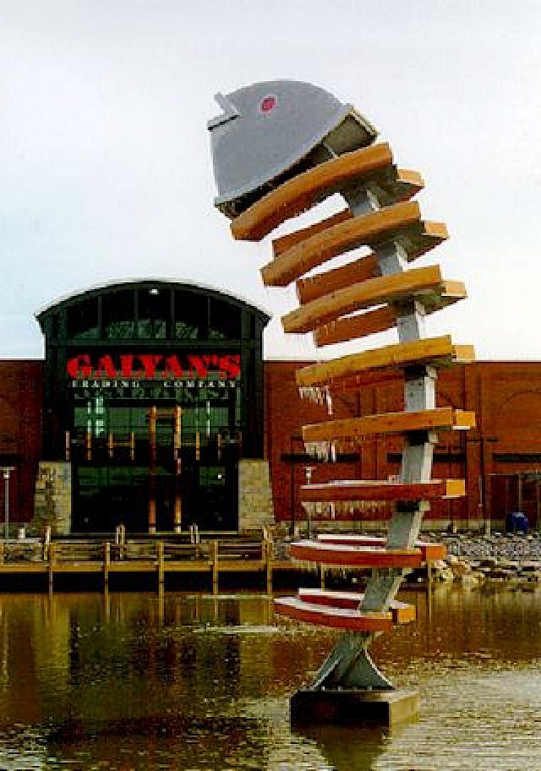 This sculpture is Galyan's focal point for their 80,000-ft2 sporting goods store. Fish is 40 ft (12 m) tall with the spine, rib supports and fasteners hot-dip galvanized. Accessories used on Fish are treated wood, stainless steel and glass.