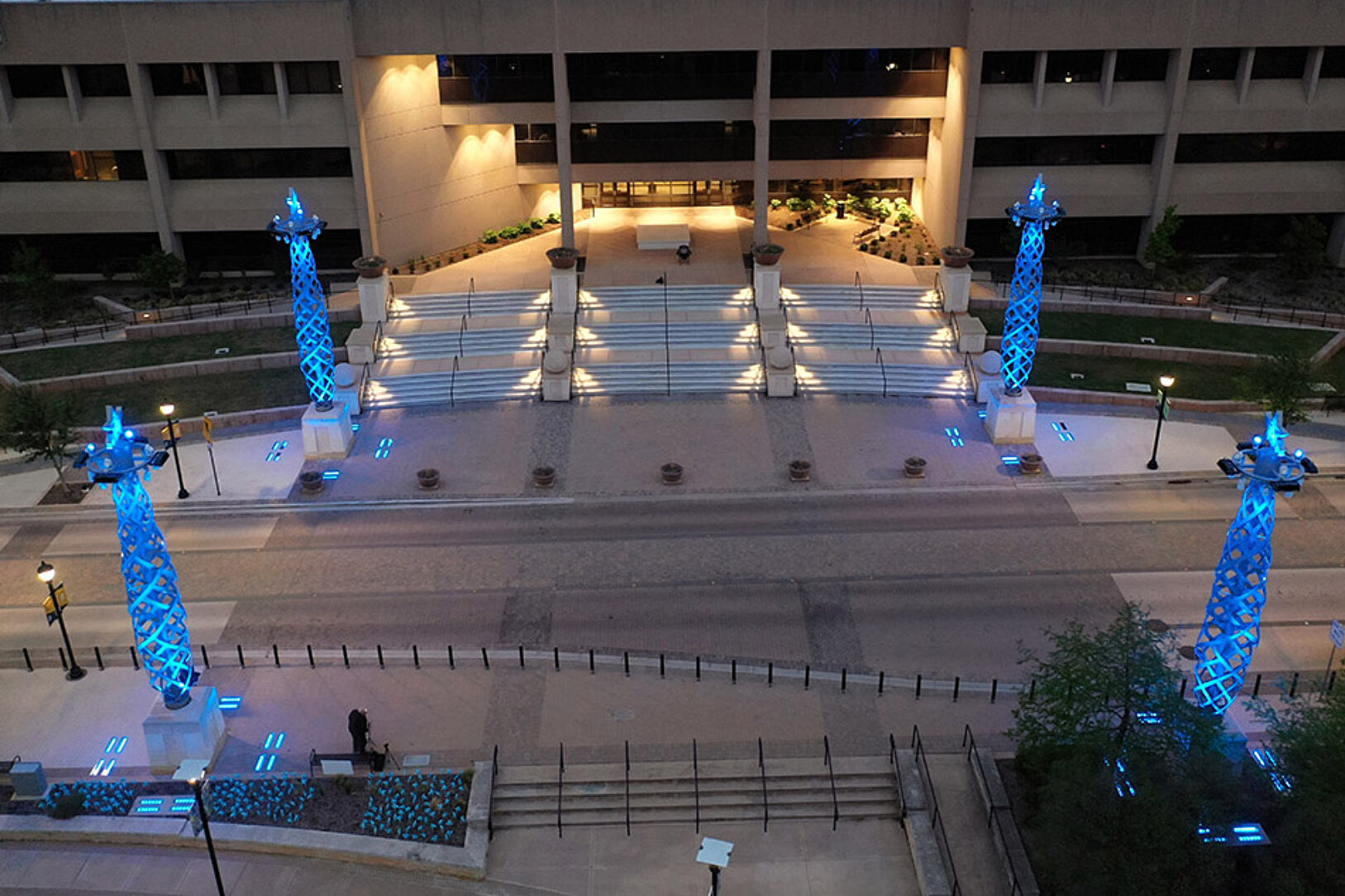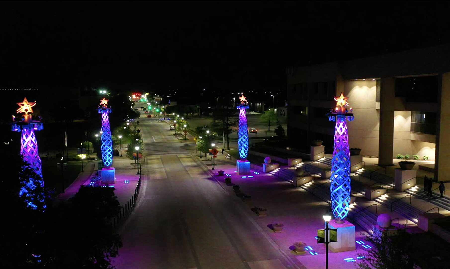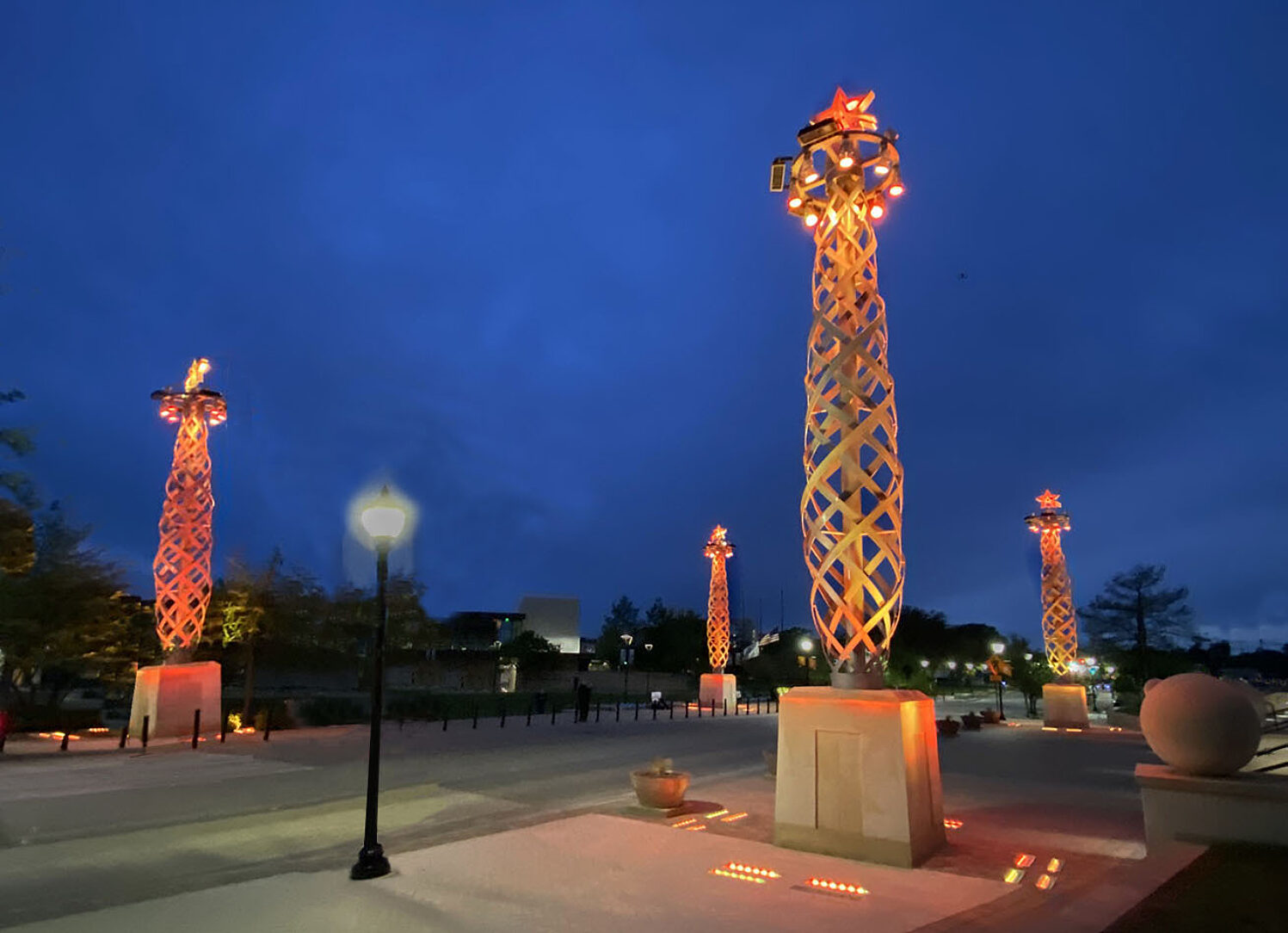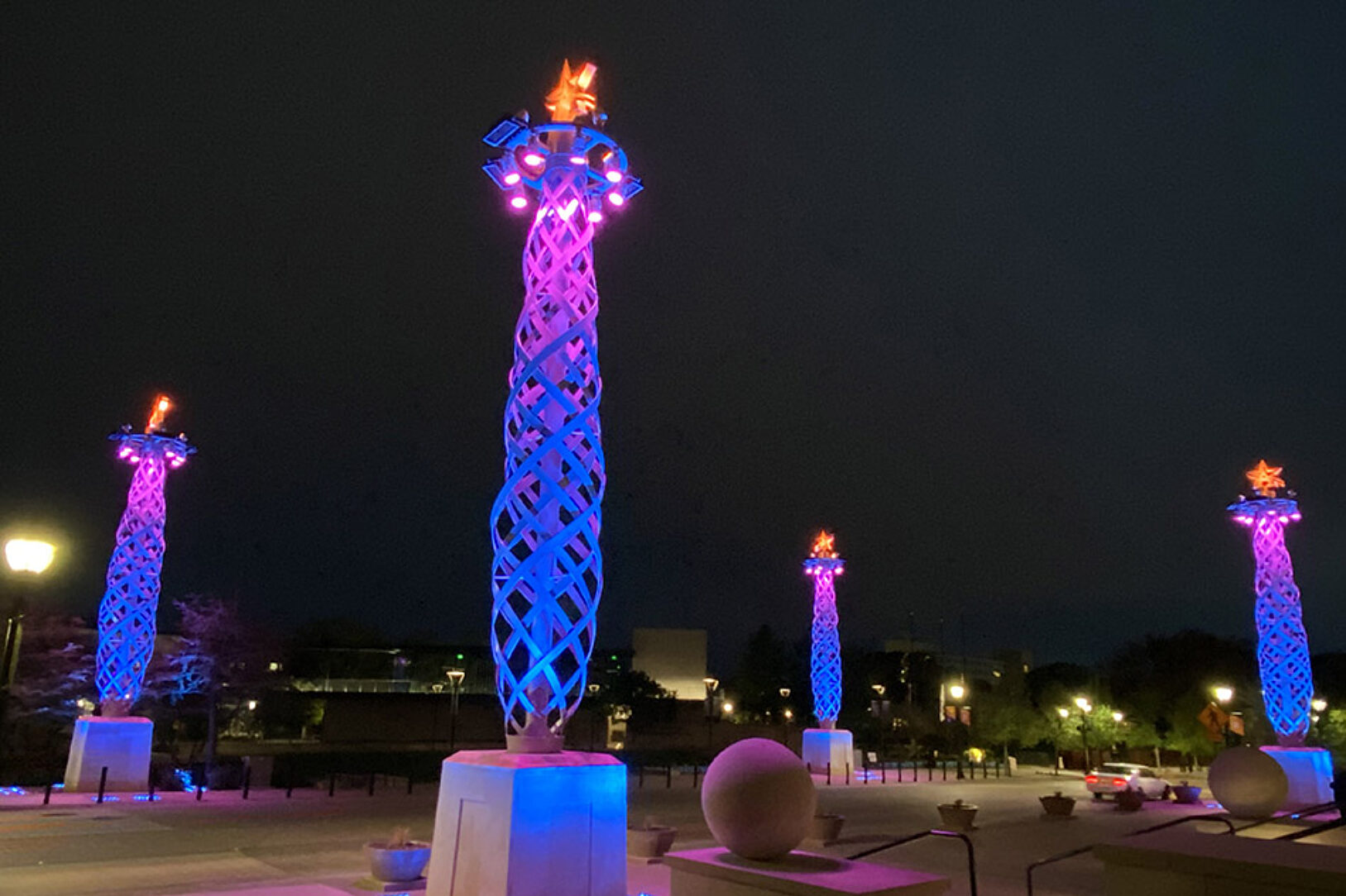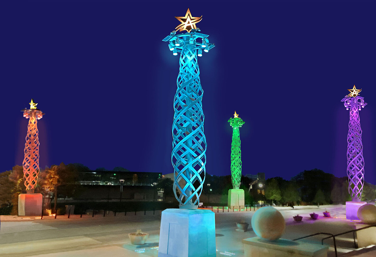 The three-ton obelisk towers sit atop seven-foot-tall concrete plinths and encase a ten-inch central pipe-mast. The pipe-mast is crowned with a four-spoke ring carrying twelve, full-color spectrum, LED lighting lamps and four stadium area lamps, and topped with the City of Arlington’s Star A logo. The color-programable LED lights can be changed for public events and holidays. Upon their unveiling, the Flamme d’Illuminacion towers were blue for Police week, pink for Breast Cancer Month, and red and gold for Christmas.