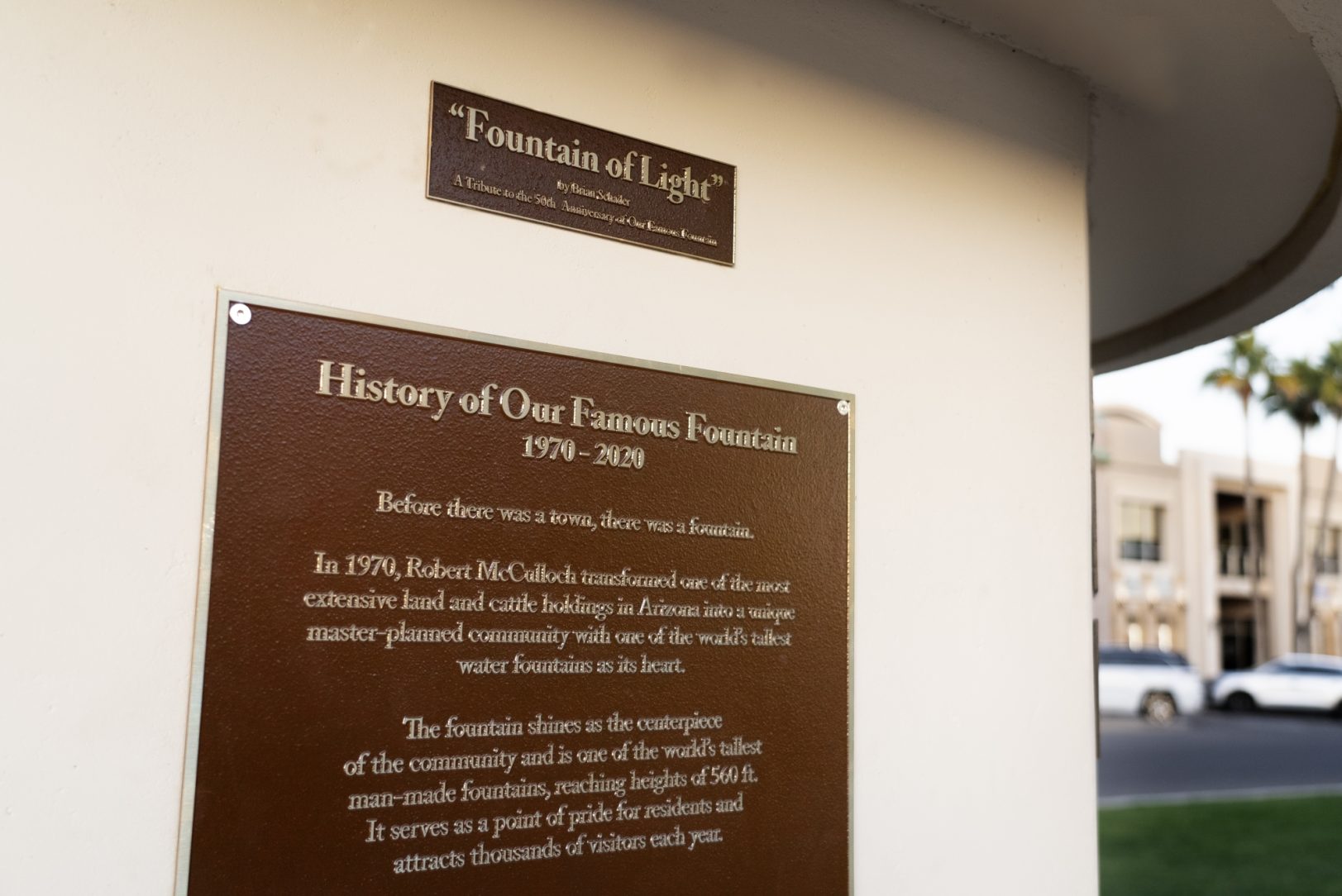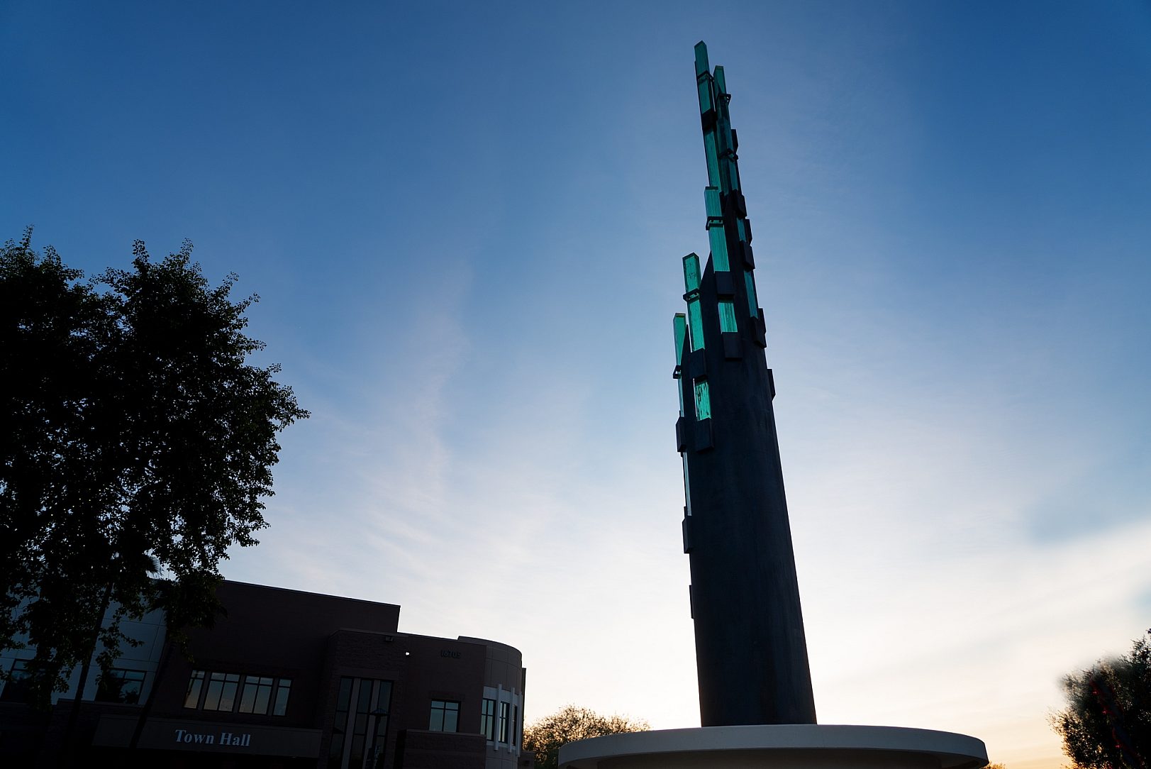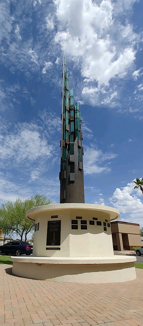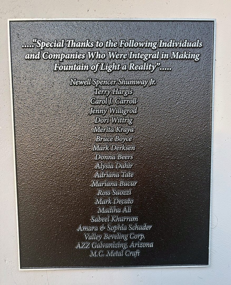 Schader envisioned a piece that would not only captivate but also endure. He designed the spire with soft interior lighting to comply with the town’s dark sky-friendly codes, creating a glowing tribute that integrates seamlessly with Fountain Hills’ commitment to preserving its natural nightscape. The sculpture’s base provides a seating area for residents and visitors to reflect while learning about the town’s history through bronze plaques honoring past mayors and recognizing those who made the installation possible.