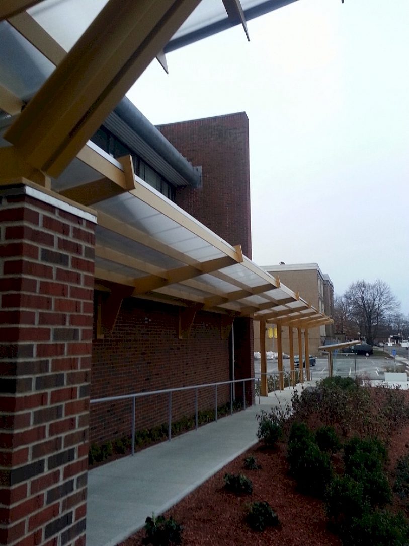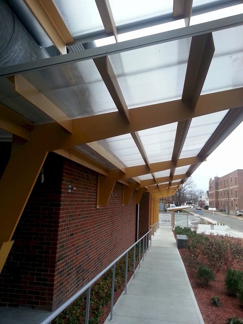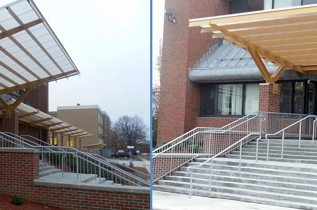 To meet these goals, the architects designed clear topped canopies supported by structural columns at the front entrance as well as the ADA access ramp. Having worked with the galvanizer on previous projects, the architects specified hot dip galvanizing as the long-term corrosion protection mechanism and realizing that there would be a significant amount of field welding, specified a galvanizer-applied epoxy primer for a field topcoat. The final appearance was an aesthetically pleasing project.