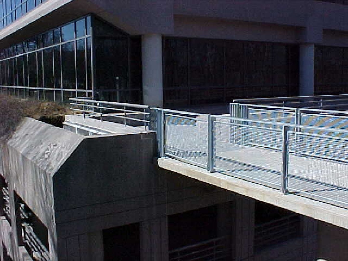 The 160 foot long walkway was originally specified as stainless steel, but when the cost of stainless steel was unveiled, the owner changed to hot-dip galvanized steel. Galvanizing offers a similar aesthetic appeal and excellent corrosion protection for much less than stainless steel. All of the railing, including the frames and mesh, walkway, and bridge were hot-dip galvanized. As the rail was initially designed for stainless steel, simple modifications were made to make the design conducive to the galvanizing process. The walkway is supported by 12 cables, and connects a series of elevated walkways linking Freddie Mac office complexes. Using galvanized steel ensures the bridge will be an attractive and safe way to travel between the complexes well into the future.
