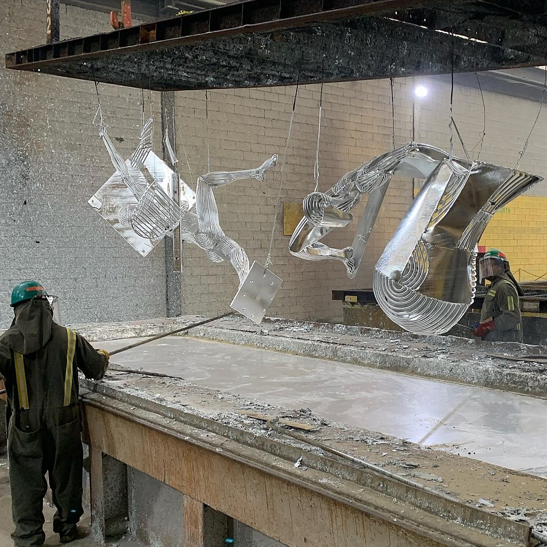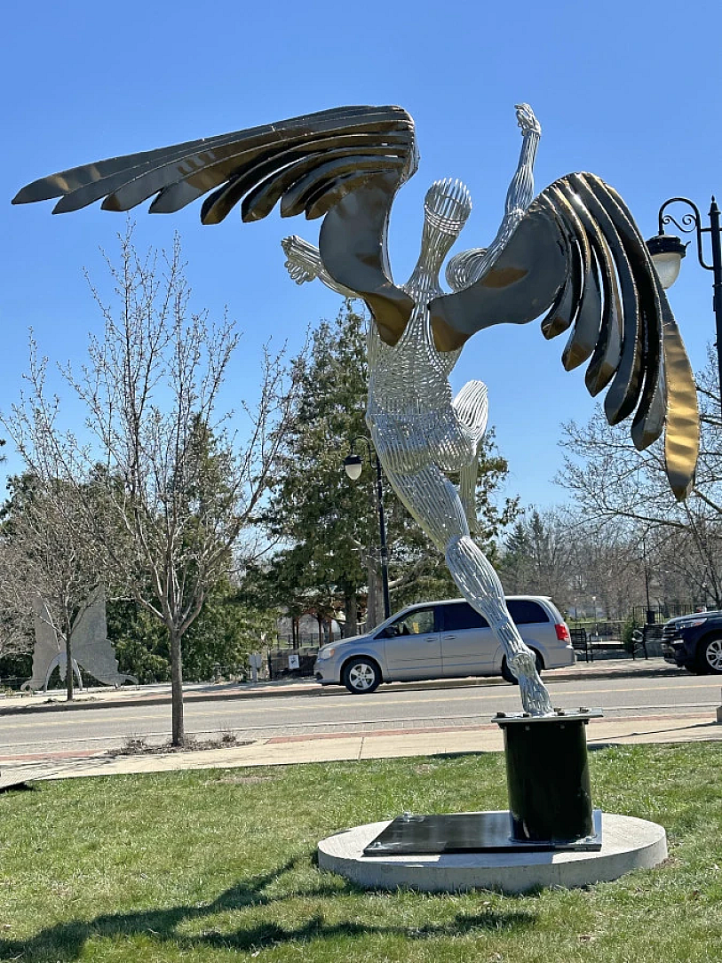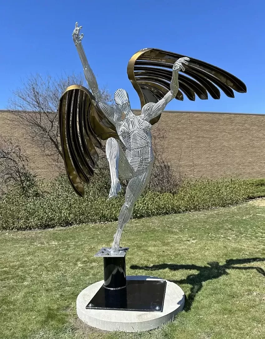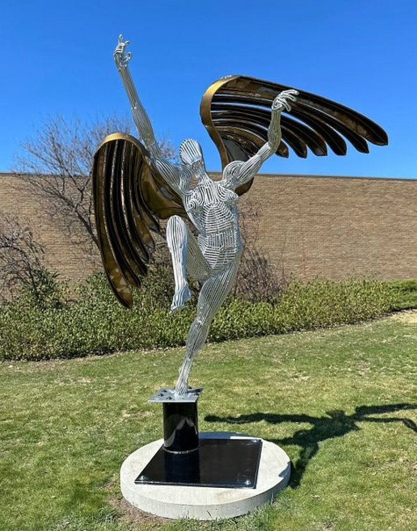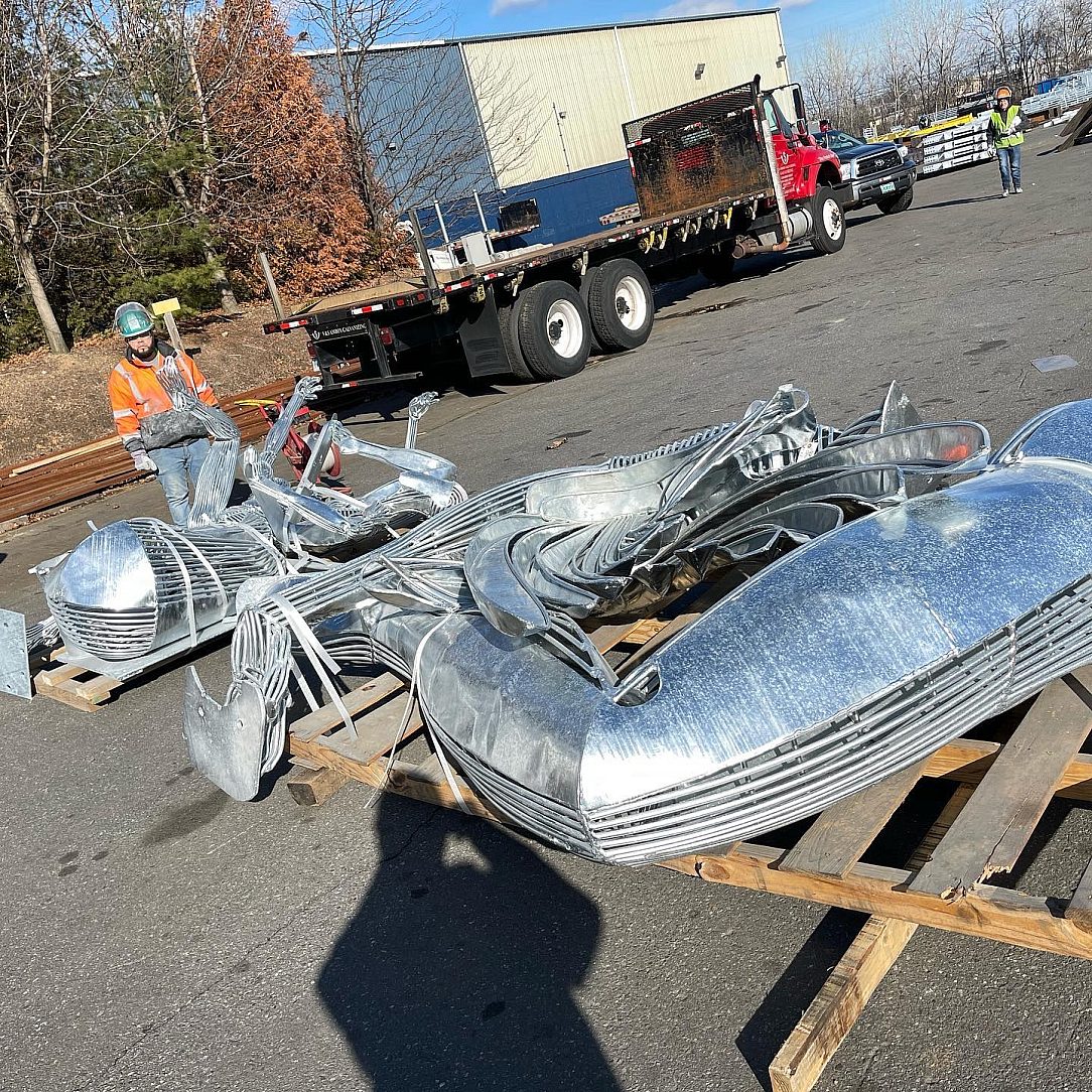 The sculpture is 16’ tall and consists of 3 separate pieces designed to fit on a 12” square base. Each section was made specifically for the hot-dip galvanizing process in mind in keeping the size, warping, venting, and draining all in mind for an outstanding galvanized finish. The entire body made up of ¼” round bar was dipped in one piece and with the 2 wings and base was the things only being coated as a duplex powder coating system in a gold/bronze color for contrast.
