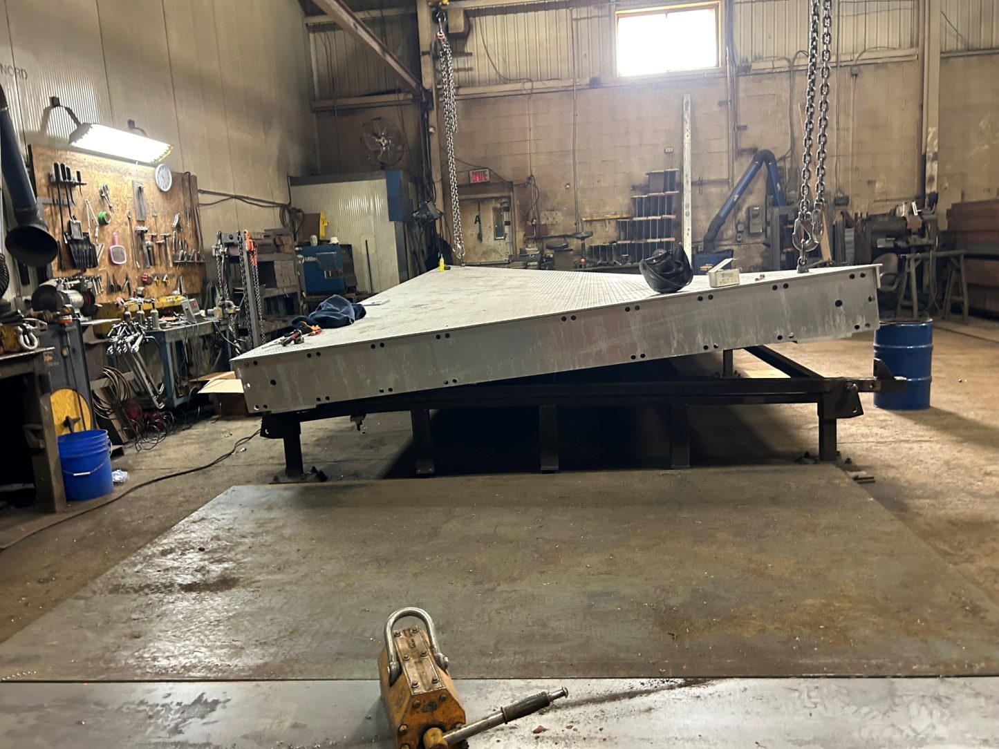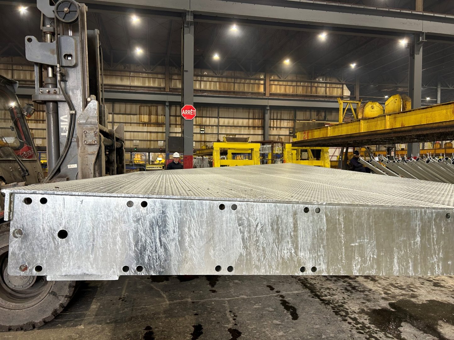 The traditional solution has been to galvanize the plates and frames separately and then bolt them together. This leads to extra costs and reduced strength as well as persistent loosening of fasteners leading to deformed and damaged plating or even truck accidents. The fabricator decided to try a one piece design with welded plating to avoid these issues. The extent of the deformation problem was made evident when an initial unmodified frame distorted twelve inches after galvanizing (almost 10,000% over specification) along with severe checker plate warpage . Enter the 21st century Galvanizer with profound inhouse chemical and metallurgical skillsets. Combining the specialized knowledge and experience of the engineer, the fabricator and the galvanizer resulted in over 200 design changes to the product and a precise step by step galvanizing process resulting in a deformation free test platform meeting all specifications.