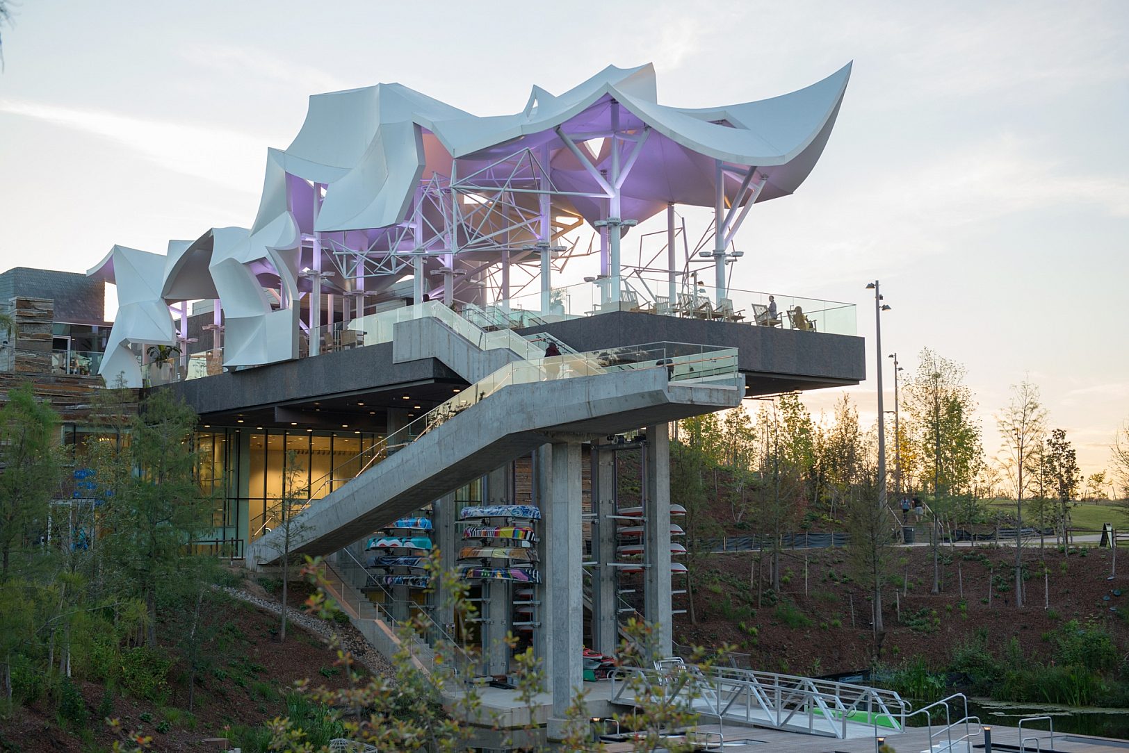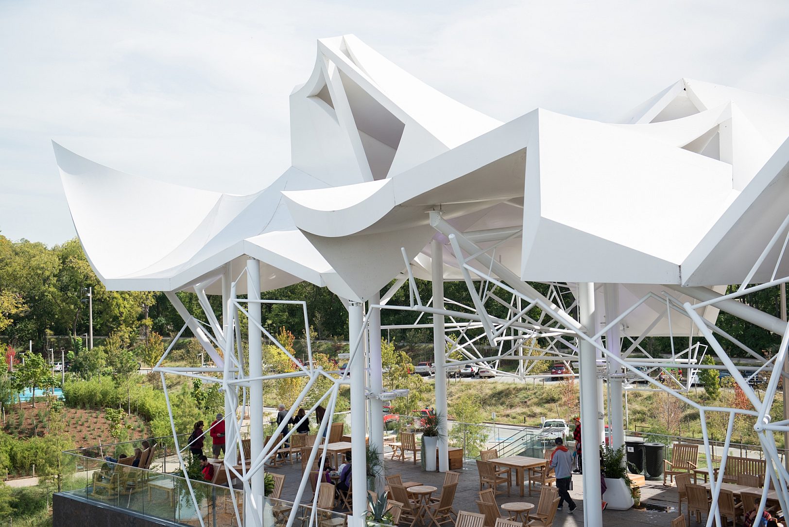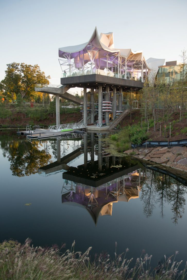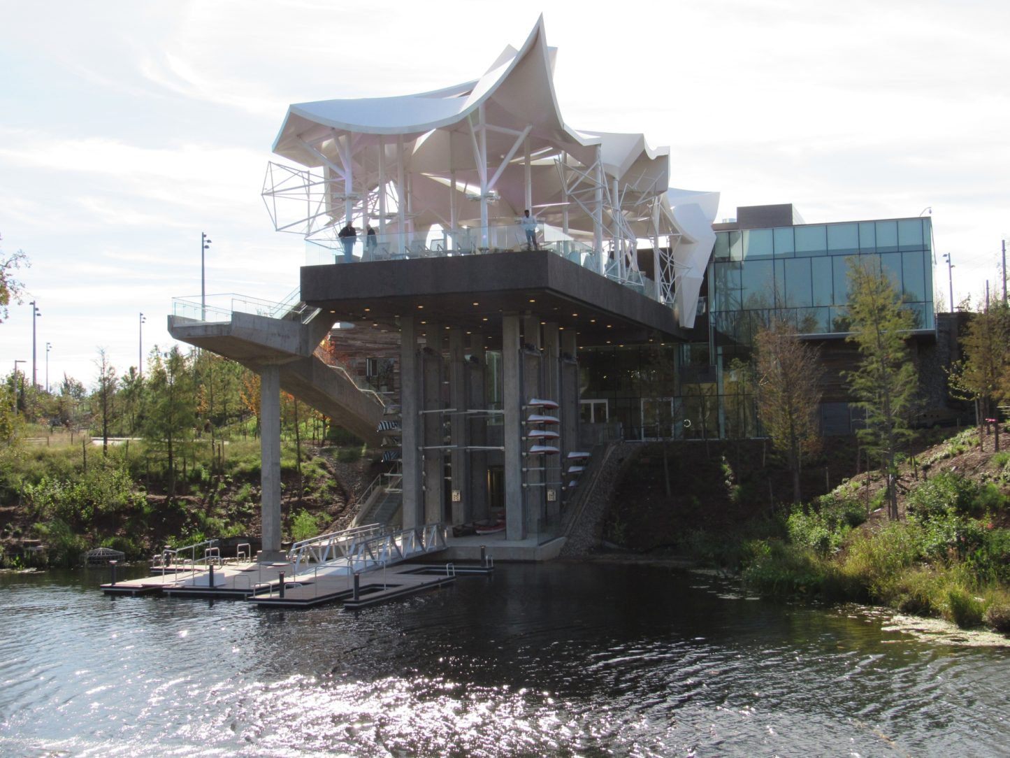 The three-level, 21,000 square foot boathouse serves as a restaurant, boatlift facility, activity hall and administrative office center for the park. The open-air pavilion on top of the boathouse sits 35’ above the pond. It is a platform for the Vista restaurant and offers great views of the park and downtown. Huge pipe columns ascend up through the platform to support 7,200 square foot fiberglass “sail like” panels.