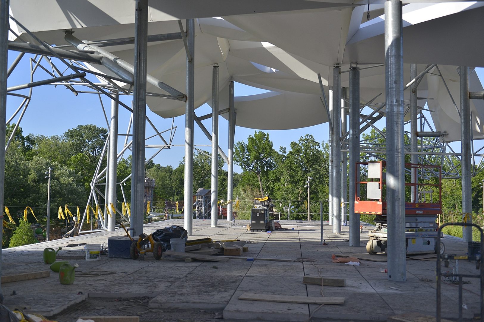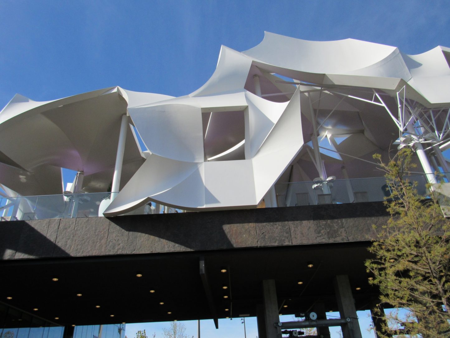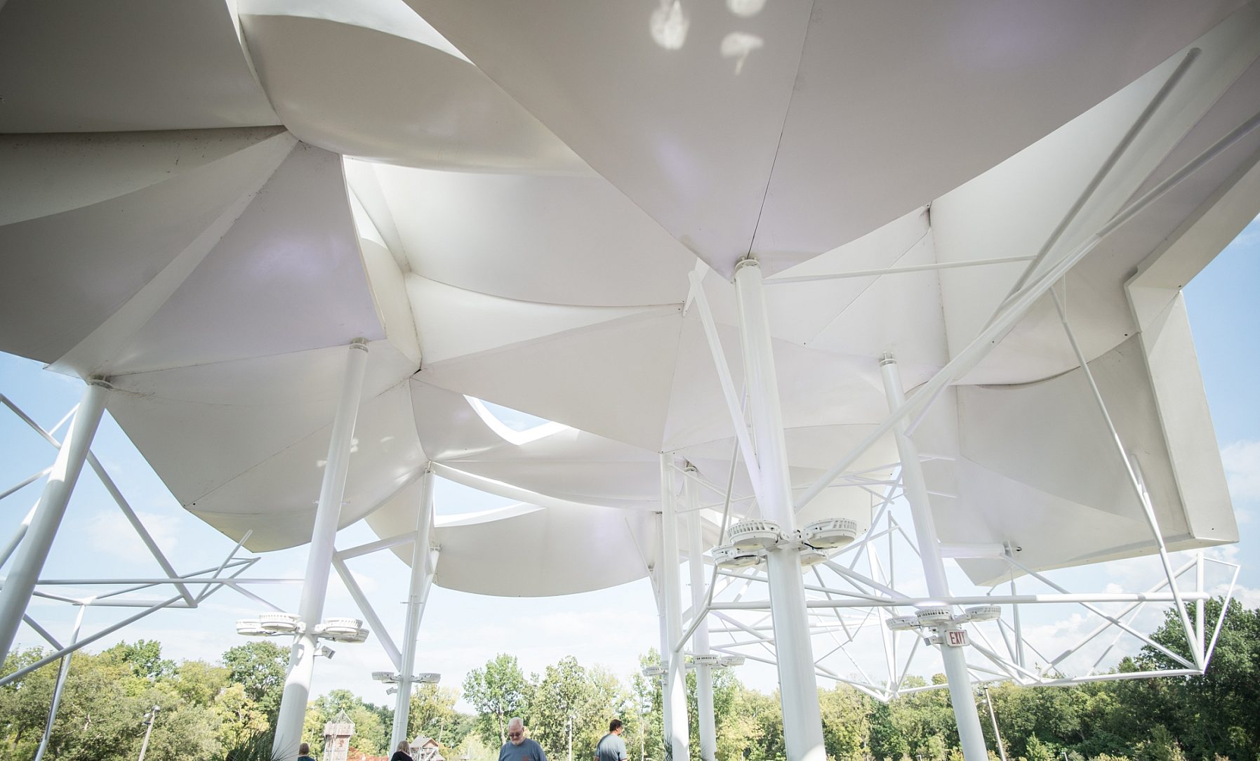 The three-level, 21,000 square foot boathouse serves as a restaurant, boatlift facility, activity hall and administrative office center for the park. The open-air pavilion on top of the boathouse sits 35’ above the pond. It is a platform for the Vista restaurant and offers great views of the park and downtown. Huge pipe columns ascend up through the platform to support 7,200 square foot fiberglass “sail like” panels.