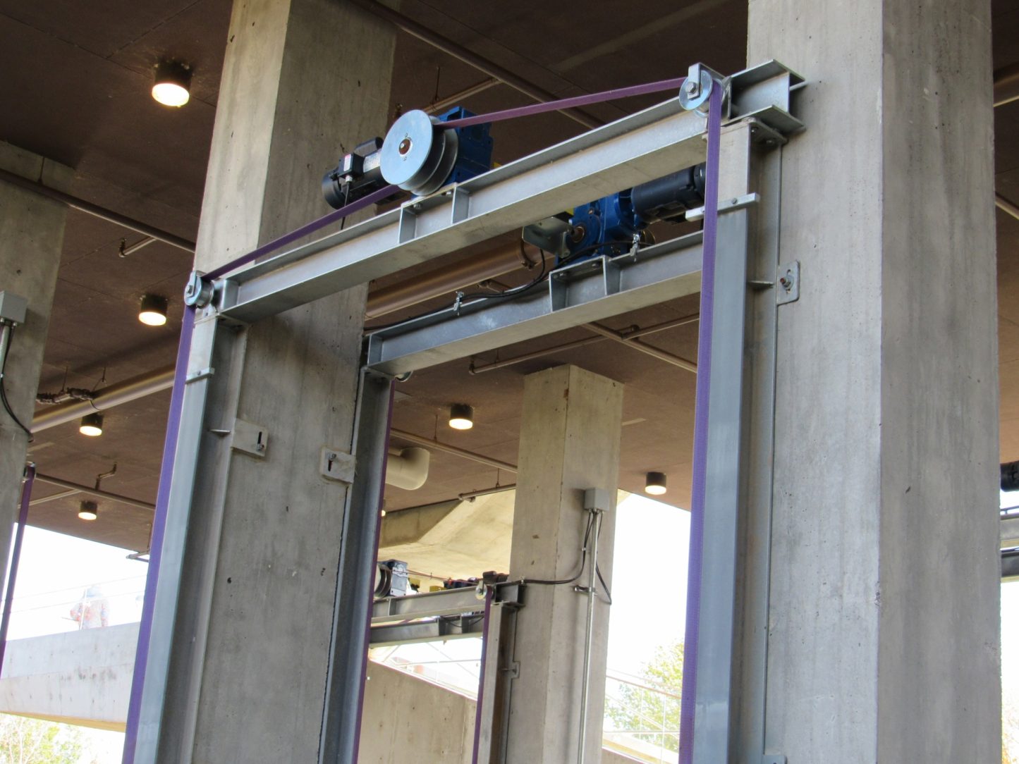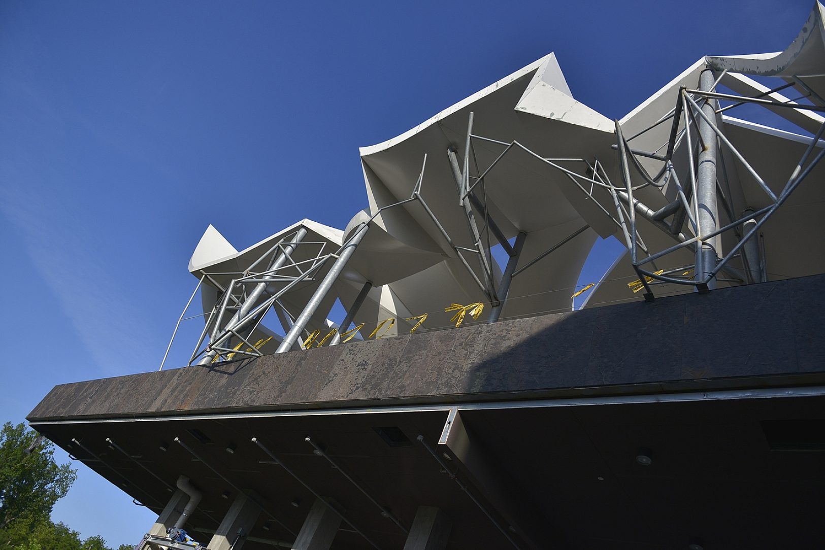 All of the steel pipe columns and supporting braces were hot-dip galvanized prior to being coated with a white paint to match the color of the adjoining sails. The designers insisted on hot-dip galvanizing to ensure worry free maintenance for decades as the structure weathers with the elements.