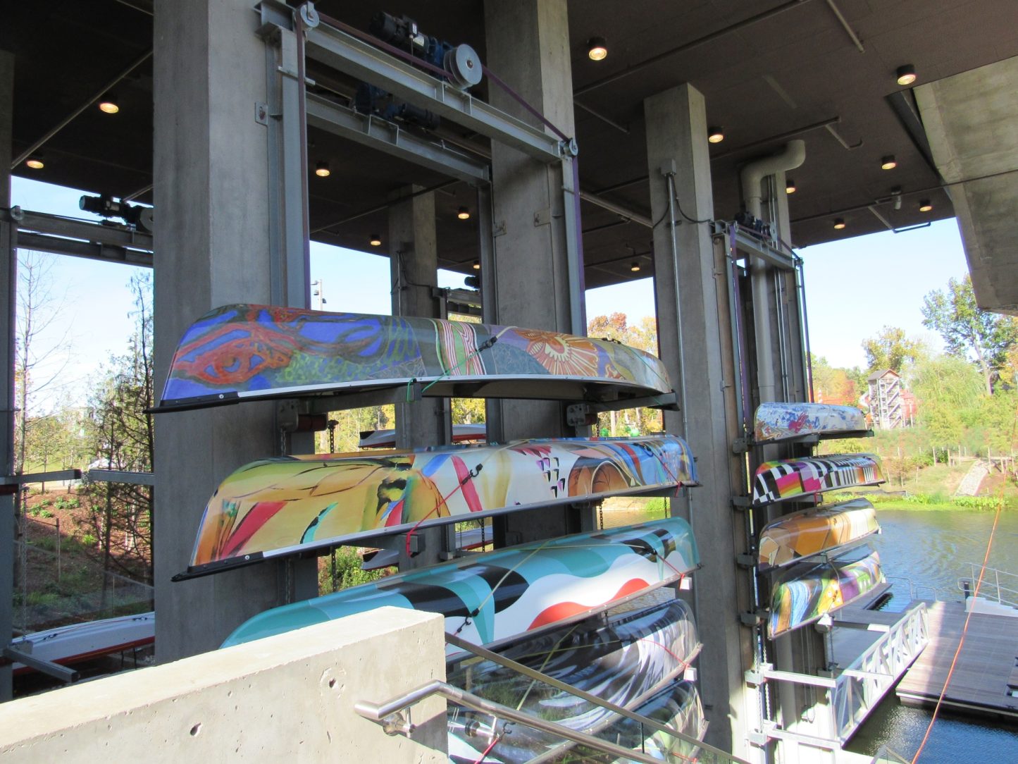 Beneath the pavilion is a fully-equipped dock area for the paddle boats, canoes and kayaks which can be rented to explore the pond. A hot-dip galvanized chain lift system to rack and stack the boats is mounted to the piers that support the pavilion. Overhead support beams, vertical bracing and moving arms were all hot-dip galvanized to protect the structure.