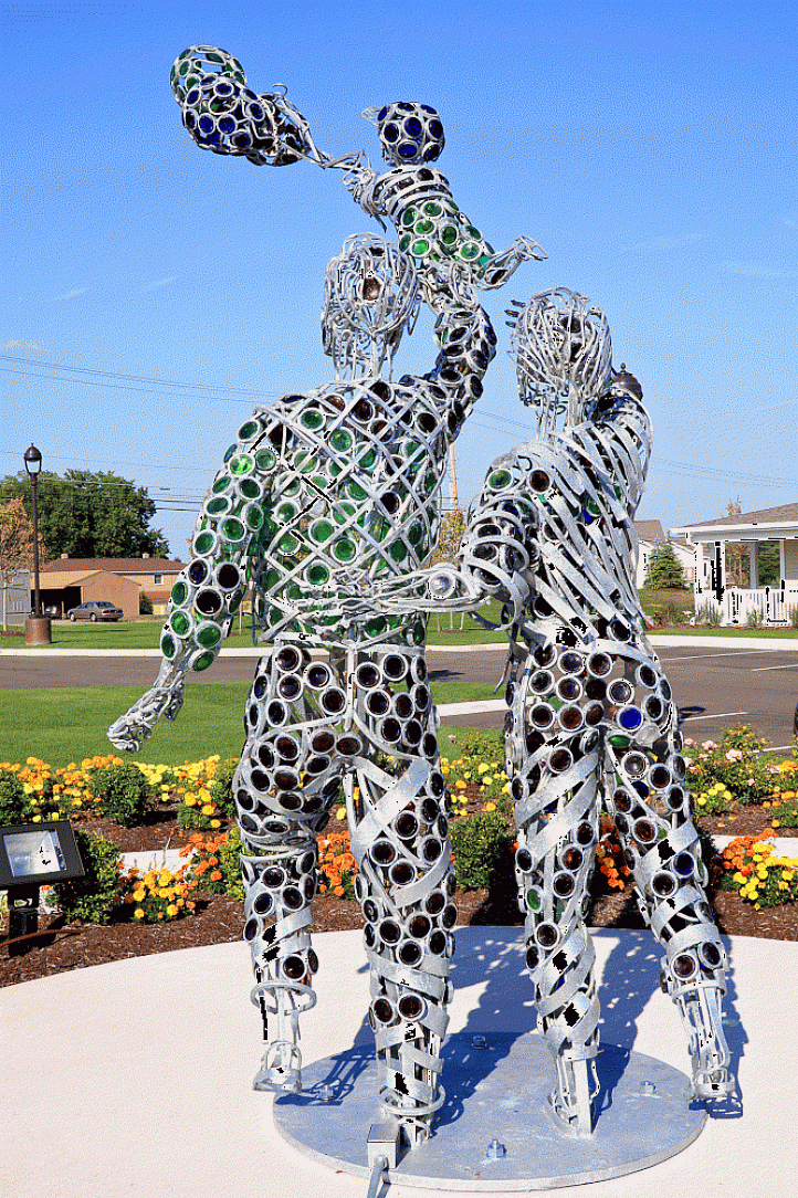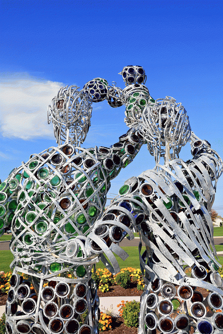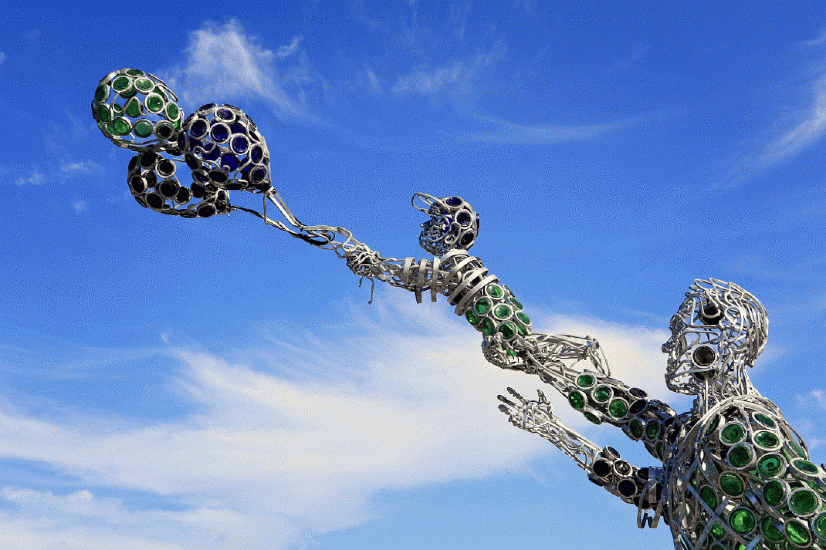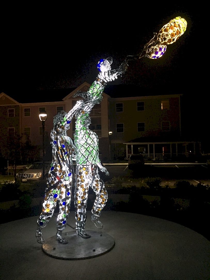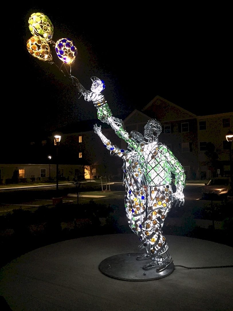 Constructed from steel, glass, and internal lights, Generations took more than six months to complete. The sculpture is the likeness of a couple holding a child overhead as the child clutches three balloons. According to Mr. Buckohr, The adults are passing their life experiences on to the next generation facing the challenges of the future. Challenges were a big part of the project, which required 799 individual rings cut from tubular steel and the bases of 799 various colored bottles to fill the rings. The metal work was completed in two units; the adults poised on the base, and the child holding the balloons.