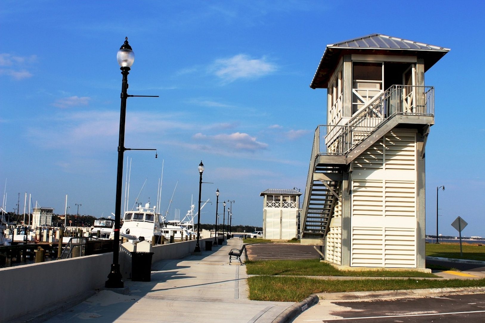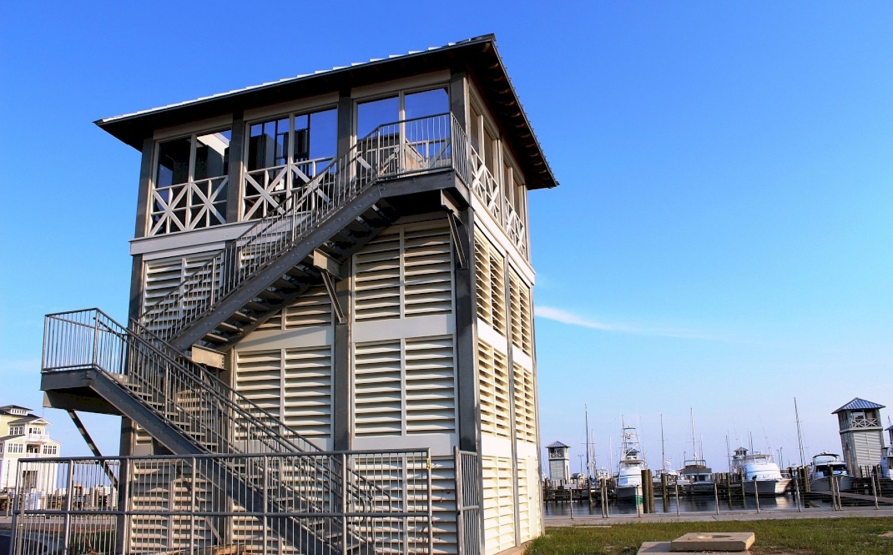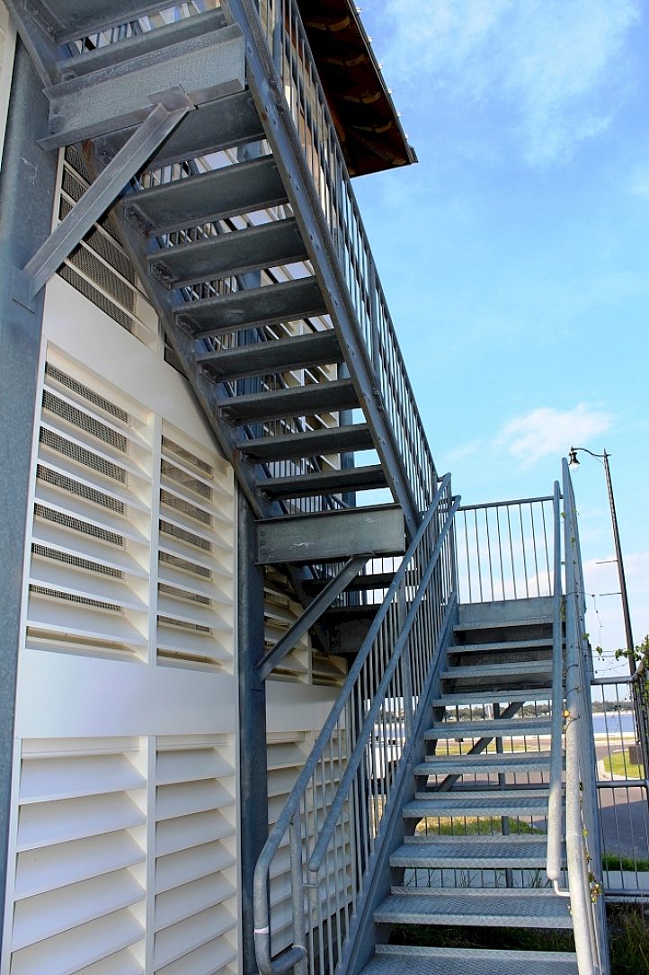 The designers used ingenuity by utilizing HDG for these high rise structures, higher than a typical storm surge, for electrical transformers, weather prediction equipment, and storage of emergency equipment. The HDG structures also house important navigational equipment that is of great importance during a storm. These structures are accessible by HDG stairs and platforms that will require little or no maintenance for over 50 years. The HDG structures met the aesthetic requirement of blending in well with the future harbor landscape.