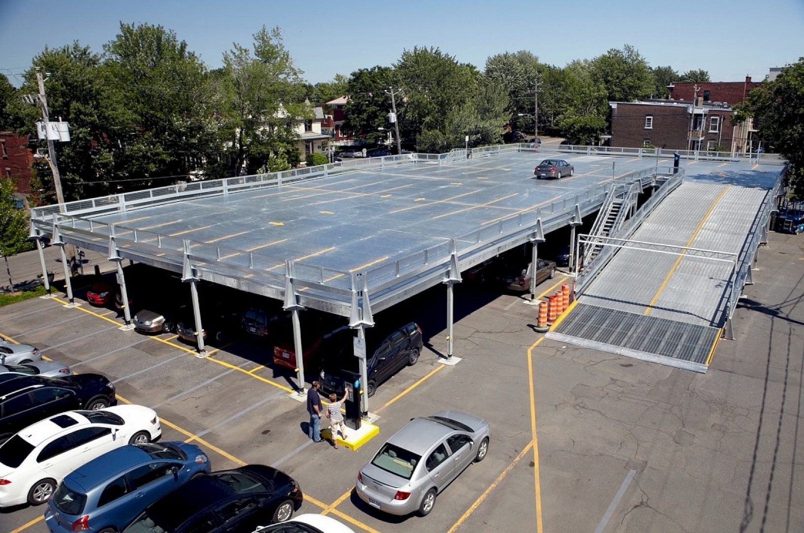 Two completed modules have been leased to the city of St-Lambert, Quebec. The municipality opted for this concept of modular structure to accommodate business owners and shoppers during the reconstruction of a busy thoroughfare in the heart of the city. The new, portable two-story parking facilities provide the municipality with a total of 70 additional parking spaces.