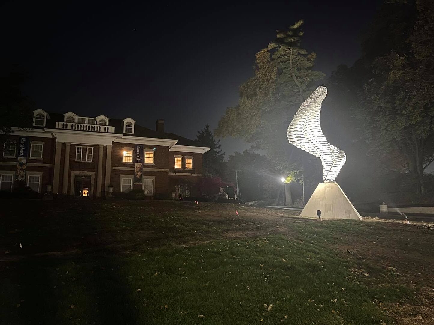 Planning and preparation for the AKMA art piece began in 2015 when artist Brent Collins conceptualized the design for a unique 13’ tall sculpture. Through the combination of his creativity and mathematical background the completed sculpture is demonstrably appealing, sitting atop a 4’ tall pyramidal base bringing the total height to 17’. Its installation in the museum’s front yard marked the completion of the greater improvement project. This highly visible location will certainly attract the attention of all future AKMA visitors.