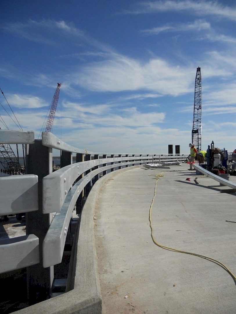 This project consists of a 1½-mile long flood wall and three floodgates, one of which is the sector gate across the 40-foot deep Gulf Intracoastal Waterway (GIWW). The GIWW Sector Gate opens and closes a shallow-draft channel with the sill being 16 ft deep, and features a 150-foot-wide opening. The monolith walls and gates are 26ft high as dictated by anticipated storm surges. The team of Shaw Environmental & Infrastructure, CJ Mahan Construction Co., and others worked together to build the surge protection barrier. Alfab Inc. was chosen to build the barrier railing system that would be installed on top of the sector gate and monolith structure. The construction team knew that this railing would be in the constant salt water environment and have to endure the rigorous, corrosive conditions.