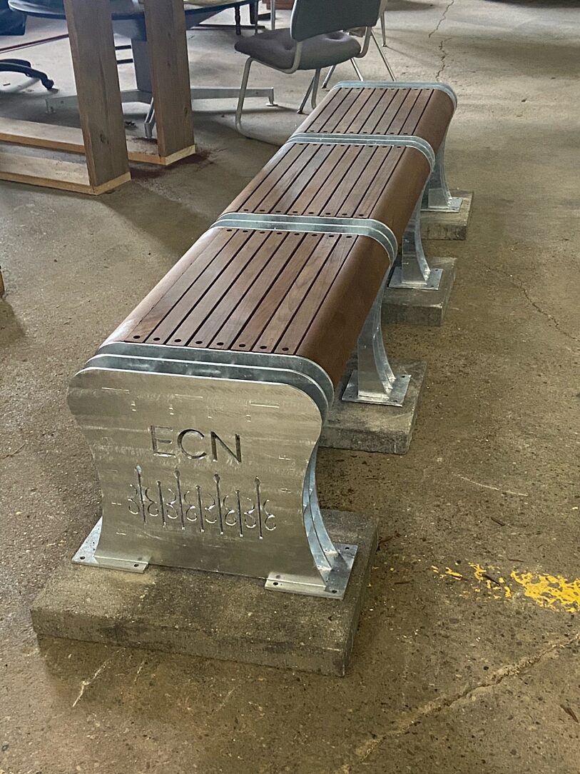 Students designed and built the benches through the Design-through-Production program. Students had the opportunity to work out of the facilities at MadJax with an agreement with Ball State to serve as a learning engagement through real-world projects. Working with industry partnerships and material sources in Indiana to give students experience with direct application of design and fabrication for community projects. Students worked with the galvanizer to watch the benches be processed to understand the process and design techniques.