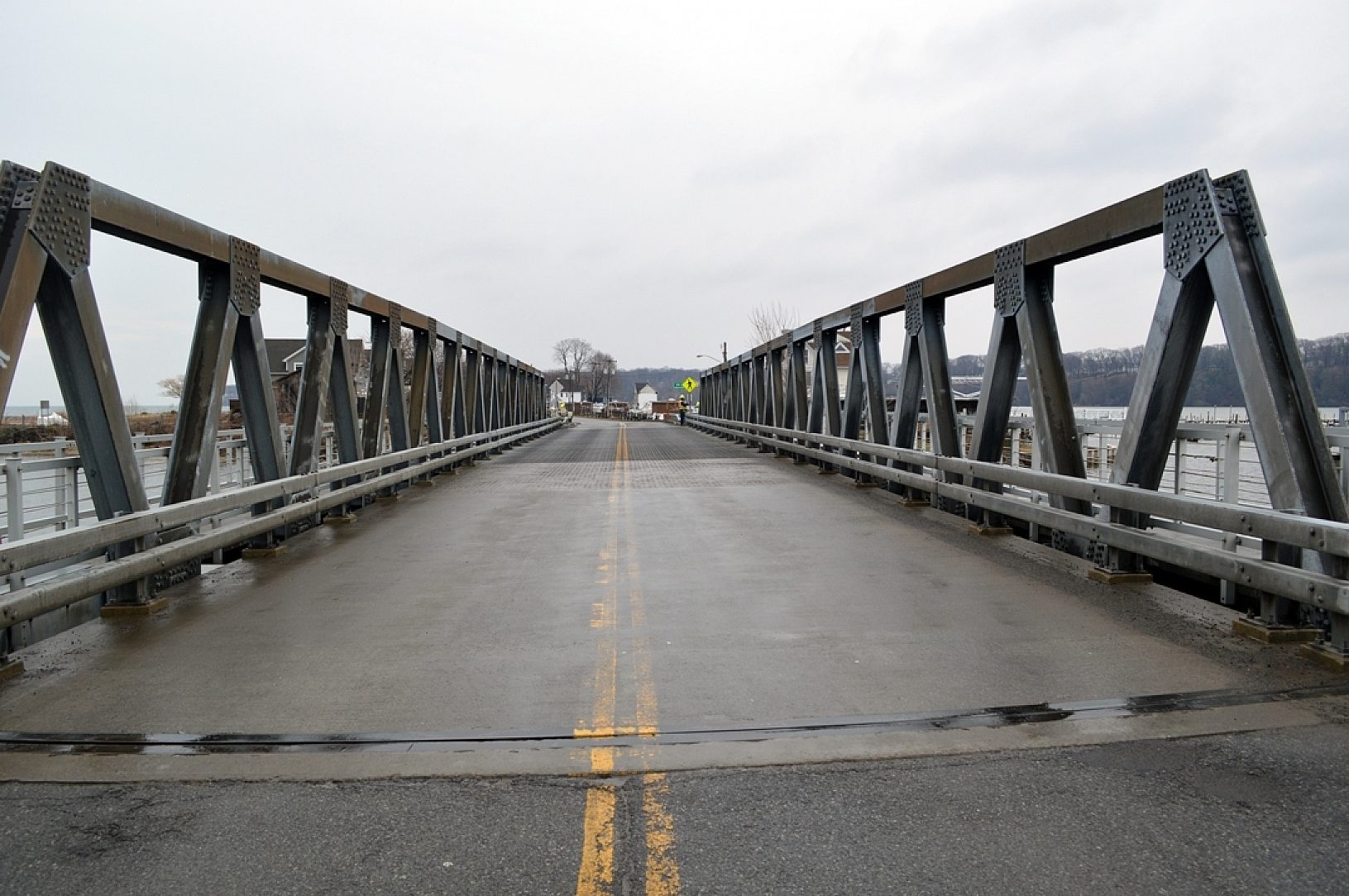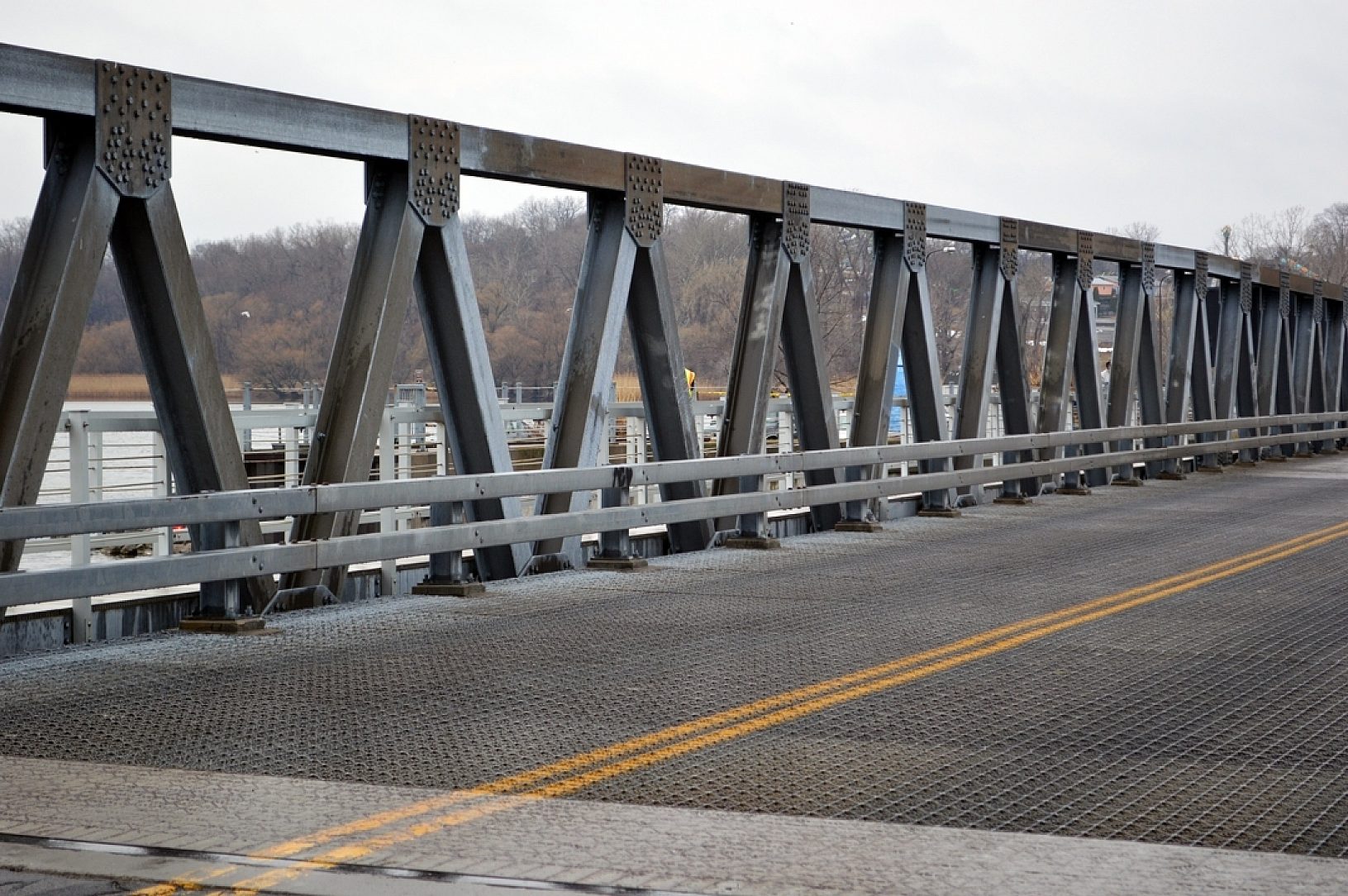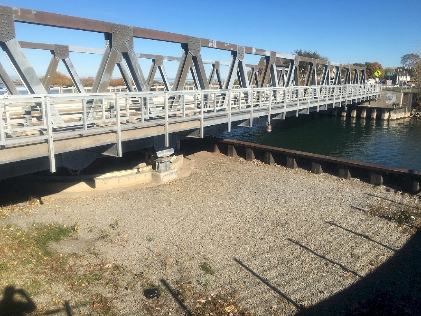 This is a 24-foot-wide, 2-span swing bridge with a 132 1/2-foot main span and a back span of 53 feet. The structure is a galvanized pony truss with all bolted connections and has a 5-foot cantilevered walkway along each side. An open grate steel decking was used to reduce the weight of the bridge.
