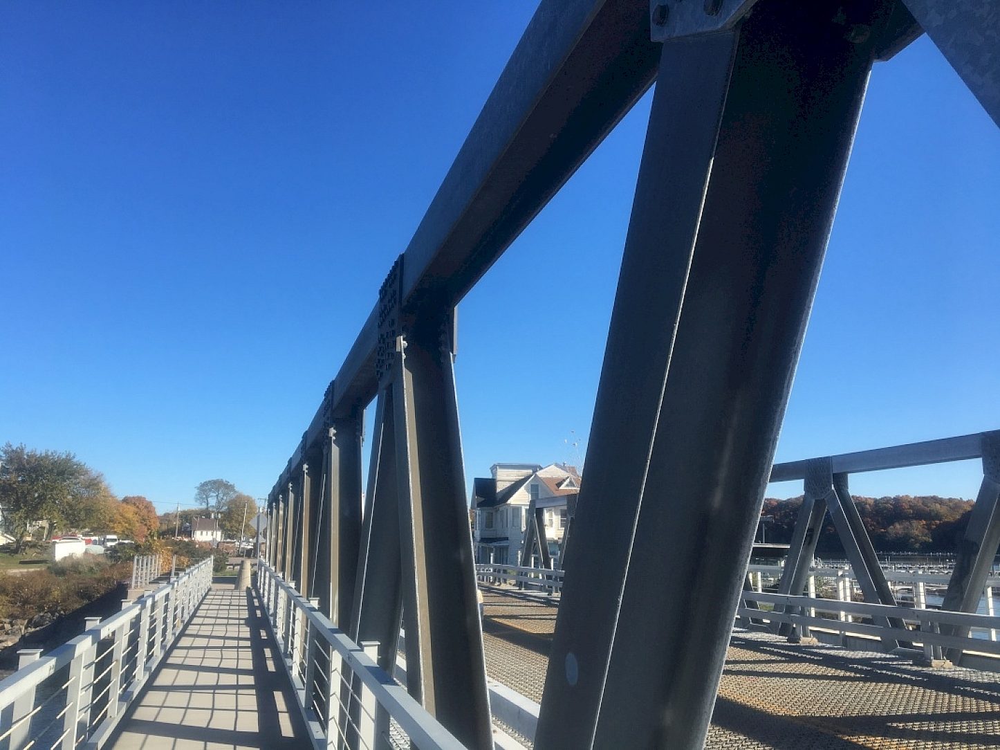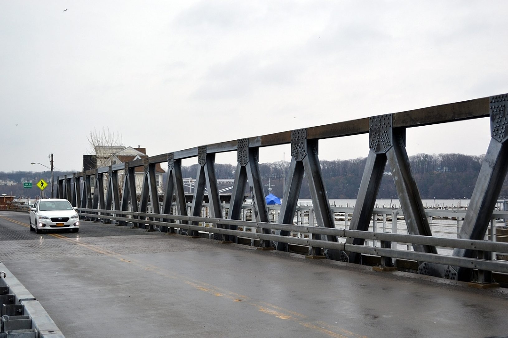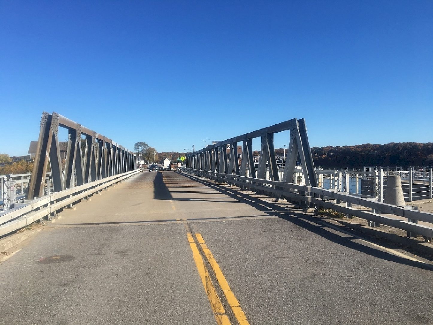 This is a 24-foot-wide, 2-span swing bridge with a 132 1/2-foot main span and a back span of 53 feet. The structure is a galvanized pony truss with all bolted connections and has a 5-foot cantilevered walkway along each side. An open grate steel decking was used to reduce the weight of the bridge.
