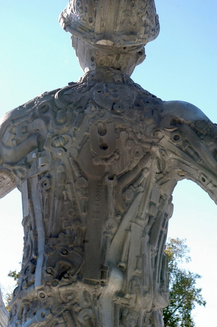 The entire piece is made up of galvanized steel from tools used to construct and actual pieces of the following structures: The World Trade Center, The Golden Gate Bridge, The George Washington Bridge and the Mackinaw Bridge.