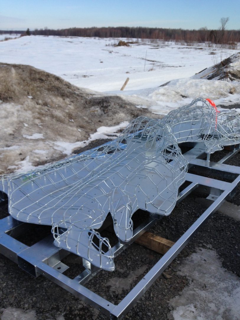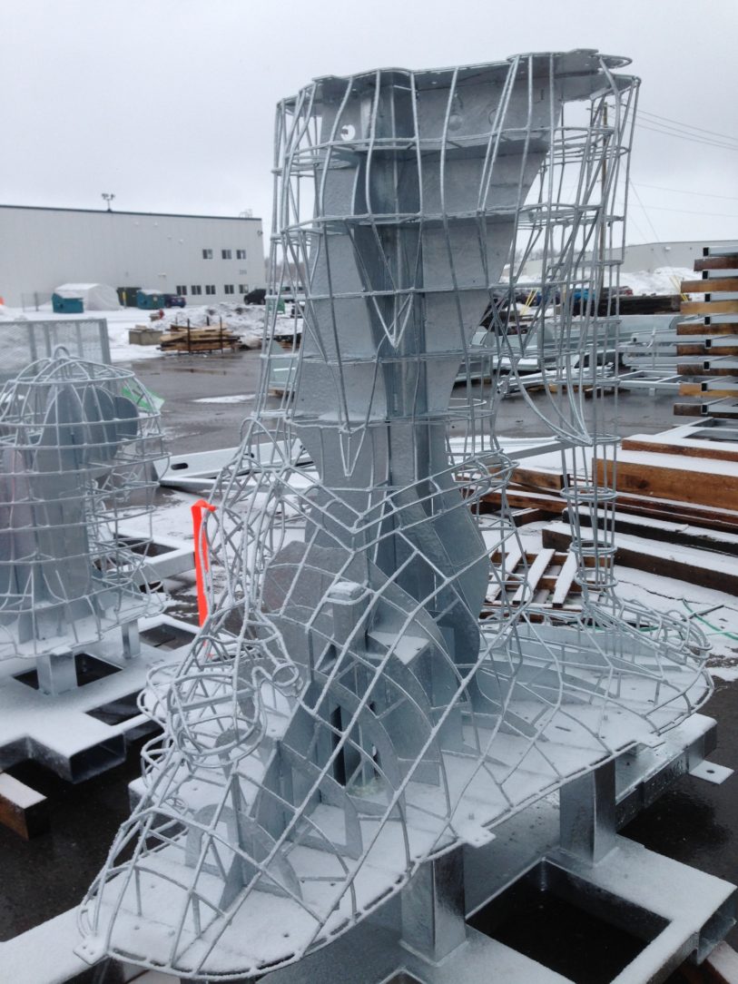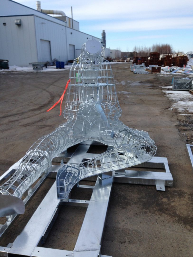 So for the 2018 version of the Exhibition Acme Décor’s artisans in Beloeil Canada went to work again fabricating additional exoskeletons for several new ecosculptures. This time with one vital difference, these were to be protected by Hot-Dip Galvanizing. Designed to be light for both cost and accessibility reasons the small diameter bar stock of these exoskeletons are by design susceptible to failure by corrosion. The complex three dimensional shapes renders complete painting coverage nearly impossible. Furthermore constant planting, pruning and weeding work not to mention transport and assembly constantly causes further paint failures and degradation. By comparison the rugged strength of Hot-Dip and its full immersion principle meets these challenges effortlessly.