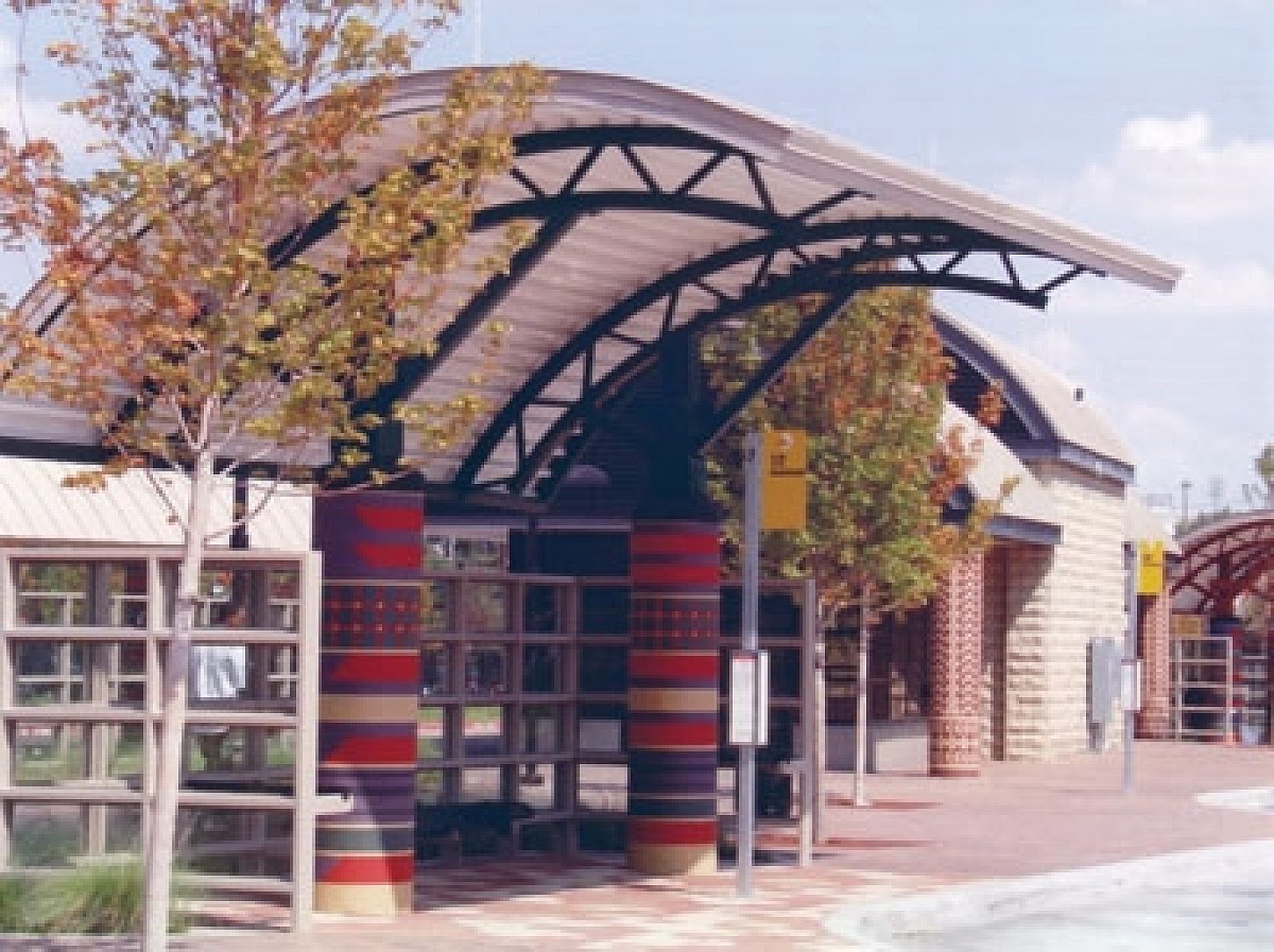 The transit center in South Dallas was designed to resemble the African Kente cloth with bright colors. But the use of the duplex system also helps designate the different bus routes (red, yellow, green, and blue). The main terminal, canopy beams, and stub columns were hot-dip galvanized for corrosion protection and then painted for aesthetic appeal. However, the paint provides more than visual appeal, the duplex system of paint and galvanizing will provide a service life at least 1.5 times more than either system alone. The transit center is located close to the hub along Martin Luther King Boulevard and is highly visible to the public. Using a duplex system ensures the transit center will be a visually appealing and functional facility for many years.
