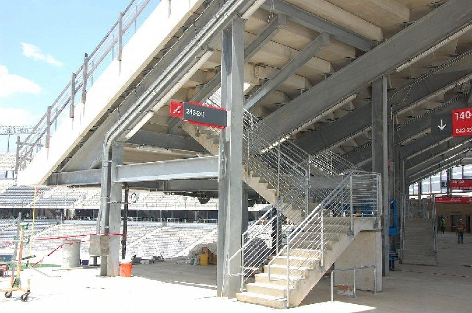 From the beginning of this project to its completion, communication between the galvanizer, design team, fabricator and general contractor was very important to ensure all construction deadlines were achieved. The lower structural steel portion of the stadium consisted of 1,775 tons of structural steel shapes, including pieces that were 67 in length. By utilizing multi-plant operations the galvanizer was able to cut transportation cost for the 2 fabricators involved and meet progressive dipping needs. Clear and constant communication between the galvanizer and the fabricator was necessary in order to keep the oversized material moving in and out of the galvanizing facility and to the jobsite to meet strict construction deadlines and match the steel erection sequences and overall aesthetic look wanted by the architect. The handrails needed to be fabricated and galvanized in a numerical order and delivered to the jobsite, in order to be installed in sequence to meet the deadline for the opening game. The architect wanted a distinct look around the entire stadium by having flat bar top cable railings and top pipe with solid bar railings. The stadium will serve as a model for complex HDG projects in the future where an architects creativity matched with the will and determination and capability of the galvanizer can produce a successful project outcome.