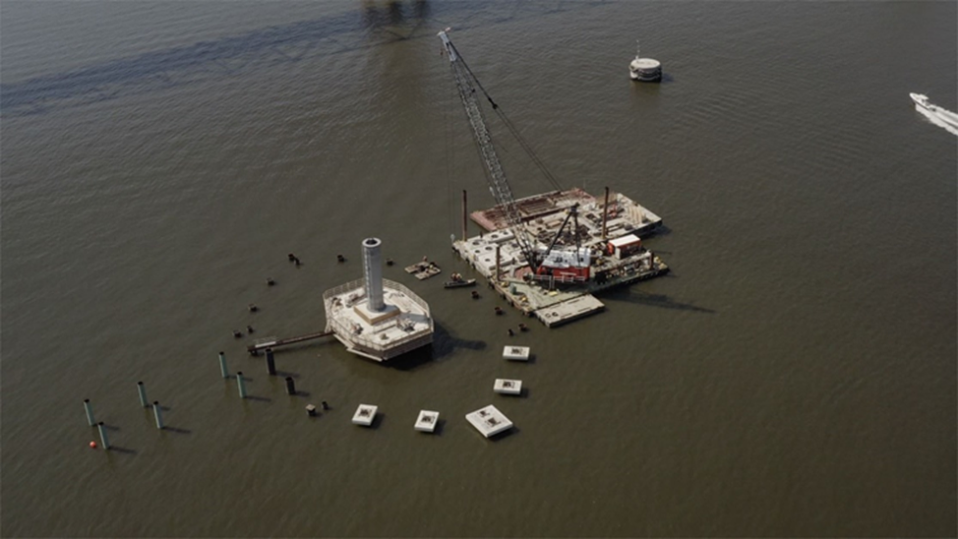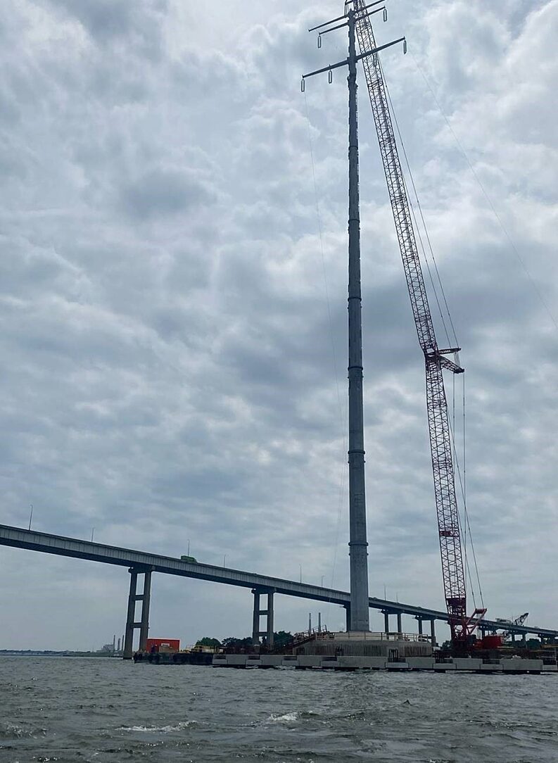 The overhead replacement option was still a complex project. To cross the nearly 2 ½ mile Patapsco River, five out of the eight new transmission towers were installed in the river with collision-protection structures. This includes what is now the tallest transmission monopole on the continent! The remaining three towers are located landside to complete the overall connection. A range of cranes, barges, and heavy equipment were required to construct the towers over the water and a helicopter was used to delicately string new electrical conductor and static lines from shoreline to shoreline.