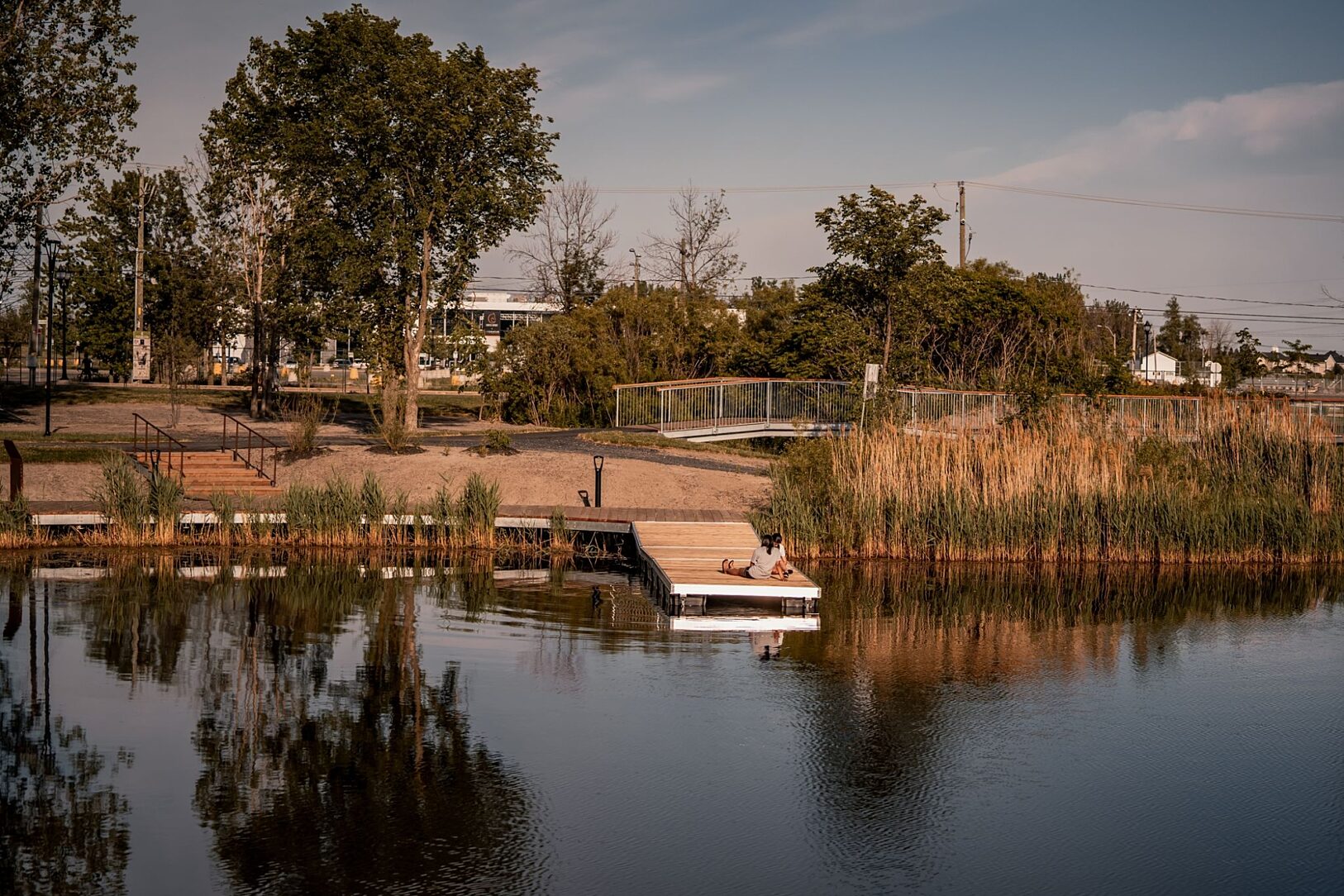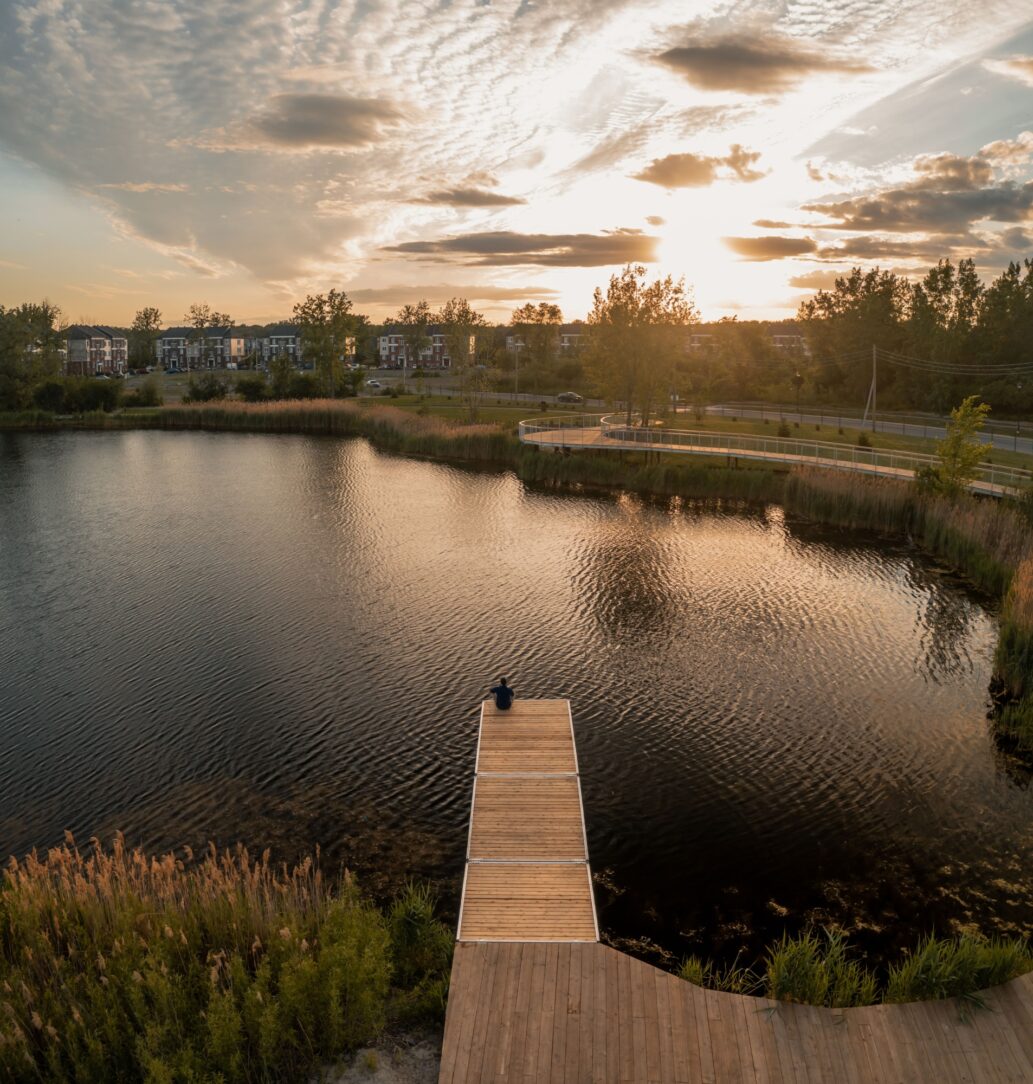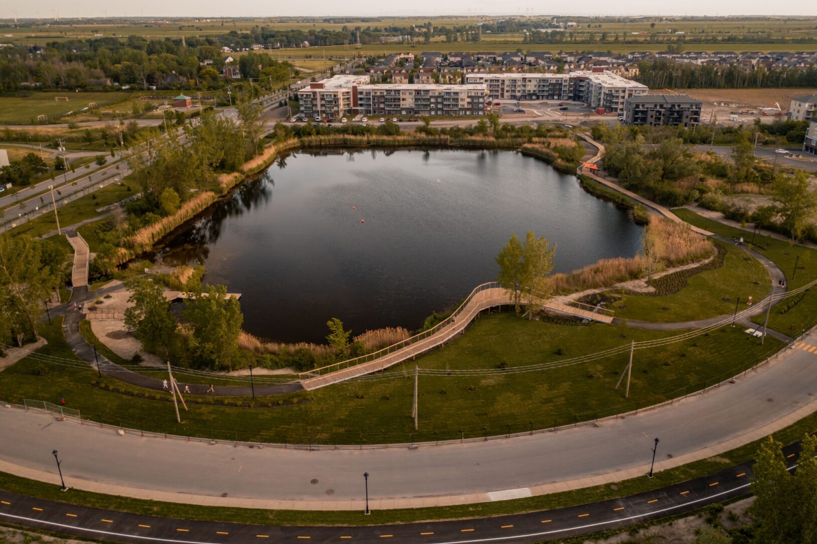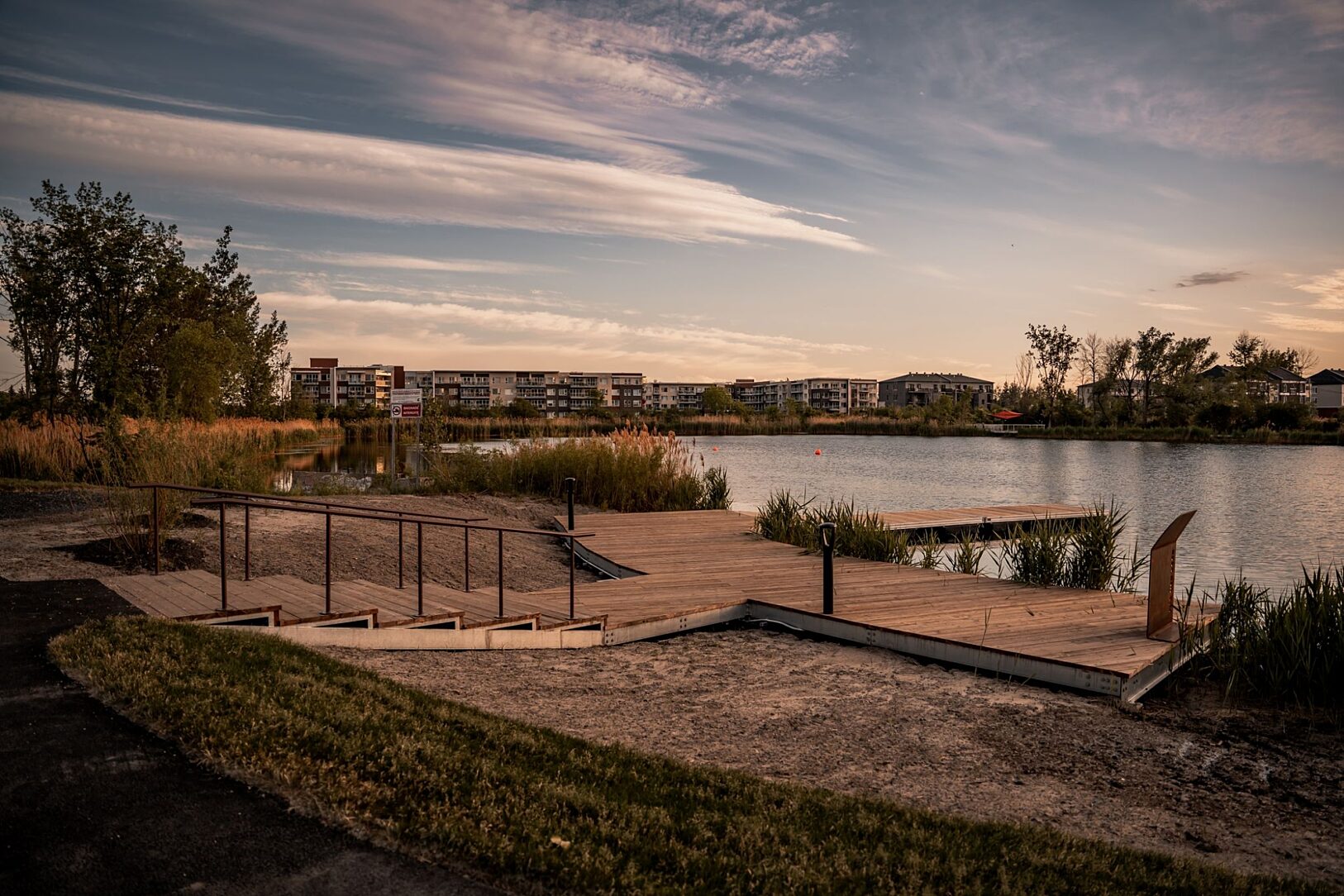 Fast forward several decades and a nearby commuter station bringing traffic free access to the Montreal metropolis has created an explosion of suburban housing development. Forward thinking planners resisted the idea to simply fill the quarry come lake and instead created a park around it. The final step in this greenspace plan was to build a pathway that circles the small lake allowing for pedestrians and joggers to have a safe and peaceful loop through the small park and around the lake.