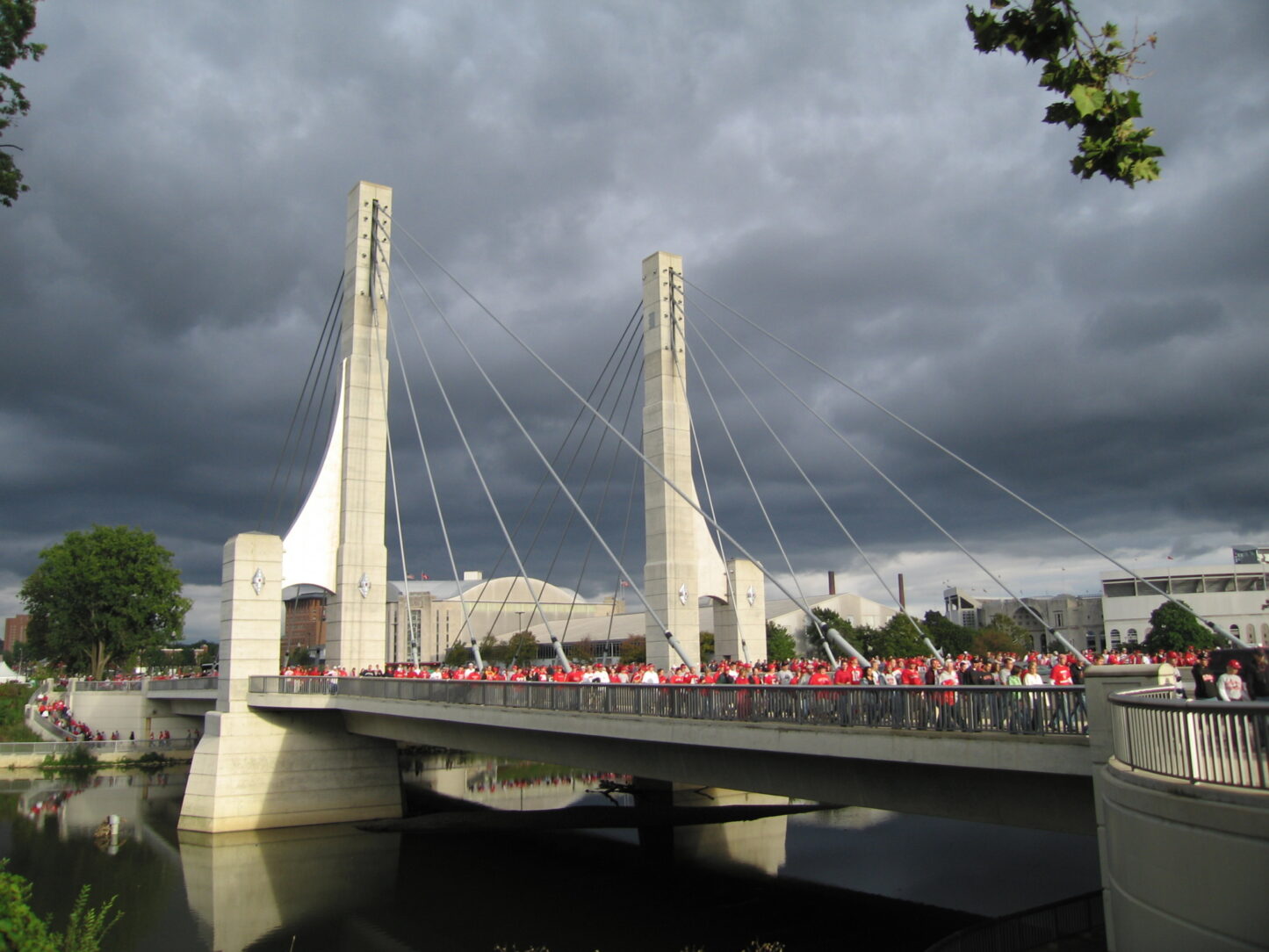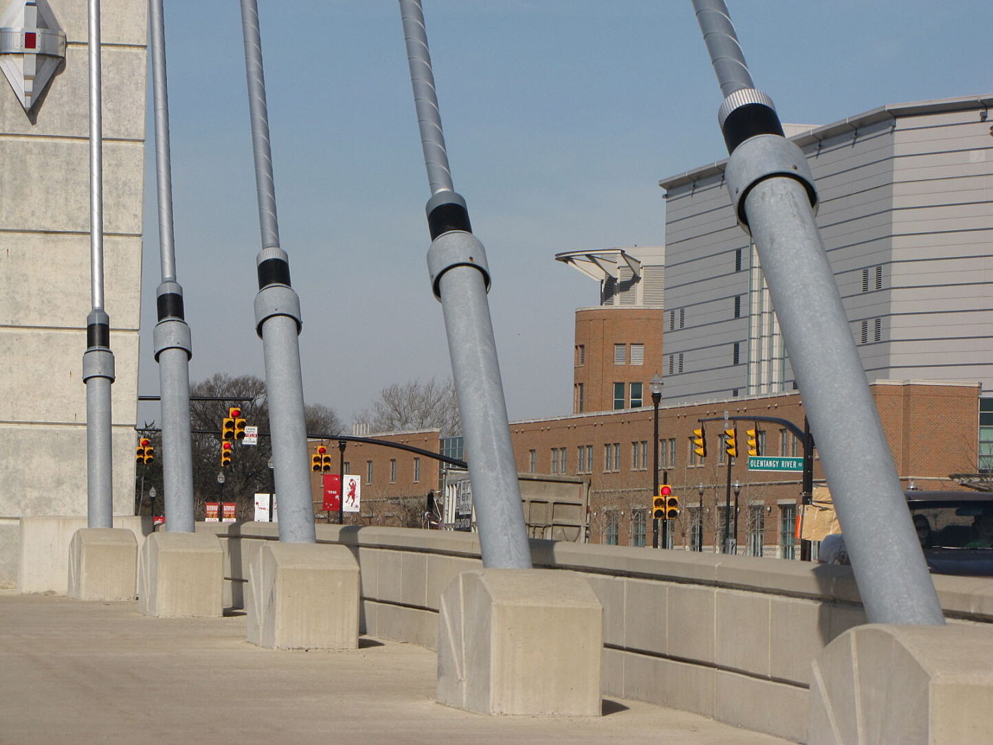 With its unique blend of state-of-the-art engineering and architectural detail, the Lane Avenue Bridge provides a dramatic gateway to the main campus of The Ohio State University in Columbus, Ohio. The bridge, which spans the Olentangy River, began construction in 2002 and opened in November 2003. The cable-stayed structure replaced a crumbling and obsolete concrete arch bridge built in 1919.