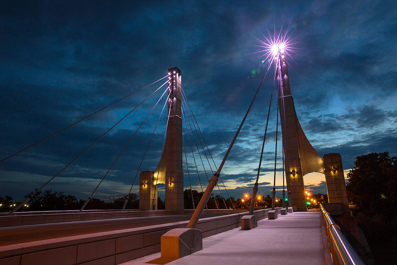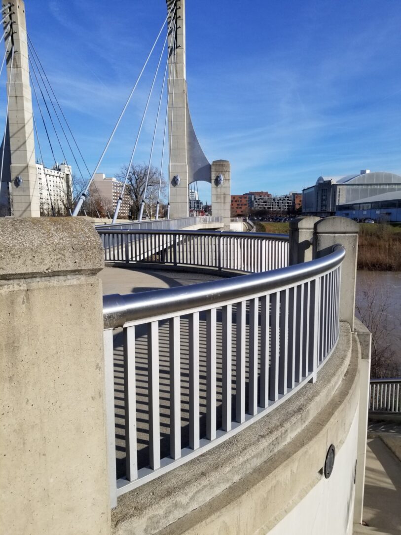 The bridge has stood the test of time for nearly twenty years, in part thanks to the choice to hot-dip galvanize all of the steel components on the project. The primary structure includes 22-ton galvanized steel anchor boxes that hold up the concrete towers of the cable stay design. The 88’ foot long floor beams are all hot-dip galvanized going across the width of the bridge. On the top side, the cables, cable casing, and all the heavy-duty ornamental rails are galvanized for maximum protection in the harsh Midwest climate.