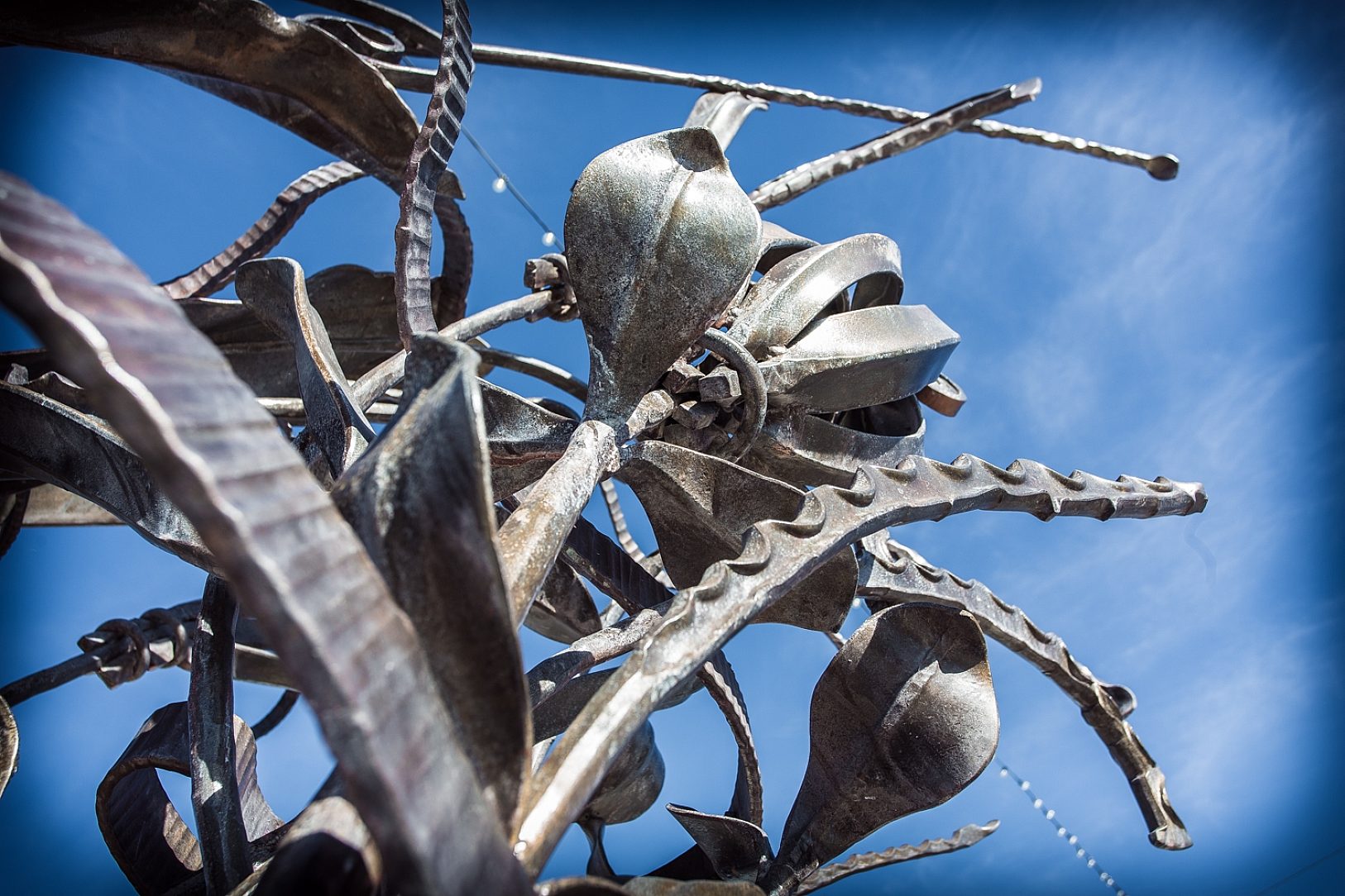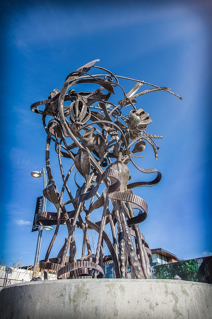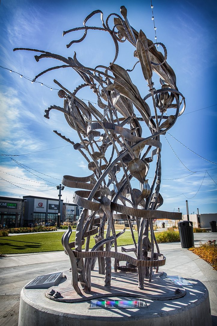 The Lanny White Memorial was designed by both the architectural team from Harvard Developments and Cameron Developments alongside Hammer and Forge. Many versions were conceptualized, but after over 100 hrs of design, the sculpture you see today was brought to life. The piece is forged out of 2” pipe and heavy flat bar that was flattened and squished to create the flower and ribbon looks. Kyle Walton dedicated a continuous two months to this project to ensure it was unveiled just as everyone had envisioned. As this piece was being built behind the scenes unbeknownst to the White family, the teams goal was to communicate Lanny White’s passion and generosity through the sculpture.