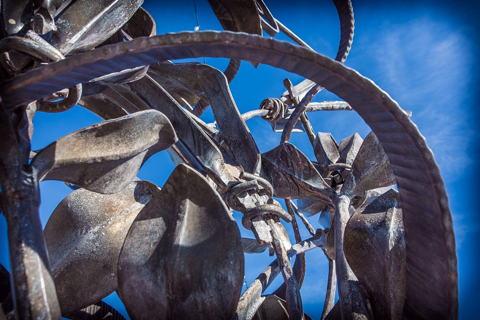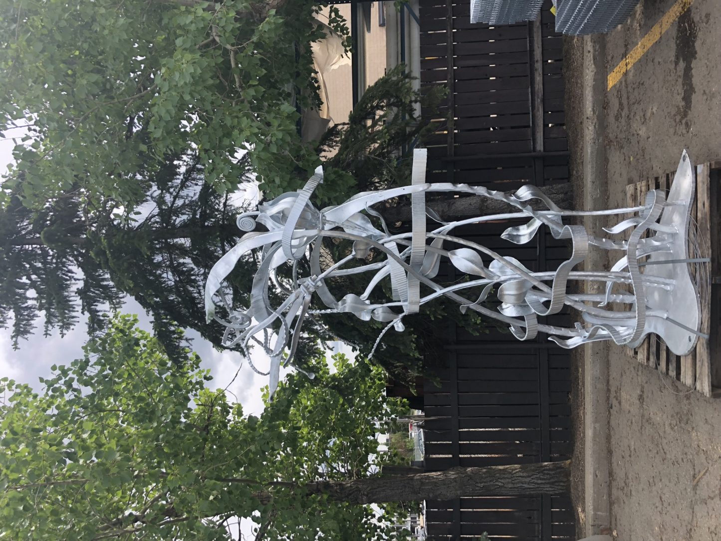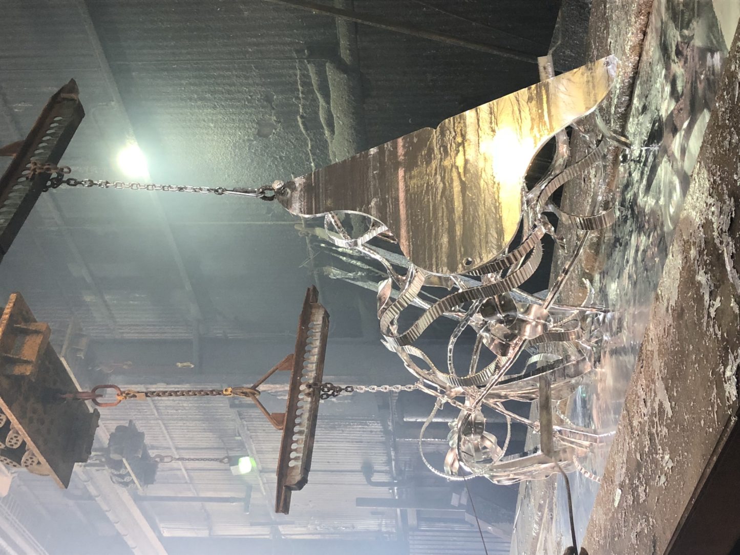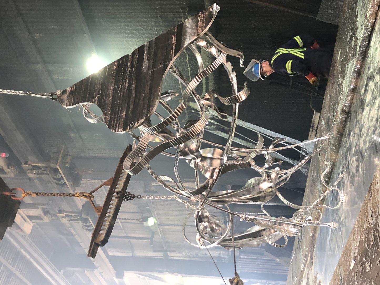 Once complete, Hammer and Forge brought the piece to be galvanized. Due to the kettle size, it had to be fabricated in two sections that were then bolted together on site. Because of the complexity of the piece, galvanizing it without catching any of the ribbons on the side of the kettle, alongside ensuring large deposits of zinc and ash were not left on it proved to be a challenge. Each piece had to be re-rigged a couple of times to secure the correct angle, and it was lowered into the kettle at a much slower rate than normal, which could be accommodated without concern of warping due to the thickness of the steel. To finish the look, the piece was sent back to Hammer and Forge where Kyle burnished the edges and sanded the structure. He then applied a cleaner from Scuplt Nouveau followed by a black patina that created the deep brown color you see today. The final step was to apply a metal wax over the entire sculpture to protect the patina look.