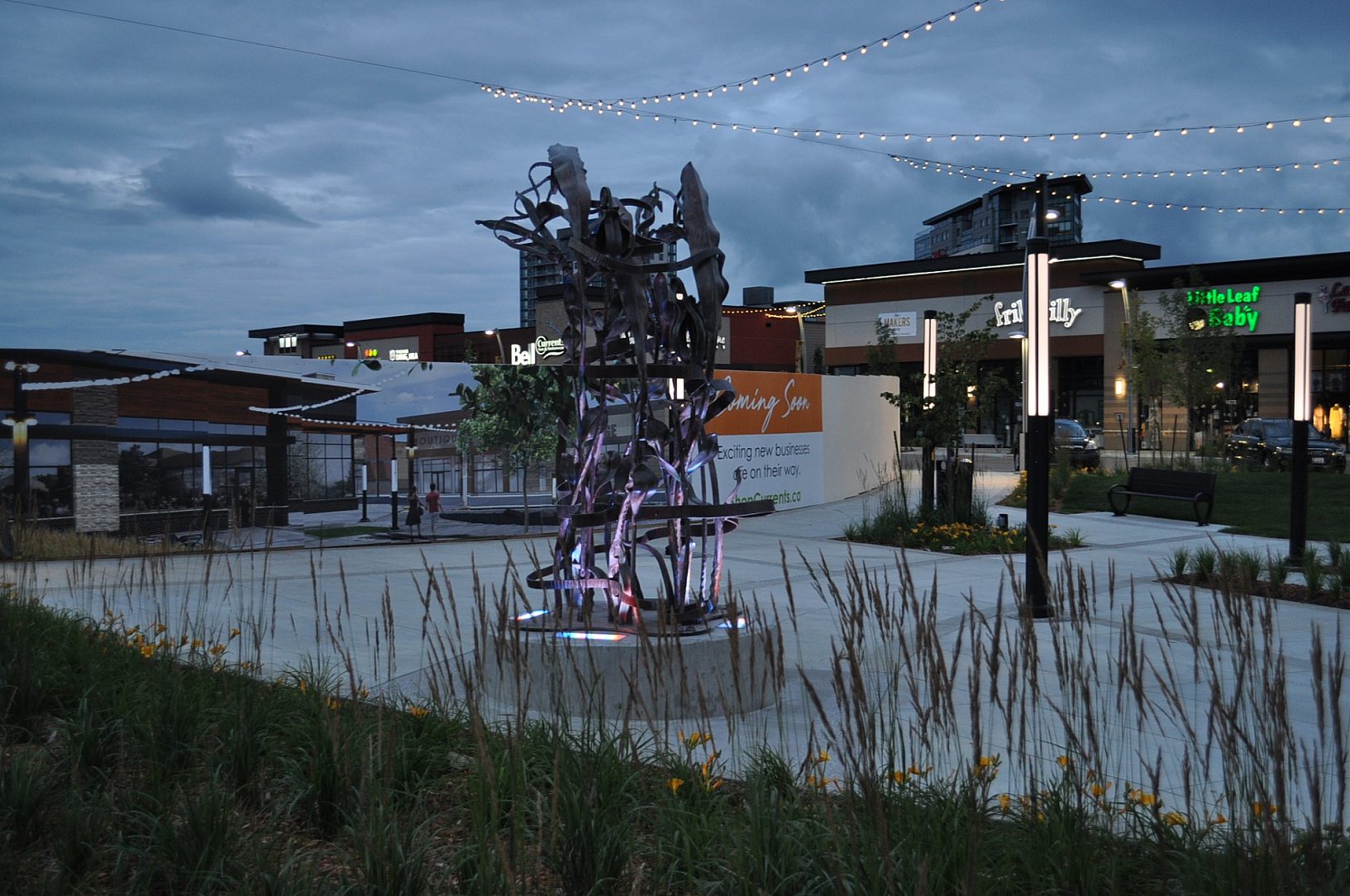 The Currents of Windermere was one of the first projects in Canada to be approved by city council that is a hybrid of small shopping streets surrounded by large box stores. Forty per cent of the space is inside walk-able area that has narrower grid streets and a central “urban village” available for restaurant patios, festivals, fountains, or ice sculptures and a skating rink. At the heart of this urban village stands a memorial to the development manager for Harvard Developments, Lanny White.