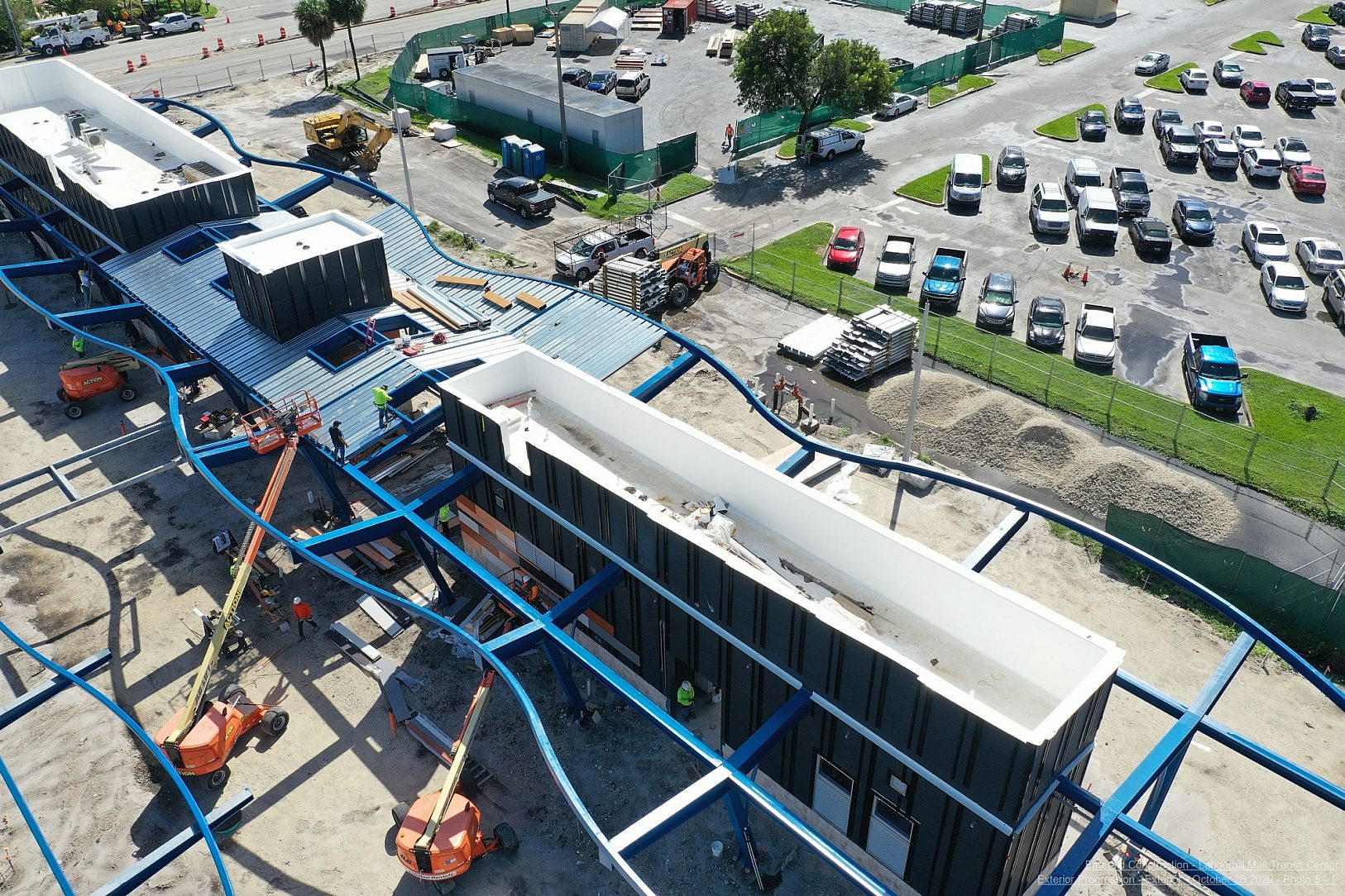 The two platform areas are covered with a flat roof to protect passengers from the elements. The canopy along State Road 7 (US 441) is an entrance feature providing a gathering space for those waiting to purchase bus passes. The west end of the parcel, opposite the mall entrance, has a separate, covered drop-off area. Two canopies will hold a solar array to help power a portion of the transit center.