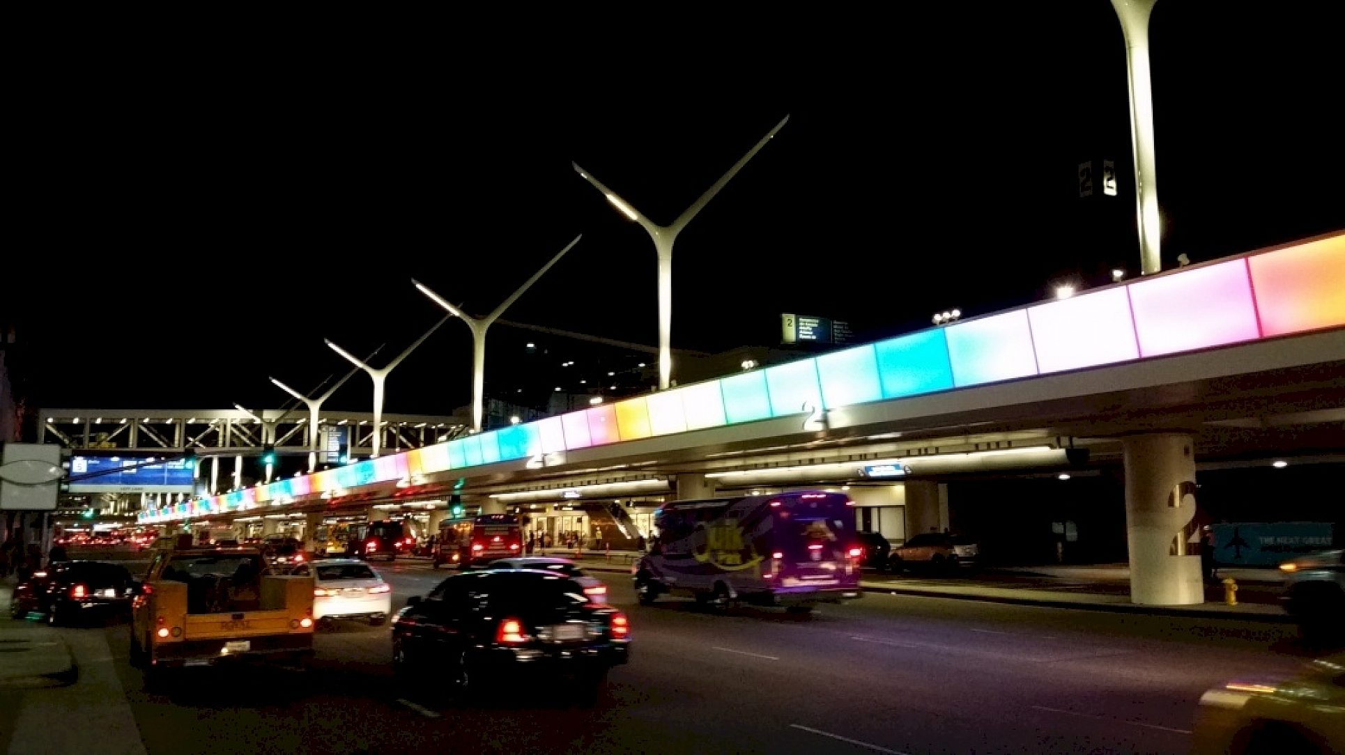 From an aesthetic standpoint this is meant to give the airport a much needed infusion of color and energy that warmly welcomes travelers and visitors to this glamourous international destination. The light ribbons color display has been synced to the 26 gateway light pylons and extends through the entire length of the horseshoe shaped curb between terminals 1 and 7 giving the airport a unified sense of cohesion from the airports entrance to exit. The synced lighting system is designed to feature color shifts that mimics waves in a very subtle and understated pattern and is directly programmed into the base subroutine of the advanced DMX control system. It works as a broad-based ocean metaphor that was chosen primarily because the airport is located directly on ocean front property.
