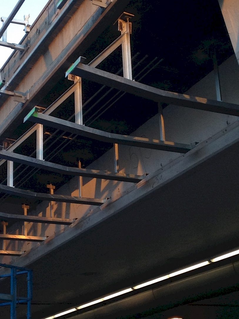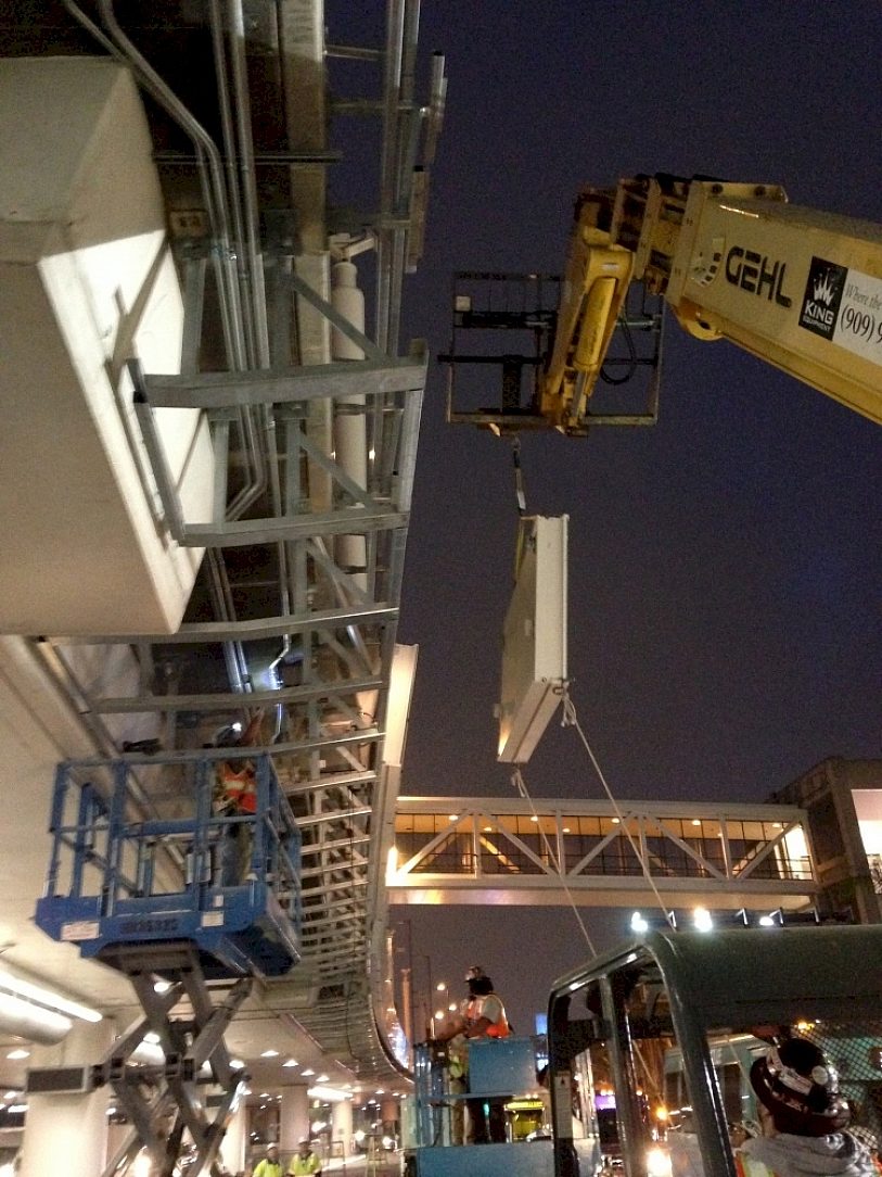 The underlying support framing of the 3 mile long light ribbon is made of (offset) formed channel and tube steel frames, fabricated tube steel assemblies, bent plate bracing and wall mount brackets that have all been hot-dip galvanized to protect the steel from environmental corrosion due to the high concentration of sea salt in the air. The material was also specified to be hot-dip galvanized because they wanted a maintenance free patina assuring that the only scheduled upkeep would be replacing LEDs every 10 years or so, because doing any maintenance repairs at the airport can become an arduous endeavor due to the sheer number of people that maintenance workers have to safely work and navigate around each day, so less maintenance is always at the forefront of thinking and design in regards to any expansion or renovation projects at LAX.