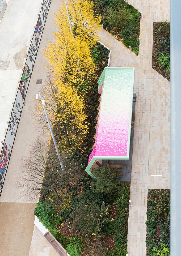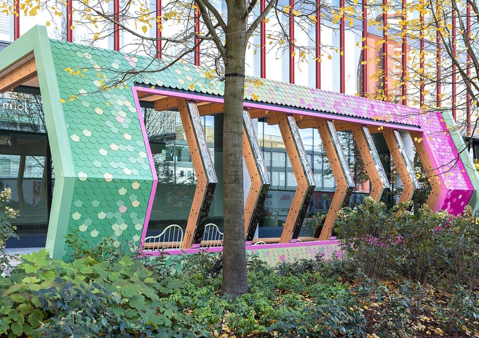 Powder-coated aluminium shingles cover the exterior in a bright and colourful pattern blending from vivid pink to pastel green, creating a sculptural shelter from every view point. The vibrant colour scheme is continued in the bespoke, galvanized and powder-coated steel work of the fixed furniture inside, with durable hardwood seating and a long communal table.