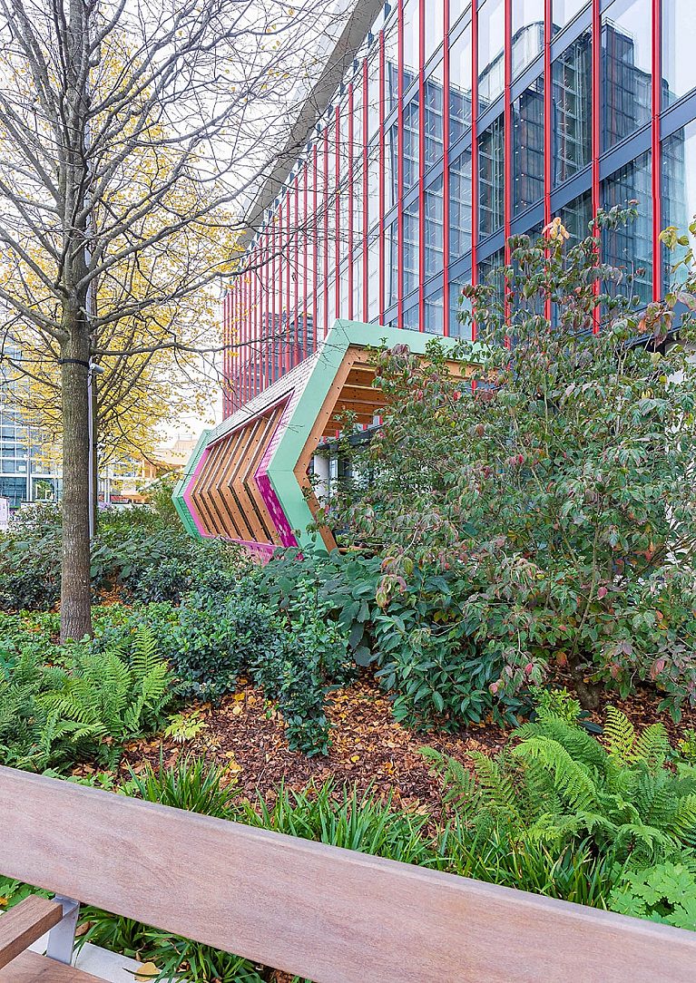 The Living Room structure is the first to be delivered and sits opposite the new British Council and Cancer Research UK offices. In this structure the house is turned on its side, forming a sheltered pitched canopy with tiered seating. The cladding is formed of glossy metal shingles which create a colourful gradient from leaf green to magenta, responding to the hues of the surrounding planting. This was achieved through close collaboration with the landscape consultant to ensure that the colours and form of the pavilion were developed in conjunction with the landscaping. Internally the pavilion is clad in perforated colour ppc metal panels which conceal light fittings behind so that, at night the whole structure glows in the landscape with a a pixelated quality.