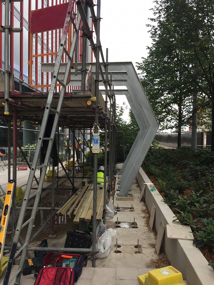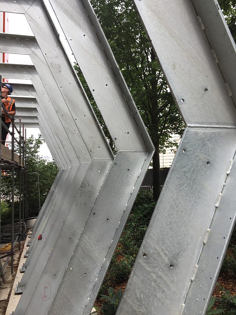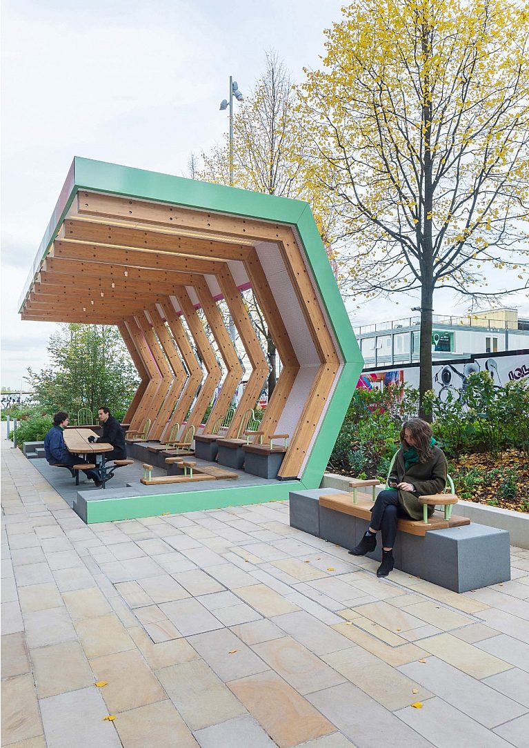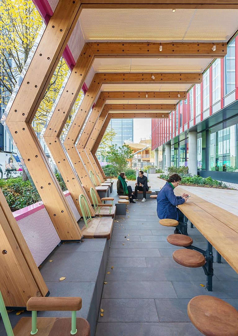 The galvanized steel cantilever structure, clad in glue-laminated larch timber, is repeated through nine bays, supporting a canopy roof which wraps around one side of the structure. At the centre of the Living Room is a 7 m collaborative timber table with swing out stools that playfully invite a range of uses from nearby of office workers and the public. Surrounding the table are stepped pre-cast concrete plinths with ‘upholstered’ timber seat pads and traditional spindle back and arm rests in colourful metal.