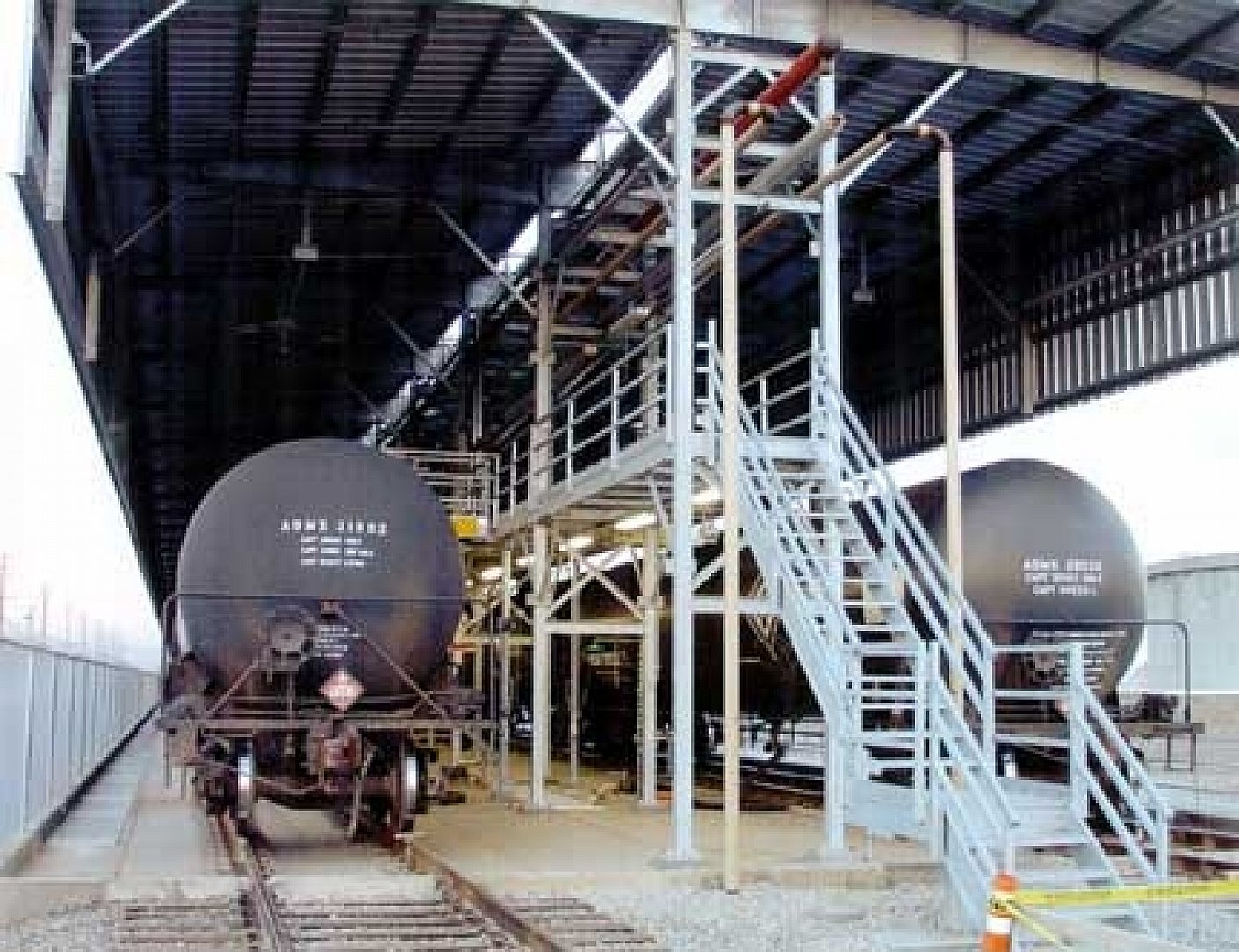 "Reliable" and "maintenance-free" were the buzzwords associated with this project and used often by Goldline, which specifies hot-dip galvanized steel on all of its projects. Over 200 tons of galvanized tubular column frames, platform bridges, grating, ladders, stairs, and canopy rafters were used on the 1,000-foot-long facility. Canopy rafters were designed with splices at the apex in order to avoid progressive dipping. Located in a harsh industrial environment of corrosive chemical emissions, mist, and fumes from refineries and train exhaust, the facility was designed for around-the-clock operations.