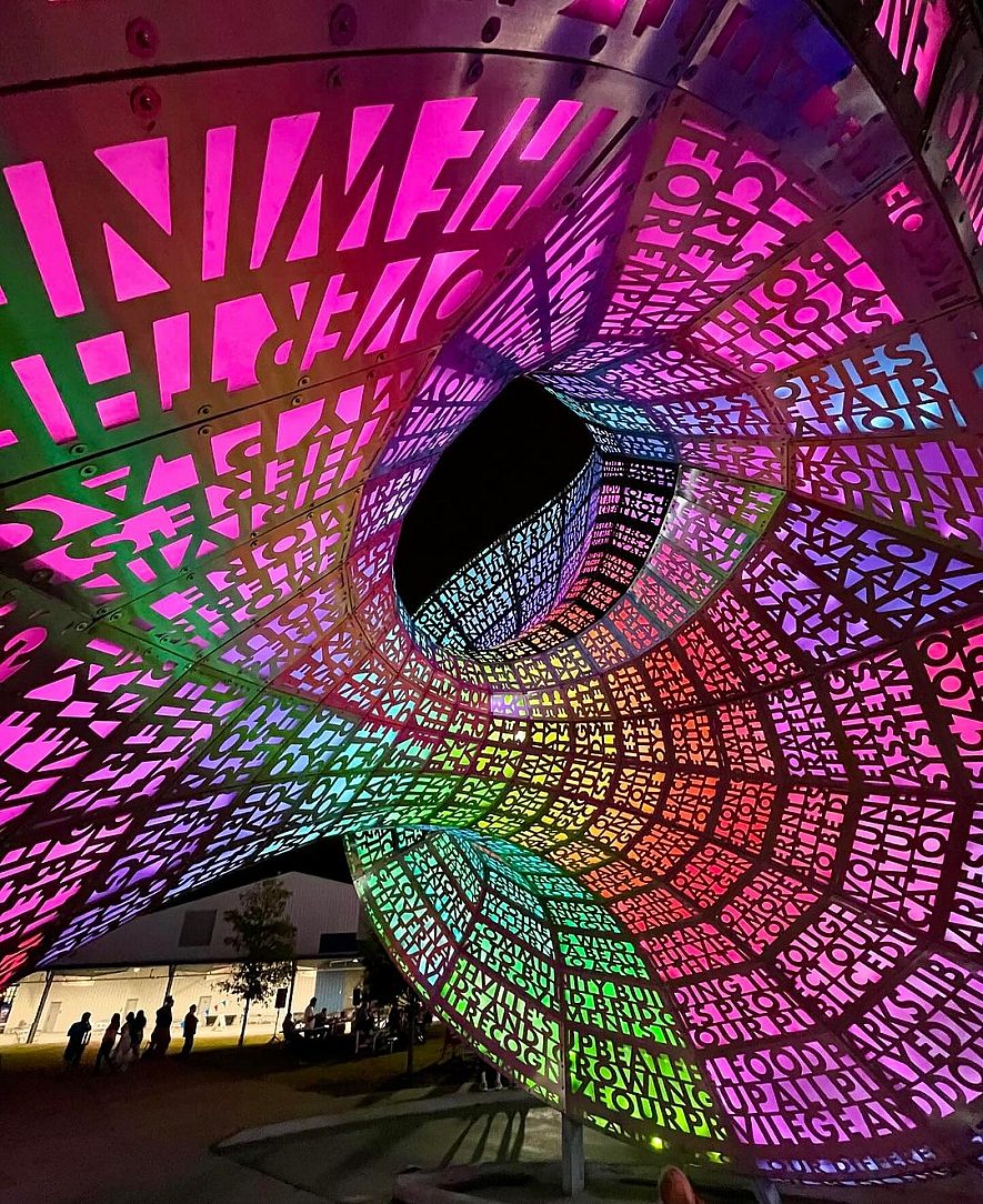 Loqui stands as a striking 32-foot sculpture, permanently stationed at the heart of Nashville’s Fairgrounds. Commissioned as a landmark for the space, it serves as both a central focal point for visitors and a symbol of immediate recognition for locals. The statue’s surface is adorned with 415 carefully chosen phrases, contributed by Nashville residents themselves, reflecting the essence of what makes the city home and sharing collective hopes for its bright future.